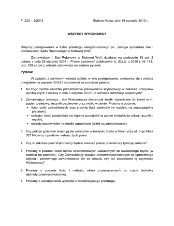 F. 223 – 1/2013 Stalowa Wola, dnia 18 stycznia 2013 r. WSZYSCY WYKONAWCY Dotyczy: postępowania w trybie przetargu nieograniczonego pn. „Usługa sprzątania biur i pomieszczeń Sądu Rejonowego w Stalowej Woli”. Zamawiający – Sąd Rejonowy w Stalowej Woli, działając na podstawie 38 ust. 2 ustawy z dnia 29 stycznia 2004 r. Prawo zamówień publicznych tj. (Dz.U. z 2010 r. Nr 113, poz. 759 ze zm.), udziela odpowiedzi na zadane pytania: Pytania: W związku z zamiarem wzięcia udziału w w/w postępowaniu, zwracamy się z prośbą o wyjaśnienia zapisów SIWZ i odpowiedzi na poniższe pytania: 1. Do kogo będzie należało przeszkolenie pracowników Wykonawcy w zakresie przepisów wynikających z ustawy z dnia 5 sierpnia 2010 r. o ochronie informacji niejawnych? 2. Zamawiający wymaga , aby Wykonawcza dostarczał środki higieniczne do toalet m.in. papier toaletowy, ręczniki papierowe oraz mydło w płynie. Prosimy o podanie: ilości osób zatrudnionych oraz średnią ilość petentów (w rozbiciu na poszczególne placówki), rodzaju i ilości podajników na higienę (podajniki na papier (mała/duża rolka), ręczniki i mydło), rodzaju dozowników na środki zapachowe (jeżeli są zamontowane). 3. Czy pokoje gościnne znajdują się wyłącznie w budynku Sądu w Nisku przy ul. 3-go Maja 32? Prosimy o podanie metrażu tych pokoi. 4. Czy w zakresie prac Wykonawcy będzie również pranie pościeli czy tylko jej zmiana? 5. Prosimy o podanie ilości opraw oświetleniowych wskazanych do kwartalnego mycia (w rozbiciu na placówki). Czy Zamawiający wskaże konserwatora/elektryka do uprzedniego zdjęcia i ponownego zamontowania ich po umyciu czy też pozostawia tę czynności Wykonawcy? 6. Prosimy o podanie ilości i metrażu okien przeznaczonych do mycia techniką alpinistyczną/wysokościową. 7. Prosimy o udostępnienie wyników z wcześniejszego przetargu. Odpowiedzi: 1. Przeszkolenie pracowników Wykonawcy w zakresie przepisów wynikających z ustawy z dnia 5 sierpnia 2010 r. o ochronie informacji niejawnych (Dz. U. z 2010 r. Nr 182, poz. 1228) będzie należało do Wykonawcy. 2. W poszczególnych obiektach Sądu Rejonowego w Stalowej Woli pracuje następująca ilość pracowników: w obiekcie przy ul. 3 – go Maja 32 w Nisku: 32 osoby; w obiekcie przy Placu Wolności 12 w Nisku: 48 osób; w obiekcie przy ul. ks. Jerzego Popiełuszki 16 w Stalowej Woli: 98 osób. Zamawiający nie jest w stanie określić Ilości petentów, ponieważ nie jest prowadzona tego rodzaju ewidencja. Zamawiający informuje, iż w obiektach Sądu Rejonowego w Stalowej Woli są następujące rodzaje i ilości podajników na papier, ręczniki i mydło: w obiekcie przy ul. 3 – go Maja 32 w Nisku: podajnik „duża rolka” na papier toaletowy – 4 szt., podajniki na ręczniki typu „rolka” – 2 szt., podajniki na mydło 4 szt. (poj. 1 l.); w obiekcie przy Placu Wolności 14 w Nisku: podajniki „duża rolka” na papier toaletowy – 7 szt., podajniki na ręczniki – brak, podajniki na mydło – 4 szt. (poj. 1 l.); w obiekcie przy ul. ks. Jerzego Popiełuszki 16 w Stalowej Woli: podajniki „duża rolka” na papier toaletowy – 33 szt., podajniki na ręczniki typu „Z” – 28 szt., podajniki na mydło – 28 szt. (1 l.). Zamawiający informuje, iż w żadnym z obiektów nie ma zamontowanych dozowników na środki zapachowe. 3. Pokoje gościnne znajdują się wyłącznie w budynku Sądu Rejonowego przy ul. ks. Jerzego Popiełuszki 16. Metraż 2 pokoi wynosi: 20,40 m2 + 19,40 m2, łącznie: 39,80 m2. 4. W zakresie prac Wykonawcy będzie tylko zmiana pościeli. 5. W poszczególnych obiektach Sądu Rejonowego w Stalowej Woli pracuje następująca ilość opraw oświetleniowych: w obiekcie przy ul. 3 – go Maja 32 w Nisku: 60 szt.; w obiekcie przy Placu Wolności 12 w Nisku: 176 szt.; w obiekcie przy ul. ks. Jerzego Popiełuszki 16 w Stalowej Woli: 660 szt. Zmawiający nie wskaże konserwatora/elektryka do zdjęcia i ponownego zamontowania opraw oświetleniowych po umyciu. W razie zaistnienia takiej potrzeby, pozostawia tę czynność Wykonawcy, po uprzednim zgłoszeniu konieczności wykonywani w/w czynności Zamawiającemu. 6. Okna do mycia techniką alpinistyczną znajdują się w Sądzie Rejonowym w Stalowej Woli przy ul. ks. Jerzego Popiełuszki 16 – powierzchnia okien (jednostronna) wynosi 314m2, ilość – 170 szt. 7. Zamawiający załącza w formie pliku PDF, protokół z postępowania o udzielenie zamówienia o numerze referencyjnym F.226 – 2/2012