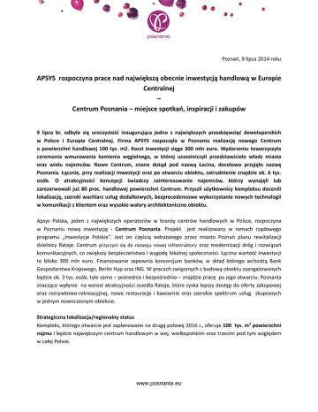 Poznań, 9 lipca 2014 roku APSYS rozpoczyna prace nad największą obecnie inwestycją handlową w Europie Centralnej – Centrum Posnania – miejsce spotkań, inspiracji i zakupów 9 lipca br. odbyła się uroczystość inaugurująca jedno z największych przedsięwzięć deweloperskich w Polsce i Europie Centralnej. Firma APSYS rozpoczęła w Poznaniu realizację nowego Centrum o powierzchni handlowej 100 tys. m2. Koszt inwestycji sięga 300 mln euro. Wydarzeniu towarzyszyła ceremonia wmurowania kamienia węgielnego, w której uczestniczyli przedstawiciele władz miasta oraz wielu najemców. Nowe Centrum, znane dotąd pod nazwą Łacina, docelowo przyjęło nazwę Posnania. Łącznie, przy realizacji inwestycji oraz po otwarciu obiektu, zatrudnienie znajdzie ok. 6 tys. osób. O atrakcyjności koncepcji świadczy zainteresowanie najemców, którzy wynajęli lub zarezerwowali już 80 proc. handlowej powierzchni Centrum. Przyszli użytkownicy kompleksu docenili lokalizację, szeroki wachlarz usług dodatkowych, bezprecedensowe wykorzystanie nowych technologii w komunikacji z klientem oraz wysokie walory architektoniczne obiektu. Apsys Polska, jeden z największych operatorów w branży centrów handlowych w Polsce, rozpoczyna w Poznaniu nową inwestycję - Centrum Posnania. Projekt jest realizowany w ramach rządowego programu „Inwestycje Polskie”. Jest on częścią wdrażanego przez miasto Poznań planu rewitalizacji dzielnicy Rataje. Centrum przyczyni się do rozwoju nowej infrastruktury oraz modernizacji dróg i rozwiązań komunikacyjnych, co zwiększy bezpieczeństwo i wygodę lokalnej społeczności. Łączna wartość inwestycji to blisko 300 mln euro. Finansowanie zapewnia konsorcjum banków, w skład którego wchodzą Bank Gospodarstwa Krajowego, Berlin Hyp oraz ING. W pracach związanych z budową obiektu zaangażowanych będzie ok. 3 tys. osób, tyle samo – pośrednio i bezpośrednio – znajdzie pracę po jego otwarciu. Posnania znacząco wpłynie na wzrost atrakcyjności osiedla Rataje, które zyska lepszy dostęp do oferty zakupowej oraz rozrywkowo-rekreacyjnej, nowe restauracje i kawiarnie oraz szerokie spektrum usług skupionych w jednym nowoczesnym obiekcie. Strategiczna lokalizacja/regionalny status Kompleks, którego otwarcie jest zaplanowane na drugą połowę 2016 r., oferuje 100 tys. m2 powierzchni najmu i będzie największym centrum handlowym w woj. wielkopolskim oraz trzecim pod tym względem w całej Polsce. www.posnania.eu Poznań jest 5. pod względem liczby mieszkańców polskim miastem, w czołówce pod względem siły nabywczej. W zasięgu Centrum jest prawie 1 mln mieszkańców Wielkopolski. Poznań to miasto o europejskich ambicjach i potencjale pozwalającym wypełnić przestrzeń pomiędzy Warszawą a Berlinem. Tak, ten wybór był dla nas naturalny – mówi Fabrice Bansay, Prezes APSYS Polska. Ze względu na wielkość i zróżnicowanie oferty – około 300 najemców – klienci będą mogli zaspokoić swoje indywidualne oczekiwania, gusta i smaki. Pod jednym dachem znajdzie się 40 wielko i średnio powierzchniowych sklepów, 220 butików, 40 restauracji oraz kawiarni. Na gości będzie czekało 3 300 miejsc parkingowych. Komercjalizacja obiektu przekroczyła już 80 proc. Odwiedzający będą mogli zrobić zakupy m.in. w Carrefour czy Lerroy Merlin, „zrelaksować się” w Multikinie lub „zadbać o kondycję” w Pure Jatomi Fitness Platinium. Przyjemność obcowania z modą i możliwość śledzenia trendów zapewnią dziesiątki butików. W Centrum będą obecne wszystkie marki takich grup, jak hiszpański Inditex (Zara, Bershka, Pull&Bear, Massimo Dutti, Zara Home, Stradivarius i Oysho) czy polska grupa LPP (Reserved, Mohito, Cropp Town, House, Sinsay), ale też m.in. Van Graaf, H&M, C&A czy Mango. Korzystając z niezwykłych walorów architektonicznych obiektu oraz możliwości atrakcyjnej ekspozycji marki, część firm zdecydowała właśnie w tym centrum stworzyć swoje „flagowe” koncepty. Unikalna architektura Centrum Posnania zostało zaprojektowane przez RTKL, światowej klasy architektów znanych z realizacji takich projektów jak Metropolis w Moskwie czy Westfield w San Francisco. Posnania wyróżniać się będzie m.in. przeszkloną fasadą, przestronnymi wnętrzami (Forum, Rotunda, Boulevard) oraz dotąd niespotykanymi w Polsce witrynami sklepowymi o podwójnej wysokości sięgającej 8 metrów. Na zewnątrz kompleksu znajdą się tarasy, ogród zimowy, fontanny i pasaże. Tworzy to szczególnie korzystny klimat dla nowatorskich konceptów gastronomicznych. Posnania będzie obiektem wybudowanym i zarządzanym ekologicznie – przy użyciu energooszczędnych materiałów, systemów zarządzania odpadami oraz redukcji emisji zanieczyszczeń, co pozwoli spełnić normy certyfikatu BREEAM z oceną „bardzo dobry”. Planowana zieleń dookoła i liczne ścieżki oraz udogodnienia dla rowerzystów tworzą z Posnanii miejsce przyjazne i integrujące. Era nowych technologii – indywidualizacja i wygoda Centrum Posnania oferuje nie tylko szeroki wachlarz marek, to także unikalne miejsce spotkań „na żywo” i online, miejsce rozrywki, swobodnej ekspresji własnych potrzeb i fantazji, inspiracji i kreowania nowych trendów, wreszcie miejsce towarzyskiego lub rodzinnego spędzania wolnego czasu. Stąd tak liczne w Centrum miejsca aktywizujące i integrujące lokalną społeczność - amfiteatr pomyślany by gościć liczne wydarzenia kulturalno-rozrywkowe, place do organizacji pokazów, eventów i happeningów czy wreszcie gigantyczna ściana służąca użytkownikom mediów społecznościowych. Klienci otrzymają do dyspozycji darmową sieć WiFi dostępną w całym centrum z możliwością geolokalizacji danego sklepu lub samochodu na parkingu, cyfrowe mapy, możliwość płatności mobilnych, www.posnania.eu dedykowaną aplikację oraz specjalny portal umożliwiający bliską współpracę centrum z najemcami w celu zape