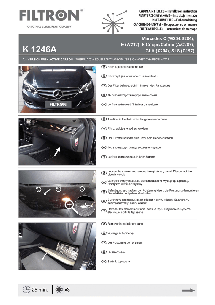 Mercedes C (W204/S204), E (W212), E Coupe/Cabrio (A/C207), GLK (X204), SLS (C197) K 1246A A – VERSION WITH ACTIVE CARBON / WERSJA Z WĘGLEM AKTYWNYM/ VERSION AVEC CHARBON ACTIF Filter is placed inside the car Filtr znajduje się we wnętrzu samochodu Der Filter befindet sich im Inneren des Fahrzeuges Фильтр находится внутри автомобиля Le filtre se trouve à l’intérieur du véhicule The filter is located under the glove compartment Filtr znajduje się pod schowkiem. Der Filterteil befindet sich unter dem Handschuhfach Фильтр находится под вещевым ящиком Le filtre se trouve sous la boîte à gants Loosen the screws and remove the upholstery panel. Disconnect the electric circuit Odkręcić wkręty mocujące element tapicerki, wyciągnąć tapicerkę. Rozłączyć układ elektryczny Befestigungsschrauben der Polsterung lösen, die Polsterung demontieren. Das elektrische System abschalten Выкрутить крепежный винт обивки и снять обивку. Выключить электросистему, снять обивку Dévisser les éléments du tapis, sortir le tapis. Disjoindre le systéme électrique, sortir la tapisserie Remove the upholstery panel Wyciągnąć tapicerkę Die Polsterung demontieren Снять обивку Sortir la tapisserie 25 min. x3 K 1246A Remove the protecting device.Move sideways the locks, which hold the cover of the filter chamber Usunąć element zabezpieczający. Przesunąć blokady zabezpieczające pokrywy komory filtra Das Schutzelement entfernen, die Filterverkleidung herausnehmen.Die den Deckel der Filterkammer befestigenden Verriegelungen verschieben Удалить предохранительный элемент.Передвинуть блокировку, защищающую крышку камеры фильтра Enlever l’élément de protection.Pousser les blocages qui protegent les couvercles de la chambre du filtre Gently remove the old filter, put in the new one and carry out the opposite to all the previously mentioned operations in the reversed order Ostrożnie usunąć zabrudzony filtr, następnie zamontować nowy oraz wykonać powyższe czynności w kolejności odwrotnej Das verschmutzte Filter vorsichtig entfernen, das neue einlegen und die oben genannten Arbeitsschritte in umgekehrter Reihenfolge durchführen Осторожно удалить загрязненный фильтр, затем вмонтировать новый и выполнить те же действия в обратной последовательности Enlever soigneusement le filtre usagé, en installer un nouveau et réaliser les opérations mentionnées ci-dessus dans l’ordre inverse