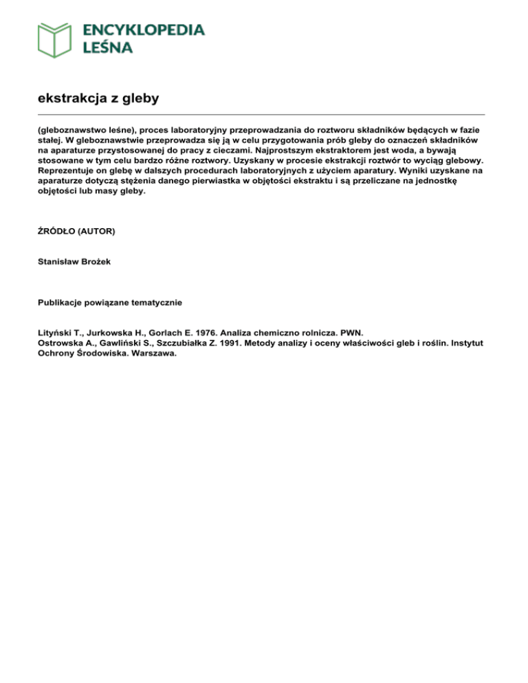ekstrakcja z gleby (gleboznawstwo leśne), proces laboratoryjny przeprowadzania do roztworu składników będących w fazie stałej. W gleboznawstwie przeprowadza się ją w celu przygotowania prób gleby do oznaczeń składników na aparaturze przystosowanej do pracy z cieczami. Najprostszym ekstraktorem jest woda, a bywają stosowane w tym celu bardzo różne roztwory. Uzyskany w procesie ekstrakcji roztwór to wyciąg glebowy. Reprezentuje on glebę w dalszych procedurach laboratoryjnych z użyciem aparatury. Wyniki uzyskane na aparaturze dotyczą stężenia danego pierwiastka w objętości ekstraktu i są przeliczane na jednostkę objętości lub masy gleby. ŹRÓDŁO (AUTOR) Stanisław Brożek Publikacje powiązane tematycznie Lityński T., Jurkowska H., Gorlach E. 1976. Analiza chemiczno rolnicza. PWN. Ostrowska A., Gawliński S., Szczubiałka Z. 1991. Metody analizy i oceny właściwości gleb i roślin. Instytut Ochrony Środowiska. Warszawa.