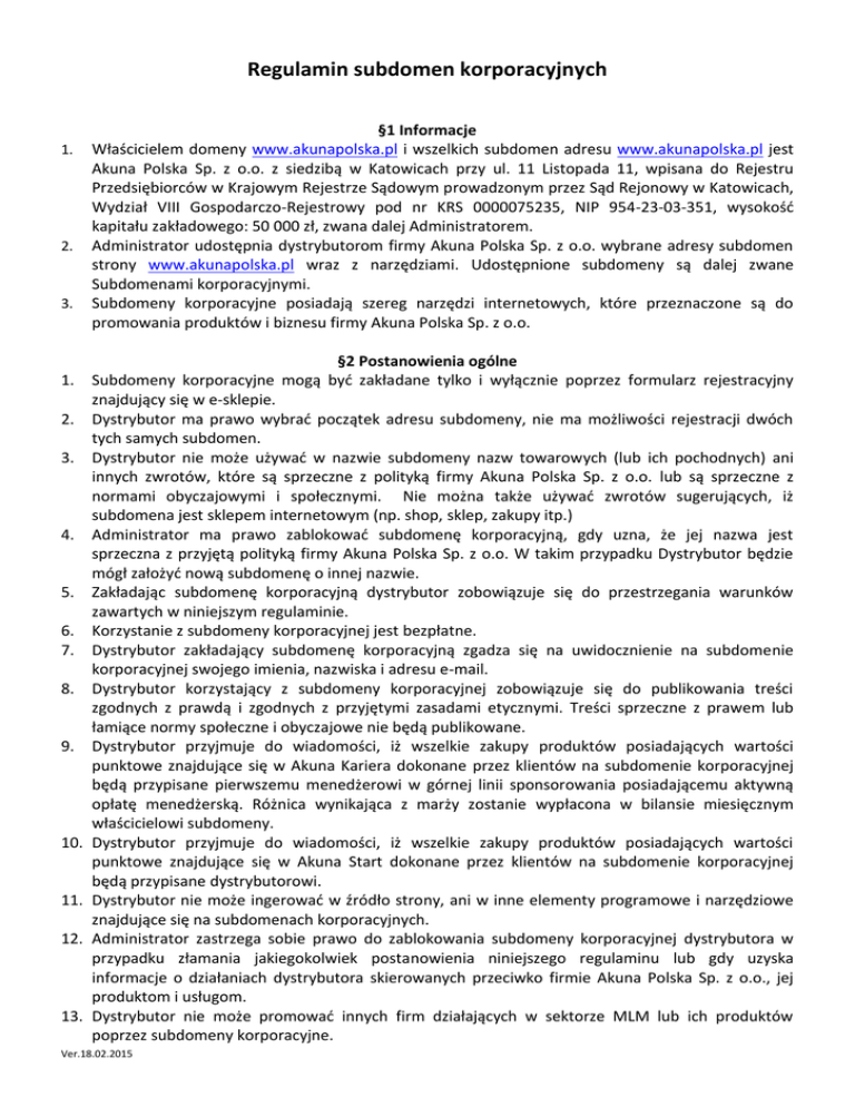 Regulamin subdomen korporacyjnych 1. 2. 3. 1. 2. 3. 4. 5. 6. 7. 8. 9. 10. 11. 12. 13. §1 Informacje Właścicielem domeny www.akunapolska.pl i wszelkich subdomen adresu www.akunapolska.pl jest Akuna Polska Sp. z o.o. z siedzibą w Katowicach przy ul. 11 Listopada 11, wpisana do Rejestru Przedsiębiorców w Krajowym Rejestrze Sądowym prowadzonym przez Sąd Rejonowy w Katowicach, Wydział VIII Gospodarczo-Rejestrowy pod nr KRS 0000075235, NIP 954-23-03-351, wysokośd kapitału zakładowego: 50 000 zł, zwana dalej Administratorem. Administrator udostępnia dystrybutorom firmy Akuna Polska Sp. z o.o. wybrane adresy subdomen strony www.akunapolska.pl wraz z narzędziami. Udostępnione subdomeny są dalej zwane Subdomenami korporacyjnymi. Subdomeny korporacyjne posiadają szereg narzędzi internetowych, które przeznaczone są do promowania produktów i biznesu firmy Akuna Polska Sp. z o.o. §2 Postanowienia ogólne Subdomeny korporacyjne mogą byd zakładane tylko i wyłącznie poprzez formularz rejestracyjny znajdujący się w e-sklepie. Dystrybutor ma prawo wybrad początek adresu subdomeny, nie ma możliwości rejestracji dwóch tych samych subdomen. Dystrybutor nie może używad w nazwie subdomeny nazw towarowych (lub ich pochodnych) ani innych zwrotów, które są sprzeczne z polityką firmy Akuna Polska Sp. z o.o. lub są sprzeczne z normami obyczajowymi i społecznymi. Nie można także używad zwrotów sugerujących, iż subdomena jest sklepem internetowym (np. shop, sklep, zakupy itp.) Administrator ma prawo zablokowad subdomenę korporacyjną, gdy uzna, że jej nazwa jest sprzeczna z przyjętą polityką firmy Akuna Polska Sp. z o.o. W takim przypadku Dystrybutor będzie mógł założyd nową subdomenę o innej nazwie. Zakładając subdomenę korporacyjną dystrybutor zobowiązuje się do przestrzegania warunków zawartych w niniejszym regulaminie. Korzystanie z subdomeny korporacyjnej jest bezpłatne. Dystrybutor zakładający subdomenę korporacyjną zgadza się na uwidocznienie na subdomenie korporacyjnej swojego imienia, nazwiska i adresu e-mail. Dystrybutor korzystający z subdomeny korporacyjnej zobowiązuje się do publikowania treści zgodnych z prawdą i zgodnych z przyjętymi zasadami etycznymi. Treści sprzeczne z prawem lub łamiące normy społeczne i obyczajowe nie będą publikowane. Dystrybutor przyjmuje do wiadomości, iż wszelkie zakupy produktów posiadających wartości punktowe znajdujące się w Akuna Kariera dokonane przez klientów na subdomenie korporacyjnej będą przypisane pierwszemu menedżerowi w górnej linii sponsorowania posiadającemu aktywną opłatę menedżerską. Różnica wynikająca z marży zostanie wypłacona w bilansie miesięcznym właścicielowi subdomeny. Dystrybutor przyjmuje do wiadomości, iż wszelkie zakupy produktów posiadających wartości punktowe znajdujące się w Akuna Start dokonane przez klientów na subdomenie korporacyjnej będą przypisane dystrybutorowi. Dystrybutor nie może ingerowad w źródło strony, ani w inne elementy programowe i narzędziowe znajdujące się na subdomenach korporacyjnych. Administrator zastrzega sobie prawo do zablokowania subdomeny korporacyjnej dystrybutora w przypadku złamania jakiegokolwiek postanowienia niniejszego regulaminu lub gdy uzyska informacje o działaniach dystrybutora skierowanych przeciwko firmie Akuna Polska Sp. z o.o., jej produktom i usługom. Dystrybutor nie może promowad innych firm działających w sektorze MLM lub ich produktów poprzez subdomeny korporacyjne. Ver.18.02.2015 14. Dystrybutor korzystający z subdomeny korporacyjnej zobowiązuje się do poinformowania Administratora o wszelkich nieprawidłowościach, jakie mogą pojawid się w działaniu subdomen korporacyjnych. 15. Administrator zablokuje i usunie subdomenę, jeśli w trzech kolejnych miesiącach nie zostaną dokonane żadne zakupy lub nie zostanie dokonana żadna nowa rejestracja on-line poprzez subdomenę. 1. 2. 3. 4. 5. 6. 7. §3 Postanowienia koocowe Administrator zastrzega sobie prawo do wprowadzania zmian na subdomenach korporacyjnych. Administrator podejmie wszelkie działania, aby zapewnid poprawne działanie subdomen korporacyjnych. Administrator nie ponosi odpowiedzialności za zakłócenia w działaniu subdomen korporacyjnych, które mogą byd spowodowane siłą wyższą (m.in. awarie lub zakłócenia pracy urządzeo dostarczających energię elektryczną, ciepło, światło, działania wojenne lub działania władz paostwowych lub samorządowych w zakresie formułowania polityki, praw i przepisów mających wpływ na wykonanie zobowiązao). Niniejszy regulamin dostępny jest w siedzibie Administratora i na stronie www.akuna.net. Administrator zastrzega sobie prawo do wprowadzania zmian w niniejszym regulaminie. Niniejszy regulamin wchodzi w życie z dniem jego publikacji na www.akuna.net. Ostateczna interpretacja niniejszego regulaminu należy wyłącznie do Organizatora. Ver.18.02.2015