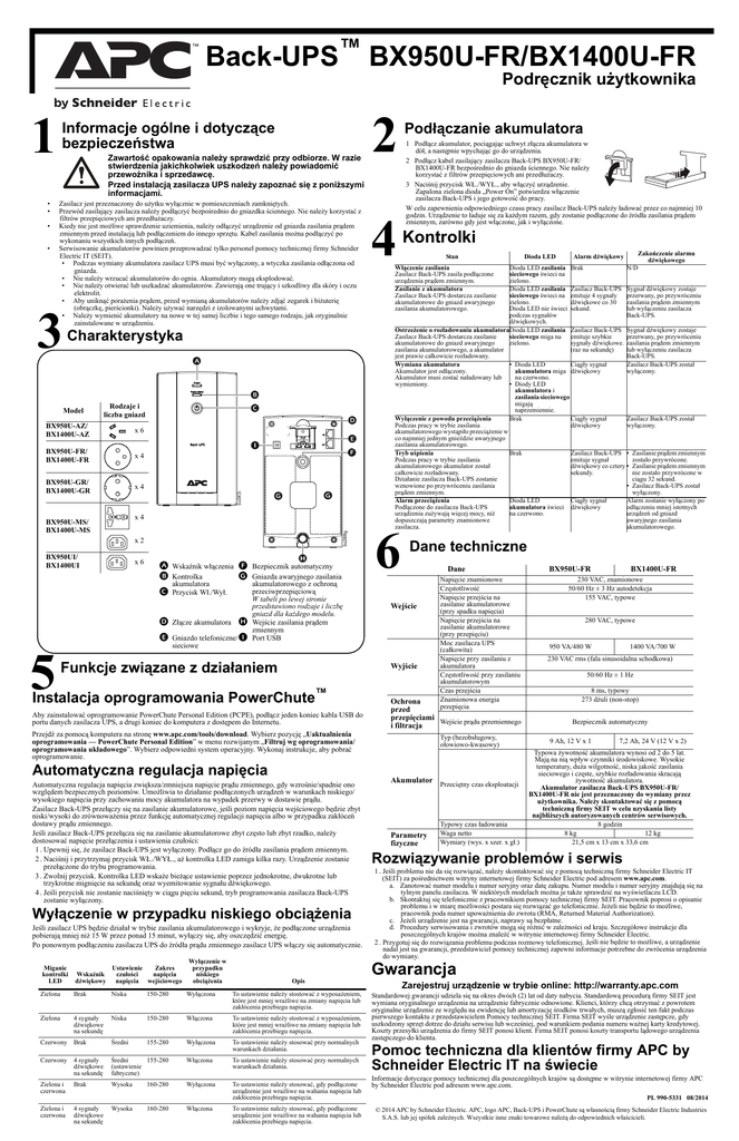 Back-UPS™ BX950U-FR/BX1400U-FR Podręcznik użytkownika 1 • • Zawartość opakowania należy sprawdzić przy odbiorze. W razie stwierdzenia jakichkolwiek uszkodzeń należy powiadomić przewoźnika i sprzedawcę. Przed instalacją zasilacza UPS należy zapoznać się z poniższymi informacjami. Zasilacz jest przeznaczony do użytku wyłącznie w pomieszczeniach zamkniętych. Przewód zasilający zasilacza należy podłączyć bezpośrednio do gniazdka ściennego. Nie należy korzystać z filtrów przepięciowych ani przedłużaczy. Kiedy nie jest możliwe sprawdzenie uziemienia, należy odłączyć urządzenie od gniazda zasilania prądem zmiennym przed instalacją lub podłączeniem do innego sprzętu. Kabel zasilania można podłączyć po wykonaniu wszystkich innych podłączeń. Serwisowanie akumulatorów powinien przeprowadzać tylko personel pomocy technicznej firmy Schneider Electric IT (SEIT). • Podczas wymiany akumulatora zasilacz UPS musi być wyłączony, a wtyczka zasilania odłączona od gniazda. • Nie należy wrzucać akumulatorów do ognia. Akumulatory mogą eksplodować. • Nie należy otwierać lub uszkadzać akumulatorów. Zawierają one trujący i szkodliwy dla skóry i oczu elektrolit. • Aby uniknąć porażenia prądem, przed wymianą akumulatorów należy zdjąć zegarek i biżuterię (obrączkę, pierścionki). Należy używać narzędzi z izolowanymi uchwytami. • Należy wymienić akumulatory na nowe w tej samej liczbie i tego samego rodzaju, jak oryginalnie zainstalowane w urządzeniu. 3 Charakterystyka Model Rodzaje i liczba gniazd x6 BX950U-FR/ BX1400U-FR x4 BX950U-GR/ BX1400U-GR x4 bu043i BX950U-AZ/ BX1400U-AZ x4 BX950U-MS/ BX1400U-MS bu388g • • Informacje ogólne i dotyczące bezpieczeństwa x2 BX950UI/ BX1400UI x6 Wskaźnik włączenia Bezpiecznik automatyczny Kontrolka Gniazda awaryjnego zasilania akumulatora Przycisk Wł./Wył. Złącze akumulatora Gniazdo telefoniczne/ 5 sieciowe akumulatorowego z ochroną przeciwprzepięciową W tabeli po lewej stronie przedstawiono rodzaje i liczbę gniazd dla każdego modelu. Wejście zasilania prądem zmiennym Port USB Funkcje związane z działaniem 2 Podłączanie akumulatora 4 Kontrolki 1 Podłącz akumulator, pociągając uchwyt złącza akumulatora w dół, a następnie wpychając go do urządzenia. 2 Podłącz kabel zasilający zasilacza Back-UPS BX950U-FR/ BX1400U-FR bezpośrednio do gniazda ściennego. Nie należy korzystać z filtrów przepięciowych ani przedłużaczy. 3 Naciśnij przycisk WŁ./WYŁ., aby włączyć urządzenie. Zapalona zielona dioda „Power On” potwierdza włączenie zasilacza Back-UPS i jego gotowość do pracy. W celu zapewnienia odpowiedniego czasu pracy zasilacz Back-UPS należy ładować przez co najmniej 10 godzin. Urządzenie to ładuje się za każdym razem, gdy zostanie podłączone do źródła zasilania prądem zmiennym, zarówno gdy jest włączone, jak i wyłączone. Stan Aby zainstalować oprogramowanie PowerChute Personal Edition (PCPE), podłącz jeden koniec kabla USB do portu danych zasilacza UPS, a drugi koniec do komputera z dostępem do Internetu. Dioda LED zasilania Brak N/D sieciowego świeci na zielono. Dioda LED zasilania Zasilacz Back-UPS Sygnał dźwiękowy zostaje sieciowego świeci na emituje 4 sygnały przerwany, po przywróceniu dźwiękowe co 30 zasilania prądem zmiennym zielono. lub wyłączeniu zasilacza Dioda LED nie świeci sekund. Back-UPS. podczas sygnałów dźwiękowych. Ostrzeżenie o rozładowaniu akumulatoraDioda LED zasilania Zasilacz Back-UPS Sygnał dźwiękowy zostaje Zasilacz Back-UPS dostarcza zasilanie sieciowego miga na emituje szybkie przerwany, po przywróceniu akumulatorowe do gniazd awaryjnego zielono. sygnały dźwiękowe. zasilania prądem zmiennym zasilania akumulatorowego, a akumulator (raz na sekundę) lub wyłączeniu zasilacza jest prawie całkowicie rozładowany. Back-UPS. Ciągły sygnał Zasilacz Back-UPS został Wymiana akumulatora • Dioda LED wyłączony. Akumulator jest odłączony. akumulatora miga dźwiękowy Akumulator musi zostać naładowany lub na czerwono. wymieniony. • Diody LED akumulatora i zasilania sieciowego migają naprzemiennie. Brak Ciągły sygnał Zasilacz Back-UPS został Wyłączenie z powodu przeciążenia dźwiękowy wyłączony. Podczas pracy w trybie zasilania akumulatorowego wystąpiło przeciążenie w co najmniej jednym gnieździe awaryjnego zasilania akumulatorowego. Tryb uśpienia Brak Zasilacz Back-UPS • Zasilanie prądem zmiennym Podczas pracy w trybie zasilania emituje sygnał zostało przywrócone. dźwiękowy co cztery • Zasilanie prądem zmiennym akumulatorowego akumulator został sekundy. nie zostało przywrócone w całkowicie rozładowany. ciągu 32 sekund. Działanie zasilacza Back-UPS zostanie • Zasilacz Back-UPS został wznowione po przywróceniu zasilania wyłączony. prądem zmiennym. Dioda LED Ciągły sygnał Alarm zostanie wyłączony po Alarm przeciążenia akumulatora świeci dźwiękowy odłączeniu mniej istotnych Podłączone do zasilacza Back-UPS na czerwono. urządzeń od gniazd urządzenia zużywają więcej mocy, niż awaryjnego zasilania dopuszczają parametry znamionowe akumulatorowego. zasilacza. 6 Dane techniczne Dane Wejście Automatyczna regulacja napięcia zwiększa/zmniejsza napięcie prądu zmiennego, gdy wzrośnie/spadnie ono względem bezpiecznych poziomów. Umożliwia to działanie podłączonych urządzeń w warunkach niskiego/ wysokiego napięcia przy zachowaniu mocy akumulatora na wypadek przerwy w dostawie prądu. Zasilacz Back-UPS przełączy się na zasilanie akumulatorowe, jeśli poziom napięcia wejściowego będzie zbyt niski/wysoki do zrównoważenia przez funkcję automatycznej regulacji napięcia albo w przypadku zakłóceń dostawy prądu zmiennego. Jeśli zasilacz Back-UPS przełącza się na zasilanie akumulatorowe zbyt często lub zbyt rzadko, należy dostosować napięcie przełączenia i ustawienia czułoś