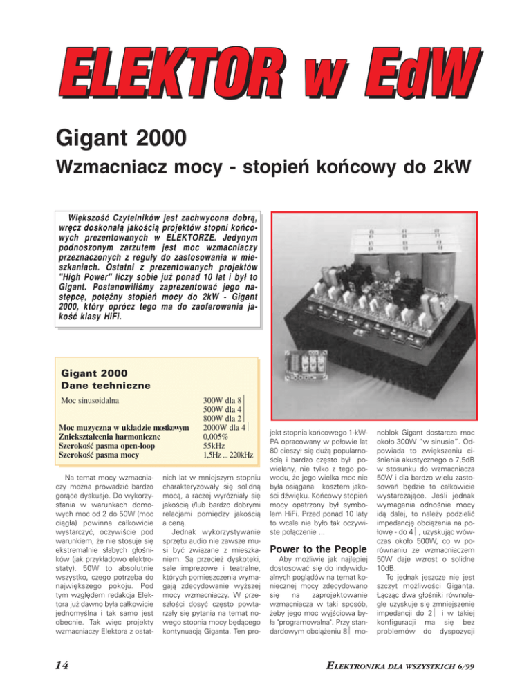 ELEKTOR w EdW Gigant 2000 Wzmacniacz mocy − stopień końcowy do 2kW Większość Czytelników jest zachwycona dobrą, wręcz doskonałą jakością projektów stopni końco− wych prezentowanych w ELEKTORZE. Jedynym podnoszonym zarzutem jest moc wzmacniaczy przeznaczonych z reguły do zastosowania w mie− szkaniach. Ostatni z prezentowanych projektów "High Power" liczy sobie już ponad 10 lat i był to Gigant. Postanowiliśmy zaprezentować jego na− stępcę, potężny stopień mocy do 2kW − Gigant 2000, który oprócz tego ma do zaoferowania ja− kość klasy HiFi. Gigant 2000 Dane techniczne Moc sinusoidalna Moc muzyczna w układzie mostkowym Zniekształcenia harmoniczne Szerokość pasma open−loop Szerokość pasma mocy Na temat mocy wzmacnia− czy można prowadzić bardzo gorące dyskusje. Do wykorzy− stania w warunkach domo− wych moc od 2 do 50W (moc ciągła) powinna całkowicie wystarczyć, oczywiście pod warunkiem, że nie stosuje się ekstremalnie słabych głośni− ków (jak przykładowo elektro− staty). 50W to absolutnie wszystko, czego potrzeba do największego pokoju. Pod tym względem redakcja Elek− tora już dawno była całkowicie jednomyślna i tak samo jest obecnie. Tak więc projekty wzmacniaczy Elektora z ostat− 14 300W dla 8Ω 500W dla 4Ω 800W dla 2Ω 2000W dla 4Ω 0,005% 55kHz 1,5Hz ... 220kHz nich lat w mniejszym stopniu charakteryzowały się solidną mocą, a raczej wyróżniały się jakością i/lub bardzo dobrymi relacjami pomiędzy jakością a ceną. Jednak wykorzystywanie sprzętu audio nie zawsze mu− si być związane z mieszka− niem. Są przecież dyskoteki, sale imprezowe i teatralne, których pomieszczenia wyma− gają zdecydowanie wyższej mocy wzmacniaczy. W prze− szłości dosyć często powta− rzały się pytania na temat no− wego stopnia mocy będącego kontynuacją Giganta. Ten pro− jekt stopnia końcowego 1−kW− PA opracowany w połowie lat 80 cieszył się dużą popularno− ścią i bardzo często był po− wielany, nie tylko z tego po− wodu, że jego wielka moc nie była osiągana kosztem jako− ści dźwięku. Końcowy stopień mocy opatrzony był symbo− lem HiFi. Przed ponad 10 laty to wcale nie było tak oczywi− ste połączenie ... Power to the People Aby możliwie jak najlepiej dostosować się do indywidu− alnych poglądów na temat ko− niecznej mocy zdecydowano się na zaprojektowanie wzmacniacza w taki sposób, żeby jego moc wyjściowa by− ła "programowalna". Przy stan− dardowym obciążeniu 8Ω mo− noblok Gigant dostarcza moc około 300W “w sinusie”. Od− powiada to zwiększeniu ci− śnienia akustycznego o 7,5dB w stosunku do wzmacniacza 50W i dla bardzo wielu zasto− sowań będzie to całkowicie wystarczające. Jeśli jednak wymagania odnośnie mocy idą dalej, to należy podzielić impedancję obciążenia na po− łowę − do 4Ω, uzyskując wów− czas około 500W, co w po− równaniu ze wzmacniaczem 50W daje wzrost o solidne 10dB. To jednak jeszcze nie jest szczyt możliwości Giganta. Łącząc dwa głośniki równole− gle uzyskuje się zmniejszenie impedancji do 2Ω i w takiej konfiguracji ma się bez problemów do dyspozycji ELEKTRONIKA DLA WSZYSTKICH 6/99 Elektor w EdW Rys. 2. Ten uproszczony schemat blokowy pozwala na lepsze spojrzenie na sposób funkcjonowania Giganta 2000. Zasilacz po− mocniczy, układy zabezpieczające i regulacja temperatury zosta− ły umieszczone na oddzielnych płytkach. 800W (1000W mocy muzycz− nej). Na zakończenie jeszcze wariant Open−Air: jest to połą− czenie dwóch monobloków Gigant w mostek. Wówczas moc dostarczana do 4−Ω sy− stemu głośników osiąga wspomniane na wstępie 2000W (muzyczne). Wynik ten leży o 16dB powyżej osią− gów wzmacniacza 50W. Wy− zwolenie tylu watów nie spra− wia Gigantowi 2000 specjal− nych problemów. Byłoby jed− nak poważnym błędem trakto− wanie tego stopnia końcowe− go wyłącznie jako brutalnej maszyny do wytwarzania hu− ku. W przypadku Giganta 2000 mamy do czynienia z rzetelnym wzmacniaczem klasy HiFi. Jak można było za− uważyć w parametrach tech− nicznych, zniekształcenia nieli− niowe są wyjątkowo małe, a wartości Slew Rate (szyb− kość narastania napięcia wyj− ściowego) i szerokości pasma mocy są tak świetne, że mogą ich pozazdrościć bardzo licz− ne, wypieszczone wzmacnia− cze "pokojowe". Ta kombina− cja dużej mocy i jakości HiFi sprawia, że Gigant jest wzmacniaczem o niezwykle szerokim zakresie zastoso− wań. Moc musi się opłacać ! Jako podstawa do tego projektu posłużył nowy wzmacniacz, który został za− prezentowany w numerze majowym ELEKTOR '97 jako mały stopień końcowy o wy− sokiej jakości − typowy wzmacniacz do celów domo− wych o mocy wyjściowej 50W na 8Ω i około 85W na 4Ω. Szczególną cechą tego w pełni symetrycznego stop− nia mocy było zastosowanie ujemnego sprzężenia zwrot− nego prądowego (current fe− edback) zamiast typowego ujemnego sprzężenia zwrot− nego napięciowego. W rezul− tacie powstał niezwykle szyb− ki wzmacniacz o znacznym wzmocnieniu. Zarówno pod względem techniczno−pomia− rowym, jak i podczas prób od− słuchowych ten stopień koń− cowy wywarł nadzwyczaj po− zytywne wrażenie. Przy pew− nych modyfikacjach ukierun− kowanych na podwyższenie mocy ten mały wzmacniacz ELEKTRONIKA DLA WSZYSTKICH 6/99 posłużył jako baza dla nowego Giganta. Pierwotna koncepcja małe− go wzmacniacza została w znacznym stopniu zacho− wana, jednak analizując dokła− dniej budowę wzmacniacza należy stwierdzić, że dwie rze− czy uległy radykalnej zmianie, a mianowicie podwyższony został zakres wysterowania i nastąpiło podwyższenie prą− du wyjściowego. W sumie modyfikacja budowy była do− syć znaczna. Aby osiągnąć planowany pułap mocy ko− nieczne było przynajmniej podwojenie napięcia zasilają− cego. Tak wię
