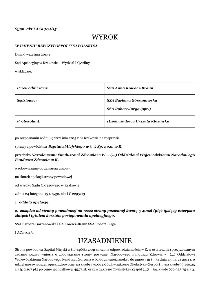 Sygn. akt I ACa 704/15 WYROK W IMIENIU RZECZYPOSPOLITEJ POLSKIEJ Dnia 9 września 2015 r. Sąd Apelacyjny w Krakowie – Wydział I Cywilny w składzie: Przewodniczący: SSA Anna Kowacz-Braun Sędziowie: SSA Barbara Górzanowska SSA Robert Jurga (spr.) Protokolant: st.sekr.sądowy Urszula Kłosińska po rozpoznaniu w dniu 9 września 2015 r. w Krakowie na rozprawie sprawy z powództwa Szpitala Miejskiego w (...) Sp. z o.o. w R. przeciwko Narodowemu Funduszowi Zdrowia w W. - (...) Oddziałowi Wojewódzkiemu Narodowego Funduszu Zdrowia w K. o zobowiązanie do zawarcia umowy na skutek apelacji strony powodowej od wyroku Sądu Okręgowego w Krakowie z dnia 24 lutego 2015 r. sygn. akt I C 2295/13 1. oddala apelację; 2. zasądza od strony powodowej na rzecz strony pozwanej kwotę 5 400zł (pięć tysięcy czterysta złotych) tytułem kosztów postępowania apelacyjnego. SSA Barbara Górzanowska SSA Kowacz-Braun SSA Robert Jurga I ACa 704/15 UZASADNIENIE Strona powodowa Szpital Miejski w (...) spółka z ograniczoną odpowiedzialnością w R. w ostatecznie sprecyzowanym żądaniu pozwu wniosła o zobowiązanie strony pozwanej Narodowego Funduszu Zdrowia - (...) Oddziałowi Wojewódzkiemu Narodowego Funduszu Zdrowia w K. do zawarcia aneksu do umowy nr (...) z dnia 17 marca 2011 r. o udzielanie świadczeń opieki zdrowotnej na kwotę 770.064,00 zł, w zakresie Okulistyka- Zespół (...) na kwotę 99.140,25 zł (tj. 2.167 pkt po cenie jednostkowej 45,75 zł) oraz w zakresie Okulistyka- Zespół (...)(...)na kwotę 670.923,75 zł (tj. 14.665 pkt. po cenie jednostkowej 45,75 zł) – na okres jednego roku od uprawomocnienia się wyroku w niniejszej sprawie. Uzasadniając swoje roszczenie strona powodowa wskazała, iż przystąpiła do organizowanego przez stronę pozwaną konkursu ofert o udzielanie świadczeń opieki zdrowotnej, składając ofertę w dniu 9 października 2010 r. w postępowaniu prowadzonym w trybie konkursu ofert w rodzaju Leczenie Szpitalne w zakresie Okulistyka- Zespół (...), Okulistyka – Zespół (...) (...) w której zaoferowała cenę za punkt rozliczeniowy w kwotach: 51,00 zł w zakresie Okulistyka- Zespół (...) orz 51,00 zł w zakresie Okulistyka – Zespół (...) (...)oraz odpowiednio w tych zakresach liczbę punktów rozliczeniowych w wysokości 6.000 oraz 30.000 w 2011 r. na łączne kwoty 306.000,00 zł oraz 1.530.000,00 zł. Przeprowadzona przez stronę pozwaną kontrola wykazała, iż formularz ofertowy z uwzględnieniem oświadczeń jest zgodny ze stanem faktycznym. W dniu 14 października 2010 r. w siedzibie strony pozwanej nastąpiło otwarcie ofert. W toku negocjacji – obejmujących trzy spotkania w dniach 6, 21 i 28 grudnia 2010 r. – strona powodowa zmieniła swoją ofertę w ten sposób, że cenę za punkt rozliczeniowy w każdym zakresie określiła w wysokości 45,75 zł. Po rozstrzygnięciu postępowania w trybie konkursu ofert w dniu 30 grudnia 2010 r. strony powodowej nie wskazano jako uprawnionej do zawarcia umowy o udzielanie świadczeń opieki zdrowotnej. Na skutek złożonego przez stronę powodową od w/w rozstrzygnięcia konkursu odwołania, decyzją z dnia 18 stycznia 2011 r. Dyrektor pozwanego (...) NFZ uwzględnił je, jednak pomimo to strona powodowa złożyła na wspomnianą decyzję odwołanie do Prezesa NFZ choć w części dotyczącej wyłącznie uzasadniania decyzji, zarzucając mu szereg nieprawidłowości. W dniu 1 lutego 2011 r. strona pozwana zamieściła ogłoszenie o rokowaniach w sprawie udzielania świadczeń opieki zdrowotnej na podstawie art. 139 ustawy z dnia 27 sierpnia 2004 r. o świadczeniach opieki zdrowotnej finansowanych ze środków publicznych (t.j. Dz. U. z 2008 r., nr 164, poz. 1027 z późn. zm.) – w ogłoszeniu tym strona pozwana określiła wartość zamówienia w wysokości 879.857,10 zł nie wskazując, co legło u podstaw takiego ustalenia; okres obowiązywania przyszłej umowy określono od 10 lutego 2011 r. do 31 grudnia 2014 r. Strona powodowa otrzymała zaproszenie do wzięcia udziału w w/w rokowaniach w rodzaju Leczenie Szpitalne w zakresie Okulistyka- Zespół (...), Okulistyka – Zespół (...) (...). W dniu 10 lutego 2011 r. na stronach internetowych pozwanego NFZ zamieszczono ogłoszenie o rozstrzygnięciu postępowania w trybie rokowań, w którym wskazano, że dokonano wyboru strony powodowej do zawarcia umowy o udzielanie świadczeń opieki zdrowotnej. W dniu 15 lutego 2011 r. strona powodowa wezwała stronę pozwaną do zapłaty za miesiąc styczeń 2011 r. kwoty stanowiącej 1/12 należności jaką otrzymałaby, gdyby strona pozwana prawidłowo przeprowadziła postępowanie konkursowe - w odpowiedzi strona pozwana wskazała, iż „wartość ogłoszonego w dniu 1 lutego 2011 r. postępowania odpowiada miejscu w rankingu jakie zajmowałaby oferta strony powodowej uwzględniają oświadczenie oferenta w sprawie posiadania aparatu (...), zaś początek okresu obowiązywania umowy nie może być wcześniejszy niż dzień rozstrzygnięcia postępowania”. W dniu 17 marca 2011 r. strona powodowa otrzymała projekty stosownej umowy o udzielanie świadczeń opieki zdrowotnej, a w dniu 19 kwietnia 2011 r. podpisany przez stronę pozwaną egzemplarz tejże umowy. Decyzją z dnia 10 października 2011 r. Prezes NFZ uchylił zaskarżoną decyzję Dyrektora (...) NFZ, w której zalecił stronie pozwanej podjęcie czynności, które skutecznie zadośćuczynią naruszeniu interesu prawnego strony powodowej. Strona powodowa podniosła, iż Komisja Konkursowa powołana przez pozwany NFZ dopuściła się w toku w/w postępowania konkursowego błędów, które skutkowały powstanie po stronie Szpitala szkody – gdyby bowiem Komisja prawidłowo ustaliła, że strona powodowa posiada aparat (...), to ta ostatnia nie musiałaby odwoływać się od rozstrzygnięcia konkursu ofert i w efekcie zawarłaby umowę od dnia 1 stycznia 2011 r., a nie jak miało to miejsce w przedmiotowej sprawie od 10 lutego 2011 r.