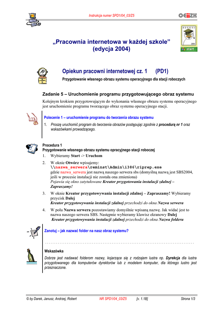 Instrukcja numer SPD1/04_03/Z5 „Pracownia internetowa w kaĪdej szkole” (edycja 2004) Opiekun pracowni internetowej cz. 1 (PD1) Przygotowanie wâasnego obrazu systemu operacyjnego dla stacji roboczych Zadanie 5 – Uruchomienie programu przygotowującego obraz systemu Kolejnym krokiem przygotowującym do wykonania wáasnego obrazu systemu operacyjnego jest uruchomienie programu tworzącego obraz systemu operacyjnego stacji. Polecenie 1 – uruchomienie programu do tworzenia obrazu systemu 1. ProszĊ uruchomiü program do tworzenia obrazów postĊpując zgodnie z procedurą nr 1 oraz wskazówkami prowadzącego. Procedura 1 Przygotowanie wâasnego obrazu systemu opracyjnego stacji roboczej 1. Wybieramy Start -> Uruchom 2. W oknie Otwórz wpisujemy: \\nazwa_serwera\reminst\Admin\i386\riprep.exe gdzie nazwa_serwera jest nazwą naszego serwera sbs (domyĞlną nazwą jest SBS2004, jeĞli w procesie instalacji nie zostaáa ona zmieniona) Pojawia siĊ okno zatytuáowane Kreator przygotowania instalacji zdalnej – Zapraszamy! 3. W oknie Kreator przygotowywania instalacji zdalnej – Zapraszamy! Wybieramy przycisk Dalej Kreator przygotowywania instalacji zdalnej przechodzi do okna Nazwa serwera 4. W polu Nazwa serwera pozostawiamy domyĞlnie wpisaną nazwĊ. Jak widaü jest to nazwa naszego serwera SBS. NastĊpnie wybieramy klawisz ekranowy Dalej Kreator przygotowywania instalacji zdalnej przechodzi do okna Nazwa folderu Zanotuj – jak nazwaý folder na nasz obraz systemu? ................................................................................... Wskazówka Dobrze jest nadawaü folderom nazwy, kojarzące siĊ z rodzajem lustra np. Dyrekcja dla lustra przygotowanego dla komputerów dyrektorów lub z modelem komputer, dla którego lustro jest przeznaczone. © by Darek, Janusz, Andrzej, Robert NR SPD1/04_03/Z5 [v. 1.1B] Strona 1/3 Przygotowanie wáasnego obrazu systemu operacyjnego dla stacji roboczych 5. W polu Nazwa folderu wpisujemy nazwĊ folderu, w jakim zostanie umieszczone na serwerze nasze lustro systemu nastĊpnie wybieramy klawisz ekranowy Dalej. Kreator przygotowywania instalacji zdalnej przechodzi do okna Przyjazny opis i tekst pomocy Uwaga !!! Musimy zapamiĊtaü lub zapisaü nazwĊ folderu – bĊdziemy musieli uzyskaü do niego dostĊp, aby zakoĔczyü konfiguracjĊ lustra systemu. 6. W oknie Przyjazny opis i tekst pomocy wprowadzamy: Uwaga !!! W oba powyĪsze pola nie moĪemy wprowadzaü polskich liter. w polu Przyjazny opis: krótki opis naszego lustra bĊdzie on pojawiaá siĊ jako jego nazwa w systemie instalacji zdalnej Zanotuj – co wprowadziý w polu Przyjazny opis? .................................................................................. w polu Tekst pomocy: informacjĊ bardziej szczegóáowo opisujące nasze lustro Zanotuj – co wprowadziý w polu Tekst pomocy? .................................................................................. wybieramy przycisk ekranowy Dalej Kreator przygotowywania instalacji zdalnej przechodzi do okna Zatrzymaj usáugi Uwaga !!! W tym miejscu mogą pojawiü siĊ informacje o zgodnoĞci systemu. Tego typu informacja wskazuje na potencjalne problemy, jakie mogą wyniknąü w trakcie tworzenia lustra. JeĞli postĊpujesz zgodnie z zaleceniami instrukcji nie zobaczysz tego okna. Wskazówka W polu krótki opis warto wprowadziü informacjĊ jednoznacznie identyfikującą nasze lustro np:. Komputery z sali 302. W polu Tekst pomocy warto podawaü informacjĊ, co zawiera dane lustro np.: System Windows XP i oprogramowanie Adobe Acrobat Reader 7. W oknie Zatrzymaj usáugi wyĞwietlone zostaną usáugi, których dziaáanie moĪe przeszkodziü procesowi wykonywania lustra systemu. Wybieramy klawisz ekranowy Dalej NastĊpuje zatrzymanie usáug nastĊpnie Kreator przygotowywania instalacji zdalnej przechodzi do okna Uruchomione są programy lub usáugi © by Darek, Janusz, Andrzej, Robert NR SPD1/04_03/Z5 [v. 1.0] Strona 2/3 Przygotowanie wáasnego obrazu systemu operacyjnego dla stacji roboczych 8. W oknie Uruchomione są programy lub usáugi wyĞwietlone zostaną procesy systemowe, których dziaáanie moĪe przeszkodziü procesowi wykonywania lustra systemu. Wszystkie wyĞwietlone procesy muszą zostaü zamkniĊte. Po ich zamkniĊciu wybieramy przycisk ekranowy Dalej. Kreator przygotowywania instalacji zdalnej przechodzi do okna Uruchomione są programy lub usáugi Wskazówka Aby zamknąü proces o danej nazwie wykonujemy nastĊpujące czynnoĞci: 1. Wciskamy jednoczeĞnie kombinacjĊ klawiszy Ctrl + Alt + Delete Na ekranie pojawia siĊ okno Zabezpieczenia systemu Windows 2. W oknie Zabezpieczenia systemu Windows wybieramy przycisk ekranowy MenedĪer ZadaĔ Zostaje wyĞwietlone okno MenedĪera ZadaĔ 3. Wybieramy zakáadkĊ Procesy WyĞwietlona zostaje liczba wszystkich pracujących w systemie procesów 4. Odszukujemy proces o nazwie wyĞwietlonej na liĞcie w oknie Uruchomione są programy lub usáugi i zaznaczmy go myszką 5. Wybieramy przycisk ekranowy ZakoĔcz proces Pojawia siĊ okno zatytuáowane OstrzeĪenie menedĪera zadaĔ 6. W oknie OstrzeĪenie menedĪera zadaĔ wybieramy przycisk ekranowy Tak Proces zostaje zamkniĊty i znika z lisy 7. OperacjĊ powtarzamy dla kaĪdego procesu umieszczonego na liĞcie w oknie Uruchomione są programy lub usáugi 9. W oknie Przeglądanie ustawieĔ wybieramy przycisk ekranowy Dalej Kreator przygotowywania instalacji zdalnej przechodzi do okna KoĔczenie pracy Kreatora przygotowywania instalacji zdalnej 10. Wybieramy klawisz ekranowy Dalej Rozpoczyna siĊ proces tworzenia lustra systemu na serwerze 11. Proces tworzenia lustra systemu moĪemy podzieliü na nastĊpujące etapy: Weryfikacja wersji systemu Windows Analiza partycji Kopiowanie informacji o partycjach Kopiowanie plików do serwera Kopiowanie i aktualizowanie informacji Rejestru po zakoĔczeniu procesu tworzenia lustra systemu na ekranie pojawia siĊ okno zatytuáowane Dziennik báĊdów programu Riprep z informacją o sukces
