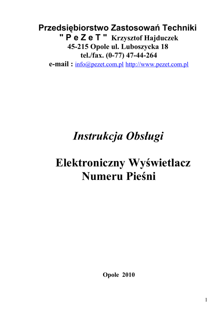 Przedsiębiorstwo Zastosowań Techniki " P e Z e T " Krzysztof Hajduczek 45-215 Opole ul. Luboszycka 18 tel./fax. (0-77) 47-44-264 e-mail : [email protected] http://www.pezet.com.pl Instrukcja Obsługi Elektroniczny Wyświetlacz Numeru Pieśni Opole 2010 1 1. Spis treści 1. SPIS TREŚCI......................................................................................... 2 2. WSTĘP................................................................................................... 3 3. MONTAŻ I PODŁĄCZENIE WYŚWIETLACZA.............................3 4.BEZPIECZEŃSTWO UŻYTKOWANIA............................................. 4 5. STEROWANIE WYŚWIETLACZA Z PILOTA................................ 6 6. ZALECENIA EKSPLOATACYJNE................................................... 8 7. UMOWA GWARANCYJNA................................................................ 9 2 2. Wstęp Wyświetlacze są wykonywane w dwóch kategoriach: - z cyfr LED o wysokości 5” (125mm) - z cyfr LED o wysokości 8” (200mm) Ze względu na układ cyfr wyświetlacze dzielą się na dwa typy: - trzy cyfry pieśń, jedna cyfra zwrotka - cztery cyfry pieśń, jedna cyfra zwrotka Wyświetlacze są sterowane z pilota radiowego (do 50m). 3. Montaż i podłączenie wyświetlacza Wyświetlacz należy wieszać na dwóch uchwytach uniwersalnych. Rozstaw uchwytów jest regulowany i można go dopasować do indywidualnych potrzeb. Do przytwierdzenia uchwytów uniwersalnych do ściany należy użyć dostarczonych razem z 3 wyświetlaczem śrub i kołków rozporowych. Uchwyty można również przykręcić do wyświetlacza w pozycji „uszkiem do góry”, co daje możliwość zawieszenia np. na łańcuszku. Do montażu wyświetlacza nie wolno wykorzystywać innych śrub znajdujących się na ściankach tylnej i bocznych wyświetlacza. Są to śruby konstrukcyjne. Montaż powinny przeprowadzić osoby posiadające właściwe kwalifikacje – uprawnienia w zależności od zakresu robót (wysokościowe, elektryczne itp.) 4.Bezpieczeństwo użytkowania Przed włączeniem urządzenia do prądu proszę przeczytać informacje dotyczące bezpieczeństwa użytkowania. Źródło zasilania. Wyświetlacz może być zasilana wyłącznie z sieci zasilającej prądu zmiennego AC 230V 50Hz. Ogólne warunki bezpieczeństwa użytkowania. • • • • 4 Wyświetlacz należy usytuować w miejscu bezpiecznym i stabilnym, a kabel sieciowy powinien być ułożony tak, aby nie był narażony na deptanie, zaczepianie lub wyrywanie z gniazdka sieciowego przez osoby lub zwierzęta poruszające się po pomieszczeniu. Nie stawiać wyświetlacza na mokrej powierzchni. Nie używać w wilgotnym środowisku. Nie stwarzać możliwości zamoknięcia: np. dostęp deszczu przez otwarte okno. Nigdy nie stawiać na urządzeniu pojemników z płynami : wazony, szklanki, puszki, kieliszki itp. Nigdy nie stawiać na urządzeniu źródeł otwartego ognia: świece, lampki oliwne itp. Jeżeli zostanie zauważone jakiekolwiek uszkodzenie przewodu zasilającego lub wtyczki, należy dla własnego bezpieczeństwa bezzwłocznie udać się do serwisu w celu usunięcia tej usterki. Czyszczenie Przed czyszczeniem należy zawsze wyłączyć urządzenie z sieci przez wyjęcie przewodu zasilającego lub zasilacza z gniazdka. • Nie używać środków czyszczących w płynie. • Do czyszczenia używać wyłącznie suchą miękką tkaninę nie pozostawiającą drobnych włosków – nitek. Wentylacja • Wszystkie otwory i szczeliny w obudowie służą głównie do wentylacji urządzenia. Nie wolno ich zasłaniać ani przykrywać, gdyż grozi to przegrzaniem podzespołów wewnętrznych. Serwis W razie potrzeby oddać urządzenie do specjalistycznego serwisu. Wewnątrz nie ma żadnych elementów regulacyjnych przeznaczonych do obsługi przez użytkownika, ani użytecznych elementów. PRZED URUCHOMIENIEM • • • • • Przed rozpoczęciem sprawdź zgodność napięcia posiadanej sieci zasilającej z informacją umieszczoną na urządzeniu lub zasilaczu. Włączanie i wyłączanie z gniazdka sieciowego wykonuj trzymając zawsze za wtyczkę sieciową, a nie za przewód zasilający. Jeżeli tylko wtyczka kabla zasilającego znajduje się w gniazdku sieciowym, urządzenie jest cały czas zasilane nawet po wyłączeniu wyłącznikiem. Jeżeli cokolwiek wpadnie lub wleje się do środka urządzenia lub zasilacza, natychmiast wyjmij wtyczkę z gniazdka sieciowego. Urządzenie ani zasilacz nie może być używane do czasu oględzin wykonanych przez serwis. Nie rozkręcaj urządzenia lub zasilacza. Wewnątrz może występować wysokie napięcie zagrażające zdrowiu a nawet życiu. Jakiekolwiek naprawy i regulacje wewnątrz powinien wykonywać wyłącznie kwalifikowany personel serwisowy. LOKALIZACJA • • • Umieść urządzenie i ewentualnie zasilacz w miejscu z dobrą wentylacją – swobodnym przepływem powietrza. Zapobiegnie to przegrzewaniu się elementów wewnętrznych. Nigdy nie ustawiaj urządzenia ani zasilacza w okolicy urządzeń grzewczych, ani w miejscach nasłonecznionych. Nigdy nie kładź na nim ciężkich przedmiotów. 5 KONDENSACJA W pewnych okolicznościach (np. nagła zmiana lokalizacji z pomieszczenia zimnego do ciepłego) urządzenie i/lub zasilacz może pokryć się parą wodną uniemożliwiając czasowo użytkowanie urządzenia. W takiej sytuacji należy odczekać około 2 godziny na ustabilizowanie się temperatury i odparowanie wilgoci. 5. Sterowanie wyświetlacza z pilota Pilot jest w stanie sterować niezależnie dwiema grupami wyświetlaczy. Oznacza to, że każda grupa wyświetlaczy może pokazywać inne numery pieśni – np. grupa pierwsza pokazuje numer pieśni obowiązujący w starym modlitewniku, a grupa druga numer pieśni obowiązujący w nowym modlitewniku. O przynależności wyświetlacza do danej grupy decyduje ustawienie przełącznika dip-switch umieszczonego na tylniej ściance wyświetlacza. 1 ON 2 Rozmieszczenie przełącznika dip-sw