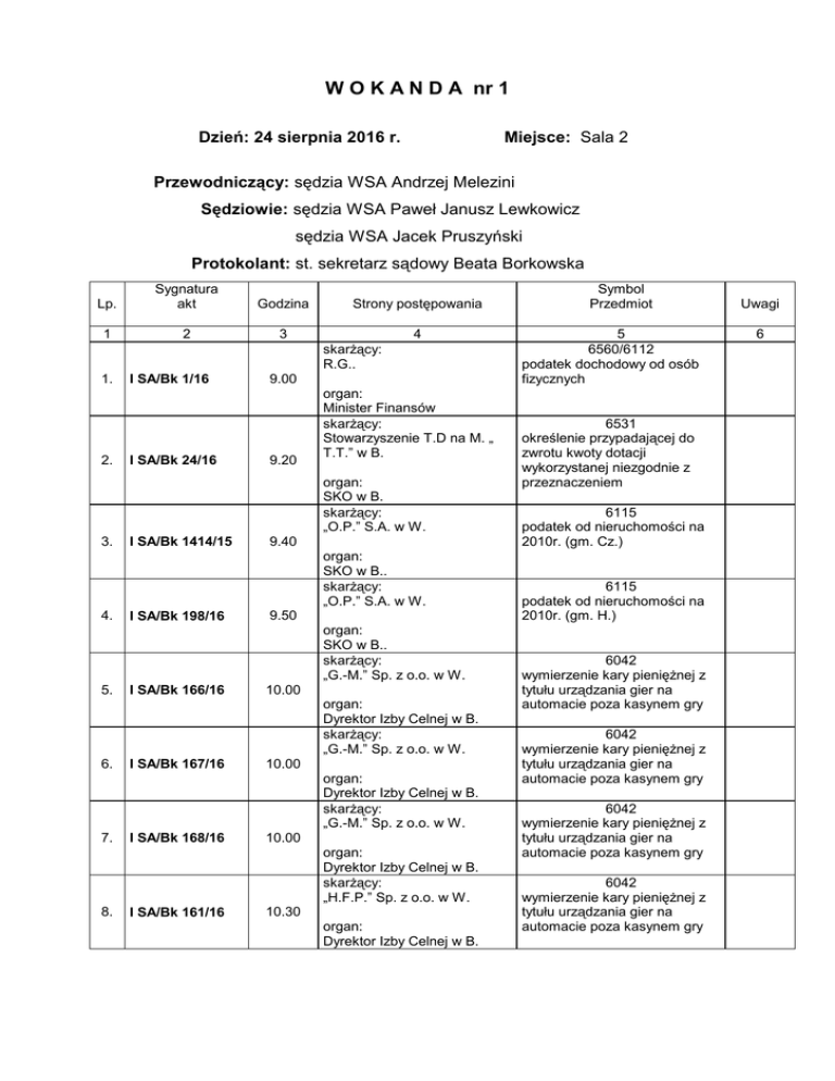 W O K A N D A nr 1 Dzień: 24 sierpnia 2016 r. Miejsce: Sala 2 Przewodniczący: sędzia WSA Andrzej Melezini Sędziowie: sędzia WSA Paweł Janusz Lewkowicz sędzia WSA Jacek Pruszyński Protokolant: st. sekretarz sądowy Beata Borkowska Lp. Sygnatura akt Godzina 1 2 3 Strony postępowania 4 skarżący: R.G.. 1. 2. I SA/Bk 1/16 I SA/Bk 24/16 9.00 9.20 organ: Minister Finansów skarżący: Stowarzyszenie T.D na M. „ T.T.” w B. organ: SKO w B. skarżący: „O.P.” S.A. w W. 3. I SA/Bk 1414/15 9.40 organ: SKO w B.. skarżący: „O.P.” S.A. w W. 4. I SA/Bk 198/16 9.50 organ: SKO w B.. skarżący: „G.-M.” Sp. z o.o. w W. 5. I SA/Bk 166/16 10.00 organ: Dyrektor Izby Celnej w B. skarżący: „G.-M.” Sp. z o.o. w W. 6. I SA/Bk 167/16 10.00 organ: Dyrektor Izby Celnej w B. skarżący: „G.-M.” Sp. z o.o. w W. 7. I SA/Bk 168/16 10.00 organ: Dyrektor Izby Celnej w B. skarżący: „H.F.P.” Sp. z o.o. w W. 8. I SA/Bk 161/16 10.30 organ: Dyrektor Izby Celnej w B. Symbol Przedmiot 5 6560/6112 podatek dochodowy od osób fizycznych 6531 określenie przypadającej do zwrotu kwoty dotacji wykorzystanej niezgodnie z przeznaczeniem 6115 podatek od nieruchomości na 2010r. (gm. Cz.) 6115 podatek od nieruchomości na 2010r. (gm. H.) 6042 wymierzenie kary pieniężnej z tytułu urządzania gier na automacie poza kasynem gry 6042 wymierzenie kary pieniężnej z tytułu urządzania gier na automacie poza kasynem gry 6042 wymierzenie kary pieniężnej z tytułu urządzania gier na automacie poza kasynem gry 6042 wymierzenie kary pieniężnej z tytułu urządzania gier na automacie poza kasynem gry Uwagi 6 2 W O K A N D A nr 2 Dzień: 24 sierpnia 2016 r. Miejsce: Sala 2 Przewodniczący: sędzia WSA Andrzej Melezini Sędziowie: sędzia SO del. do WSA Małgorzata Anna Dziemianowicz sędzia WSA Paweł Janusz Lewkowicz Protokolant: st. sekretarz sądowy Beata Borkowska Lp. Sygnatura akt Godzina 1 2 3 1. I SA/Bk 189/16 Strony postępowania 4 skarżący: „H.F.P.” Sp. z o.o. w W. 10.50 organ: Dyrektor Izby Celnej w B. skarżący: „T.S.” Sp. z o.o. w W. 2. I SA/Bk 1384/15 11.05 organ: Dyrektor Izby Celnej w B. skarżący: „T.S.” Sp. z o.o. w W. 3. I SA/Bk 1385/15 11.05 organ: Dyrektor Izby Celnej w B. skarżący: „T.S.” Sp. z o.o. w W. 4. I SA/Bk 5/16 11.05 organ: Dyrektor Izby Celnej w B. skarżący: D.T. 5. I SA/Bk 33/16 11.35 organ: Dyrektor Izby Celnej w B. skarżący: Ł.W. 6. I SA/Bk 1282/15 11.50 organ: Dyrektor Izby Skarbowej w B. skarżący: B.P. 7. I SA/Bk 1411/15 12.10 organ: Dyrektor Izby Skarbowej w B. skarżący: J.J.Z. 8. I SA/Bk 1398/15 12.30 organ: Dyrektor Izby Skarbowej w B. Symbol Przedmiot 5 6042 wymierzenie kary pieniężnej z tytułu urządzania gier na automacie poza kasynem gry 6042 wymierzenie kary pieniężnej z tytułu urządzania gier na automacie poza kasynem gry 6042 wymierzenie kary pieniężnej z tytułu urządzania gier na automacie poza kasynem gry 6042 wymierzenie kary pieniężnej z tytułu urządzania gier na automacie poza kasynem gry 6042 wymierzenie kary pieniężnej z tytułu urządzania gier na automacie poza kasynem gry 6112 określenie zobowiązania podatkowego w podatku dochodowym od osób fizycznych z tytułu pozarolniczej działalności gospodarczej za 2010r. 6112 podatek dochodowy od osób fizycznych za 2014r. 6110 podatek od towarów i usług za poszczególne okresy od sierpnia do grudnia 2011r. Uwagi 6