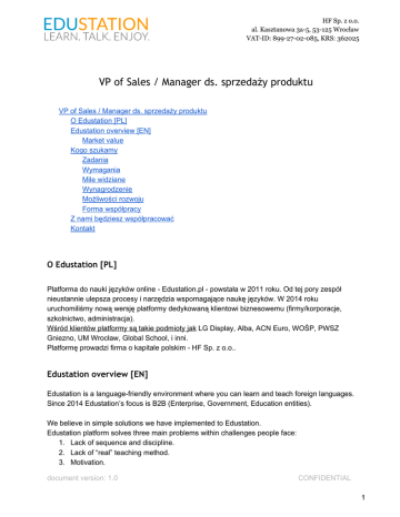 HF Sp. z o.o. al. Kasztanowa 3a5, 53125 Wrocław VATID: 8992702085, KRS: 362025 VP of Sales / Manager ds. sprzedaży produktu VP of Sales / Manager ds. sprzedaży produktu O Edustation [PL] Edustation overview [EN] Market value Kogo szukamy Zadania Wymagania Mile widziane Wynagrodzenie Możliwości rozwoju Forma współpracy Z nami będziesz współpracować Kontakt O Edustation [PL] Platforma do nauki języków online Edustation.pl powstała w 2011 roku. Od tej pory zespół nieustannie ulepsza procesy i narzędzia wspomagające naukę języków. W 2014 roku uruchomiliśmy nową wersję platformy dedykowaną klientowi biznesowemu (firmy/korporacje, szkolnictwo, administracja). Wśród klientów platformy są takie podmioty jak LG Display, Alba, ACN Euro, WOŚP, PWSZ Gniezno, UM Wrocław, Global School, i inni. Platformę prowadzi firma o kapitale polskim HF Sp. z o.o.. Edustation overview [EN] Edustation is a languagefriendly environment where you can learn and teach foreign languages. Since 2014 Edustation’s focus is B2B (Enterprise, Government, Education entities). We believe in simple solutions we have implemented to Edustation. Edustation platform solves three main problems within challenges people face: 1. Lack of sequence and discipline. 2. Lack of “real” teaching method. 3. Motivation. document version: 1.0 CONFIDENTIAL 1 HF Sp. z o.o. al. Kasztanowa 3a5, 53125 Wrocław VATID: 8992702085, KRS: 362025 As an effect (we call it “Edustation effect”) we note, that just after 3 months of selfpaced interacting with our platform people improve their: 1. Listening skills. 2. Vocabulary. 3. Comprehension. As for now we secured contracts with: Wroclaw City Council, State Higher Vocational School Gniezno (PWSZ), Siesta Language School (Gdynia), LG Display Poland, ACN Euro, WPO Alba, Global School, 2 high schools from Wroclaw. Also we succeeded in a contract with biggest nonprofit organization in Poland (WOSP) and delivered our solution to Polish Woodstock this year. Market value document version: 1.0 CONFIDENTIAL 2 HF Sp. z o.o. al. Kasztanowa 3a5, 53125 Wrocław VATID: 8992702085, KRS: 362025 Kogo szukamy Menedżera ds. sprzedaży / VP of Sales naszego produktu w modelu abonamentowym: http://www.edustation.pl/landing/saas/#pricingsection http://www.edustation.pl/landing/biz/ document version: 1.0 CONFIDENTIAL 3 HF Sp. z o.o. al. Kasztanowa 3a5, 53125 Wrocław VATID: 8992702085, KRS: 362025 Zadania 1. Czynna sprzedaż usług B2B platformy elearningowej w modelu abonamentowym dla biznesu, administracji oraz szkolnictwa: 2. Dbanie o relacje z klientem, udział w prezentacjach platformy i pozyskiwanie nowych kontaktów. 3. Chcemy, abyś został(a) naszym partnerem biznesowym po pomyślnej realizacji planów sprzedażowych, stąd oczekujemy determinacji w osiąganiu wyników i celów i “nieetatowego” podejścia do pracy. Wymagania 1. Umiejętnością władania słowem mówionym na żywo czy przez telefon oraz słowem pisanym. 2. Perswazja. Reprezentatywność. Charakter ekstrawertyczny. 3. Bardzo dobry język angielski (w końcu to platforma do nauki języków :)). 4. Odwaga. Mile widziane ● ● ● ● Sukcesy w sprzedaży (branża nie ma znaczenia, liczą się potwierdzone wyniki). Znajomość pojęć dot. produktów SaaS (softwareasaservice) takich jak konwersja, lead, LTV itp. Siatka własnych kontaktów. Doświadczenie we współpracy z departamentami HR, Talent management, Działem zakupów itp. Wynagrodzenie 1. Baza 12001500 zł netto + Wysoka prowizja (model schodkowy uzależniony od obrotów w danym roku kalendarzowym, od 20 do 40%). 2. Opcje udziałowe w Edustation, w wys. od 10 do 30% po roku współpracy lub szybciej pod warunkiem osiągnięcia uzgodnionych celów sprzedażowych. Możliwości rozwoju Edustation to produkt o globalnym potencjale. Już dziś międzynarodowe firmy korzystają z niego. Możesz być częścią tej przygody. Na ten moment nie mamy sensu stricto działu sprzedaży. Możesz go stworzyć i być jego dyrektorem, gdy będziesz gotów/a. Forma współpracy 1. FV, umowa o dzieło 2. Elastyczny czas pracy sam/a organizujesz spotkania, godziny na kontakt elektroniczny czy telefoniczny. document version: 1.0 CONFIDENTIAL 4 HF Sp. z o.o. al. Kasztanowa 3a5, 53125 Wrocław VATID: 8992702085, KRS: 362025 Z nami będziesz współpracować Kontakt [email protected] z dopiskiem: “VP of Sales” HF Sp. z o.o. +48 71 7366373 al. Kasztanowa 3a-5 53-125 Wrocław document version: 1.0 CONFIDENTIAL 5