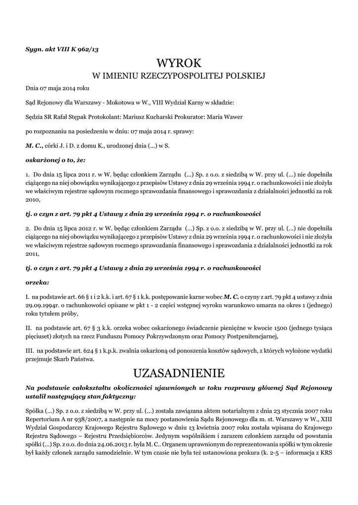 Sygn. akt VIII K 962/13 WYROK W IMIENIU RZECZYPOSPOLITEJ POLSKIEJ Dnia 07 maja 2014 roku Sąd Rejonowy dla Warszawy - Mokotowa w W., VIII Wydział Karny w składzie: Sędzia SR Rafał Stępak Protokolant: Mariusz Kucharski Prokurator: Maria Wawer po rozpoznaniu na posiedzeniu w dniu: 07 maja 2014 r. sprawy: M. C., córki J. i D. z domu K., urodzonej dnia (...) w S. oskarżonej o to, że: 1. Do dnia 15 lipca 2011 r. w W. będąc członkiem Zarządu (...) Sp. z o.o. z siedzibą w W. przy ul. (...) nie dopełniła ciążącego na niej obowiązku wynikającego z przepisów Ustawy z dnia 29 września 1994 r. o rachunkowości i nie złożyła we właściwym rejestrze sądowym rocznego sprawozdania finansowego i sprawozdania z działalności jednostki za rok 2010, tj. o czyn z art. 79 pkt 4 Ustawy z dnia 29 września 1994 r. o rachunkowości 2. Do dnia 15 lipca 2012 r. w W. będąc członkiem Zarządu (...) Sp. z o.o. z siedzibą w W. przy ul. (...) nie dopełniła ciążącego na niej obowiązku wynikającego z przepisów Ustawy z dnia 29 września 1994 r. o rachunkowości i nie złożyła we właściwym rejestrze sądowym rocznego sprawozdania finansowego i sprawozdania z działalności jednostki za rok 2011, tj. o czyn z art. 79 pkt 4 Ustawy z dnia 29 września 1994 r. o rachunkowości orzeka: I. na podstawie art. 66 § 1 i 2 k.k. i art. 67 § 1 k.k. postępowanie karne wobec M. C. o czyny z art. 79 pkt 4 ustawy z dnia 29.09.1994r. o rachunkowości opisane w pkt 1 - 2 części wstępnej wyroku warunkowo umarza na okres 1 (jednego) roku tytułem próby, II. na podstawie art. 67 § 3 k.k. orzeka wobec oskarżonego świadczenie pieniężne w kwocie 1500 (jednego tysiąca pięciuset) złotych na rzecz Funduszu Pomocy Pokrzywdzonym oraz Pomocy Postpenitencjarnej, III. na podstawie art. 624 § 1 k.p.k. zwalnia oskarżoną od ponoszenia kosztów sądowych, z których wyłożone wydatki przejmuje Skarb Państwa. UZASADNIENIE Na podstawie całokształtu okoliczności ujawnionych w toku rozprawy głównej Sąd Rejonowy ustalił następujący stan faktyczny: Spółka (...) Sp. z o.o. z siedzibą w W. przy ul. (...) została zawiązana aktem notarialnym z dnia 23 stycznia 2007 roku Repertorium A nr 938/2007, a następnie na mocy postanowienia Sądu Rejonowego dla m. st. Warszawy w W., XIII Wydział Gospodarczy Krajowego Rejestru Sądowego w dniu 13 kwietnia 2007 roku została wpisana do Krajowego Rejestru Sądowego – Rejestru Przedsiębiorców. Jedynym wspólnikiem i zarazem członkiem zarządu od powstania spółki (...) Sp. z o.o. do dnia 24.06.2013 r. była M. C.. Organem uprawnionym do reprezentowania spółki w tym okresie był każdy członek zarządu samodzielnie. W tym czasie nie była też ustanowiona prokura (k. 2-5 – informacja z KRS dot. spółki (...) Sp. z o.o.; k. 8-9 – załączniki do wniosku o rejestrację podmiotu w rejestrze przedsiębiorców; k. 11-17 – akt notarialny spółki (...) Sp. z o.o.; k. 69v – wyjaśnienia M. C.). M. C. złożyła sprawozdania finansowe z działalności spółki (...) Sp. z o.o. za lata 2007-2009 (k. 4v – informacja w KRS; k. 26v - 27, 30 - 31, 32, 33, 40, 41 - 42, 43 - 44, 45, 53v - 55, 55v - 57, 57v - 59, 59v – dokumentacja dotycząca złożonych sprawozdań finansowych za lata 2007-2009). M. C. nie złożyła sprawozdań finansowych z działalności spółki (...) Sp. z o.o. za lata 2010-2011. W informacji z KRS dla spółki (...) Sp. z o.o. brak jest danych dotyczących złożonych sprawozdań finansowych spółki za lata 2010 - 2011 (k. 69v - 70 – wyjaśnienia M. C., k. 2-5 – informacja z KRS dot. spółki (...) Sp. z o.o.) M. C. nie była wcześniej karana (dane o karalności - k. 93, 147a). Oskarżona w złożonych wyjaśnieniach w toku postępowania przygotowawczego przyznała się do popełnienia zarzucanych jej czynów. Zaznaczyła, że miała świadomość obowiązku składania sprawozdań finansowych. Podała, że sprawozdanie finansowe z działalności spółki za rok 2010 złożyła do właściwego urzędu skarbowego. Podkreśliła, że w związku z brakiem doświadczenia nie złożyła wskazanych dokumentów do właściwego rejestru sądowego. Z treści jej relacji wynika, iż zbiegło się to w czasie z rozwiązaniem umowy o pracę z księgową, która do roku 2010 była odpowiedzialna za sporządzanie wymaganych przepisami sprawozdań. Oskarżona przyznała, że za rok 2011 nie zostało sporządzone i złożone sprawozdanie finansowe ani do Urzędu Skarbowego, ani do Krajowego Rejestru Sądowego (k. 69-70 – wyjaśnienia oskarżonej). Wyjaśnienia oskarżonej Sąd ocenił w oparciu o reguły art. 7 k.p.k. zgodnie, z którymi Sąd ocenia dowody swobodnie z uwzględnieniem zasad prawidłowego rozumowania, jak i wskazań wiedzy oraz doświadczenia życiowego. Sąd obdarzył wiarą w całości wyjaśnienia oskarżonej. Jej wypowiedź jest spójna i logiczna. Ma charakter rzeczowy i obiektywny. Podkreślić trzeba, iż oskarżona podawała wszystkie okoliczności, nawet te, które rzutowały bezpośrednio na kwestię ustalenia strony podmiotowej zarzuconych jej czynów. Świadczy to jednoznacznie o chęci mówienia prawdy. Autentyczność i rzetelność sporządzenia zgromadzonych w sprawie pozostałych dowodów nieosobowych w postaci informacji z KRS (k. 2 - 5), wniosków o rejestrację wraz z załącznikami (k. 6 - 10, 17, 24 - 33, 37v - 46, 53v - 60), wypis aktu notarialnego (k. 11 - 14, 22 - 23), oświadczenia (k. 15), wzoru podpisu (k. 16), kserokopii postanowień (k. 18v 19v, 34v - 35, 47, 50v, 61v, 62v), zaświadczeń (k. 20, 37, 51, 62, 120 - 126), protokołów niezgodności (k. 35v, 49v - 50), protokołu ze zwyczajnego zgromadzenia wspólników (k. 48v), protokołu kontroli podatkowej (k. 71 - 82), danych o karalności (k. 93, 147a), rachunków zysków i strat (k. 105), sprawozdania (k. 106), CIT - 8 (k. 107 - 111), PIT - 4R (k. 112 - 115, 116 - 119) nie były przedmiotem zarzutów stron, a także nie wzbudziła wątp