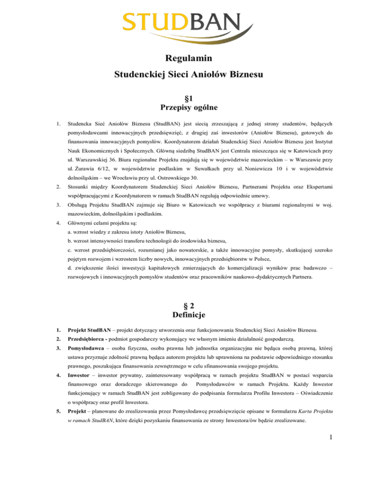 Regulamin Studenckiej Sieci Aniołów Biznesu §1 Przepisy ogólne 1. Studencka Sieć Aniołów Biznesu (StudBAN) jest siecią zrzeszającą z jednej strony studentów, będących pomysłodawcami innowacyjnych przedsięwzięć, z drugiej zaś inwestorów (Aniołów Biznesu), gotowych do finansowania innowacyjnych pomysłów. Koordynatorem działań Studenckiej Sieci Aniołów Biznesu jest Instytut Nauk Ekonomicznych i Społecznych. Główną siedzibą StudBAN jest Centrala mieszcząca się w Katowicach przy ul. Warszawskiej 36. Biura regionalne Projektu znajdują się w województwie mazowieckim – w Warszawie przy ul. Żurawia 6/12, w województwie podlaskim w Suwałkach przy ul. Noniewicza 10 i w województwie dolnośląskim – we Wrocławiu przy ul. Ostrowskiego 30. 2. Stosunki między Koordynatorem Studenckiej Sieci Aniołów Biznesu, Partnerami Projektu oraz Ekspertami współpracującymi z Koordynatorem w ramach StudBAN regulują odpowiednie umowy. 3. Obsługą Projektu StudBAN zajmuje się Biuro w Katowicach we współpracy z biurami regionalnymi w woj. mazowieckim, dolnośląskim i podlaskim. 4. Głównymi celami projektu są: a. wzrost wiedzy z zakresu istoty Aniołów Biznesu, b. wzrost intensywności transferu technologii do środowiska biznesu, c. wzrost przedsiębiorczości, rozumianej jako nowatorskie, a także innowacyjne pomysły, skutkującej szeroko pojętym rozwojem i wzrostem liczby nowych, innowacyjnych przedsiębiorstw w Polsce, d. zwiększenie ilości inwestycji kapitałowych zmierzających do komercjalizacji wyników prac badawczo – rozwojowych i innowacyjnych pomysłów studentów oraz pracowników naukowo-dydaktycznych Partnera. §2 Definicje 1. Projekt StudBAN – projekt dotyczący utworzenia oraz funkcjonowania Studenckiej Sieci Aniołów Biznesu. 2. Przedsiębiorca - podmiot gospodarczy wykonujący we własnym imieniu działalność gospodarczą. 3. Pomysłodawca – osoba fizyczna, osoba prawna lub jednostka organizacyjna nie będąca osobą prawną, której ustawa przyznaje zdolność prawną będąca autorem projektu lub uprawniona na podstawie odpowiedniego stosunku prawnego, poszukująca finansowania zewnętrznego w celu sfinansowania swojego projektu. 4. Inwestor – inwestor prywatny, zainteresowany współpracą w ramach projektu StudBAN w postaci wsparcia finansowego oraz doradczego skierowanego do Pomysłodawców w ramach Projektu. Każdy Inwestor funkcjonujący w ramach StudBAN jest zobligowany do podpisania formularza Profilu Inwestora – Oświadczenie o współpracy oraz profil Inwestora. 5. Projekt – planowane do zrealizowania przez Pomysłodawcę przedsięwzięcie opisane w formularzu Karta Projektu w ramach StudBAN, które dzięki pozyskaniu finansowania ze strony Inwestora/ów będzie zrealizowane. 1 6. Biznesplan – opis projektu sporządzony zgodnie z formularzem Biznesplan w ramach StudBAN wysyłany do Pomysłodawcy po przystąpieniu do Studenckiej Sieci Aniołów Biznesu. 7. Uczestnik StudBAN – każdy Pomysłodawca oraz Inwestor zarejestrowany w StudBAN, a także pozostałe podmioty korzystające z usług oferowanych przez StudBAN. 8. Baza Uczestników – rejestr danych o uczestnikach StudBAN, prowadzony przez Fundację INES. 9. Karta Projektu w ramach StudBAN – dokument zawierający dane na temat Pomysłodawcy oraz opis projektu, który planuje zrealizować. 10. Formularz Profilu Inwestora - Oświadczenie o współpracy oraz profil Inwestora – dokument zawierający dane na temat Inwestora w ramach projektu StudBAN oraz deklarację Inwestora do udziału w Projekcie oraz akceptację niniejszego regulaminu. 11. Partner Projektu - podmiot współpracujący z Liderem Projektu w ramach projektu StudBAN. Projekt przewiduje współpracę w ramach StudBAN jako Partner merytoryczny oraz Partner finansowy. 12. Centrala - Centrala projektu StudBAN znajduje się w Katowicach.. 13. Biuro Regionalne - jednostka terytorialna – województwo objęte projektem StudBAN. W ramach Projektu udział wezmą 4 regiony: region mazowiecki, region podlaski oraz region dolnośląski. W ramach Projektu StudBAN nie wyklucza się współpracy z podmiotami spoza wymienionych regionów. 14. Dane poufne – wszelkie dane uzyskane przez StudBAN w szczególności: dane osobowe Uczestników StudBAN oraz dane dotyczące Projektów, które będą chronione, dystrybuowane i zabezpieczone przez StudBAN zgodnie z obowiązującymi standardami ochrony danych osobowych w Polsce oraz Unii Europejskiej. 15. Komitet inwestycyjny StudBAN – wyznaczeni przez zespół StudBAN eksperci oraz wybrani Inwestorzy (Aniołowie Biznesu), których zadaniem jest ocena biznesplanów projektów przedstawionych przez Pomysłodawców. §3 Statut Pomysłodawcy w StudBAN 1. Uczestnik StudBAN zostaje Pomysłodawcą StudBAN w chwili rejestracji tj. wypełnienia, złożenia oraz akceptacji formularza Karta Projektu w ramach StudBAN. Warunkiem rejestracji jest akceptacja pisemna niniejszego Regulaminu w odpowiednim punkcie formularza Karta Projektu w ramach StudBAN. 2. Pomysłodawca zobowiązuje się do: a) Przestrzegania zasad Regulaminu Studenckiej Sieci Aniołów Biznesu; b) przestrzegania zasad etyki biznesowej zarówno w kontakcie z zespołem projektowym StudBAN jak również w kontakcie z Inwestorami StudBAN. §4 Statut Inwestora w StudBAN 1. Uczestnik StudBAN zostaje Inwestorem w ramach sieci StudBAN w chwili rejestracji tj. wypełnienia i złożenia oraz akceptacji formularza Profilu Inwestora - Oświadczenie o współpracy oraz profilu Inwestora. Warunkiem rejestracji jest pisemna akceptacja niniejszego Regulaminu w odpowiednim punkcie formularza Profilu Inwestora. 2 2. Inwestor w ramach StudBAN może być również uczestnikiem innych struktur inwestycyjnych, w tym innych sieci aniołów biznesu. 3. Minimalny, deklarowany poziom kapitału który jest wymagany aby uzyskać statut Inwestora w StudBAN wynosi 50 000,00 zł PLN. §5 Współpraca w ramach projektu StudBAN 1. Współprac