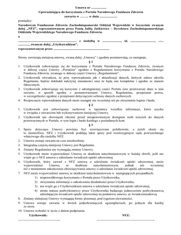 Umowa nr .................. UpowaŜniająca do korzystania z Portalu Narodowego Funduszu Zdrowia zawarta w …….. w dniu ..................... pomiędzy: Narodowym Funduszem Zdrowia Zachodniopomorski Oddział Wojewódzki w Szczecinie zwanym dalej „NFZ”, reprezentowanym przez Panią Julitę Jaśkiewicz – Dyrektora Zachodniopomorskiego Oddziału Wojewódzkiego Narodowego Funduszu Zdrowia. a ...................................................................... z siedzibą w ......................, ul. ............................., ..-... ............., zwanym dalej „UŜytkownikiem”, reprezentowanym przez ................................................................... Strony zawierają niniejszą umowę, zwaną dalej „Umową” i zgodnie postanawiają, co następuje, §1 1. UŜytkownik zobowiązuje się do korzystania z Portalu Narodowego Funduszu Zdrowia, zwanym w dalszej części Umowy „Portalem” zgodnie z Regulaminem korzystania z Portalu Narodowego Funduszu Zdrowia, zwanego w dalszej części Umowy „Regulaminem”. 2. UŜytkownik oświadcza, Ŝe przy wprowadzaniu jak i aktualizacji danych, których zakres określa Regulamin, będzie dokładał naleŜytej staranności oraz Ŝe będą one kompletne i zgodne ze stanem faktycznym. 3. UŜytkownik zobowiązuje się korzystać z udostępnionej części Portalu oraz przetwarzać dane w nim zawarte, w sposób zgodny z postanowieniami Umowy, Regulaminu, przepisami prawa, w szczególności zgodnie z przepisami dotyczącymi ochrony danych osobowych. 4. Rozpoczęcie wprowadzania danych moŜe nastąpić nie wcześniej niŜ po otrzymaniu loginu i hasła. §2 1. UŜytkownik jest zobowiązany zachować w tajemnicy wszelkie informacje, które uzyska w związku z zawarciem lub wykonywaniem niniejszej Umowy. 2. UŜytkownik ma obowiązek chronić przed nieuprawnionym dostępem osób trzecich do danych przetwarzanych w Portalu, w tym login i hasło kaŜdego z posiadanych kont. §3 1. Spory dotyczące Umowy powinny być rozwiązywane polubownie, a jeŜeli okaŜe się to niemoŜliwe, NFZ i UŜytkownik poddają takie spory pod rozstrzygnięcie sądu powszechnego właściwego dla siedziby NFZ. 2. Umowa zostaje zawarta na czas nieokreślony. 3. Integralną częścią niniejszej Umowy jest Regulamin. 4. Zmiany Regulaminu nie wymagają zmiany Umowy. 5. UŜytkownik moŜe wypowiedzieć Umowę ze skutkiem natychmiastowym w kaŜdej chwili, jeśli nie wiąŜe go z NFZ umowa o udzielanie świadczeń opieki zdrowotnej. 6. UŜytkownik, który zawarł z NFZ umowę o udzielanie świadczeń opieki zdrowotnej, moŜe wypowiedzieć Umowę ze skutkiem natychmiastowym, jednak nie wcześniej niŜ z momentem zakończenia obowiązywania umowy o udzielanie świadczeń opieki zdrowotnej. 7. NFZ moŜe wypowiedzieć umowę ze skutkiem natychmiastowym w następujących przypadkach: 1) nieprawidłowego korzystania z Portalu przez UŜytkownika, 2) otrzymania informacji o zakończeniu działalności przez UŜytkownika, 3) nie wiąŜe go z UŜytkownikiem umowa o udzielanie świadczeń opieki zdrowotnej, 4) utrata statusu podwykonawcy przez UŜytkownika będącego jednocześnie podwykonawcą udzielającym świadczeń opieki zdrowotnej na podstawie umowy ze świadczeniodawcą. 8. Zmiany niniejszej Umowy wymagają formy pisemnej, pod rygorem niewaŜności. 9. Umowa zostaje zawarta w dwóch jednobrzmiących egzemplarzach, po jednym dla kaŜdej ze stron. 10. Umowa wchodzi w Ŝycie z dniem podpisania. UŜytkownik: NFZ: ……………………………….. …………………………………………….