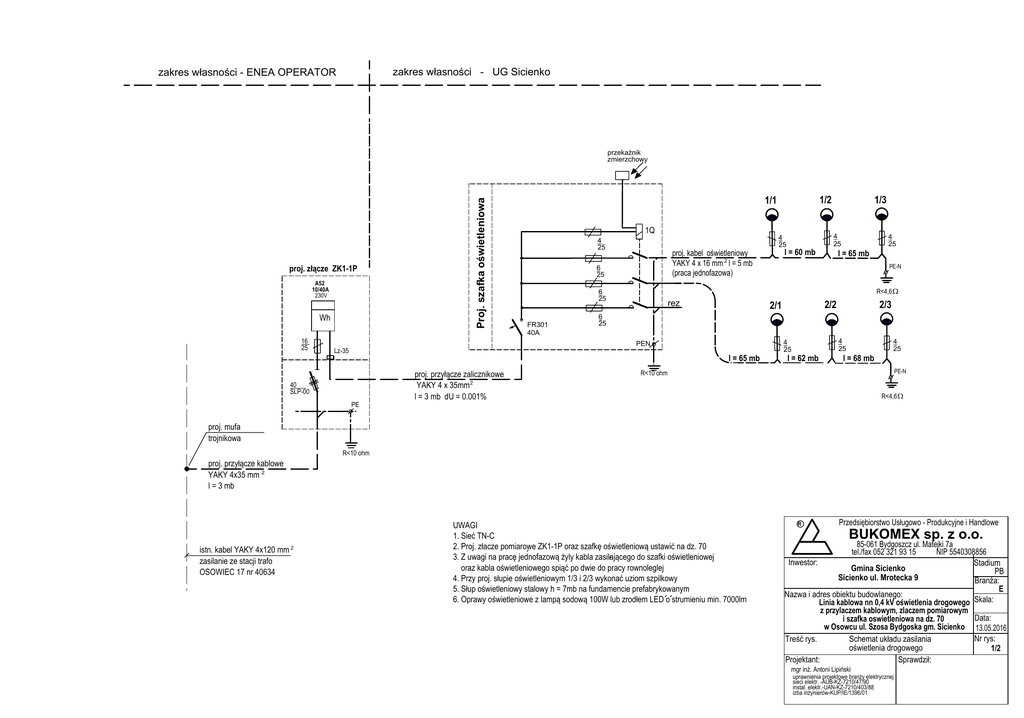 zakres własności - UG Sicienko zakres własności - ENEA OPERATOR proj. złącze ZK1-1P A52 10/40A 230V Wh 16 25 Proj. szafka oświetleniowa przekażnik zmierzchowy 4 25 1Q proj. kabel oświetleniowy YAKY 4 x 16 mm 2 l = 5 mb (praca jednofazowa) 6 25 FR301 40A rez 40 SLP-00 PE l = 60 mb 4 25 l = 65 mb 4 25 PE-N 2/2 2/1 6 25 l = 65 mb proj. przyłącze zalicznikowe YAKY 4 x 35mm2 l = 3 mb dU = 0.001% 4 25 1/3 R<4,6 : 6 25 PEN Lz-35 1/2 1/1 4 25 l = 62 mb 2/3 4 25 l = 68 mb 4 25 PE-N R<10 ohm R<4,6 : proj. mufa trojnikowa R<10 ohm proj. przyłącze kablowe YAKY 4x35 mm 2 l = 3 mb istn. kabel YAKY 4x120 mm zasilanie ze stacji trafo OSOWIEC 17 nr 40634 2 UWAGI 1. Sieć TN-C 2. Proj. złacze pomiarowe ZK1-1P oraz szafkę oświetleniową ustawić na dz. 70 3. Z uwagi na pracę jednofazową żyly kabla zasilającego do szafki oświetleniowej oraz kabla oświetleniowego spiąć po dwie do pracy rownoleglej 4. Przy proj. słupie oświetleniowym 1/3 i 2/3 wykonać uziom szpilkowy 5. Słup oświetleniowy stalowy h = 7mb na fundamencie prefabrykowanym 6. Oprawy oświetleniowe z lampą sodową 100W lub zrodłem LED o strumieniu min. 7000lm R Przedsiębiorstwo Usługowo - Produkcyjne i Handlowe BUKOMEX sp. z o.o. 85-061 Bydgoszcz ul. Matejki 7a tel./fax 052 321 93 15 NIP 5540308856 Inwestor: Stadium Gmina Sicienko PB Sicienko ul. Mrotecka 9 Branża: E Nazwa i adres obiektu budowlanego: Skala: Linia kablowa nn 0,4 kV oświetlenia drogowego z przylaczem kablowym, zlaczem pomiarowym Data: i szafka oswietleniowa na dz. 70 w Osowcu ul. Szosa Bydgoska gm. Sicienko 13.05.2016 Nr rys: Treść rys. Schemat układu zasilania oświetlenia drogowego 1/2 Sprawdził: Projektant: mgr inż. Antoni Lipiński uprawnienia projektowe branży elektrycznej sieci elektr. -AUB-KZ-7210/47/90 instal. elektr.-UAN-KZ-7210/403/88 izba inżynierów-KUP/IE/1396/01
