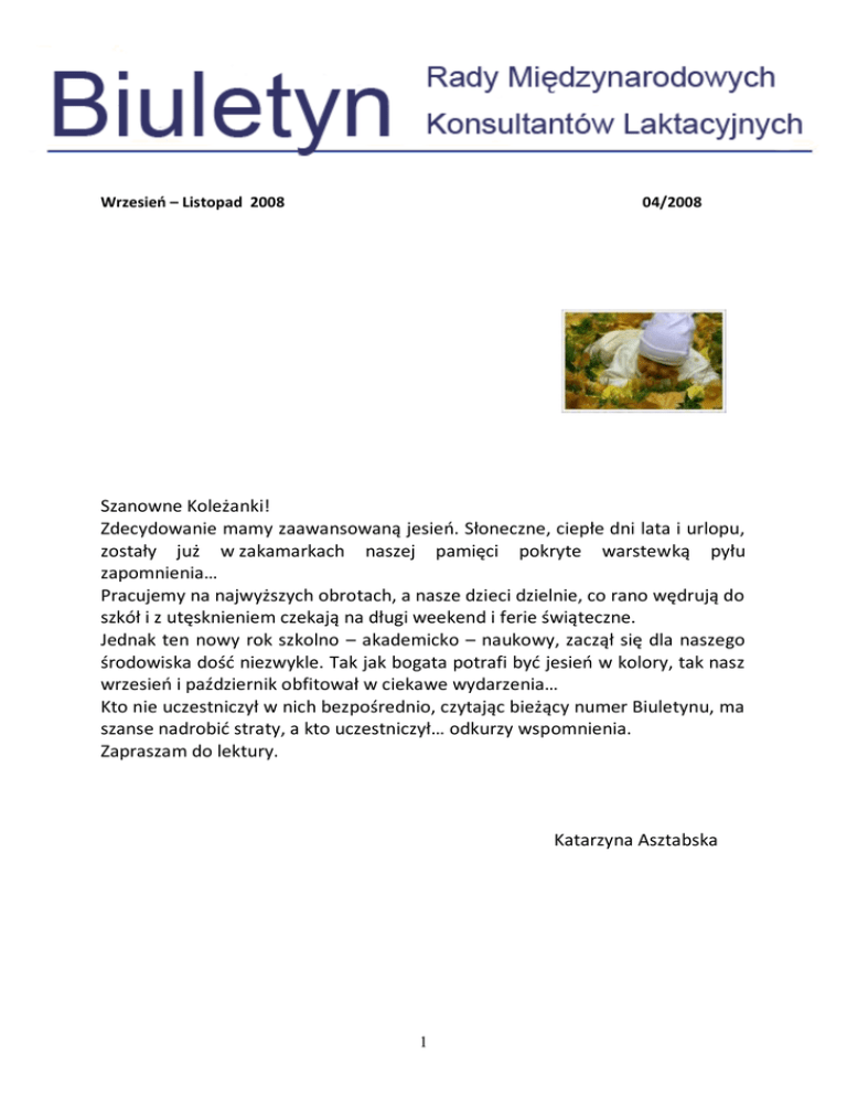Wrzesieo – Listopad 2008 04/2008 Szanowne Koleżanki! Zdecydowanie mamy zaawansowaną jesieo. Słoneczne, ciepłe dni lata i urlopu, zostały już w zakamarkach naszej pamięci pokryte warstewką pyłu zapomnienia… Pracujemy na najwyższych obrotach, a nasze dzieci dzielnie, co rano wędrują do szkół i z utęsknieniem czekają na długi weekend i ferie świąteczne. Jednak ten nowy rok szkolno – akademicko – naukowy, zaczął się dla naszego środowiska dośd niezwykle. Tak jak bogata potrafi byd jesieo w kolory, tak nasz wrzesieo i październik obfitował w ciekawe wydarzenia… Kto nie uczestniczył w nich bezpośrednio, czytając bieżący numer Biuletynu, ma szanse nadrobid straty, a kto uczestniczył… odkurzy wspomnienia. Zapraszam do lektury. Katarzyna Asztabska 1 ZDARZYŁO SIĘ… 25 września 2008r, Niepołomice Agnieszka Pietkiewicz, Gdaosk Posumowanie zebrania Rady Międzynarodowych Konsultantów Laktacyjnych W spotkaniu Rady Międzynarodowych Konsultantów Laktacyjnych 25 września 2008 w Niepołomicach uczestniczyło 35 członków RMKL. Najważniejsze ustalenia: 1. Rada podjęła decyzję o pozostaniu w strukturach KUKP na dotychczasowych zasadach. Ustalono długośd kadencji prezydium RMKL na 2 lata. Najbliższe wybory do prezydium odbędą się wiosną 2009 podczas VI Zjazdu RMKL, który odbędzie się w Warszawie i będzie połączony z obchodami Światowego Tygodnia Promocji Karmienia Piersią. Pierwszy dzieo konferencji do 16.00 KUKP, od 17.00 zebranie RMKL, drugi dzieo: VI Zjazd IBCLC. Do poszukiwania sponsorów zobowiązały się Jolanta Nurek, Grażyna Krystowska, Ewa Masełkowska-Stępnik. Za merytoryczne aspekty zjazdu odpowiedzialna jest Wanda Urmaoska. 2. Zebrani przyjęli wniosek o utworzeniu strony internetowej. Anna Komaszyoska zobowiązała się do nadzorowania prac nad stroną. Czas wykonania - do 31 grudnia 2008r. 3. Utworzenie do 31 grudnia 2008 projektów następujących dokumentów: - regulamin RMKL – osoby odpowiedzialne za pracę nad regulaminem: Joanna Piątkowska, Bogumiła Kiełbratowska i Wanda Urmaoska – głos doradczy - statut RMKL – osoby odpowiedzialne za pracę nad statutem: Malwina Okrzesik, Ewa Masełkowska-Stępnik 4. VII Zjazd organizowany będzie w Poznaniu w 2010 roku. 5. Z okazji Międzynarodowego Dnia Konsultanta zostaną umieszczone w prasie informacje na temat naszego zawodu – Katarzyna Raczek-Pakuła zobowiązała się do przygotowania materiałów dla prasy. 6. Do tej pory nie została podjęta decyzja o rejestracji zawodu konsultanta laktacyjnego oraz o refundacji wizyt w poradni laktacyjnej przez NFZ. Jolanta Piątkowska podjęła się lobbowania na rzecz rejestracji IBCLC u Krajowego Konsultanta w Dziedzinie Pielęgniarstwa Ginekologiczno- Położniczego - Leokadii Jędrzejewskiej. 7. Relację na temat przebiegu konferencji w Niepołomicach dla „Pielęgniarki i Położnej”, „Magazynu Pielęgniarki i Położnej” sporządzą Joanna Piątkowska i Bogumiła Kiełbratowska. 2 PS. Wieczór przed konferencją to zdecydowanie najlepszy termin na zebranie. Nie jesteśmy zmęczone po całym dniu konferencji, nie śpieszymy się przed rozpoczęciem kolejnego dnia. W Niepołomicach był czas na omówienie wszystkich spraw, na dyskusję, podjęłyśmy tyle spraw. MŻR 26 – 27 września 2008r, Niepołomice Katarzyna Raczek – Pakuła, Warszawa W dniach 26-27.09.2008 r., na Zamku Królewskim w Niepołomicach odbyła się jubileuszowa konferencja szkoleniowa z okazji V Zjazdu Międzynarodowych Konsultantów Laktacyjnych IBCLC. Wykłady poświęcone były różnym zagadnieniom związanym z poradnictwem laktacyjnym i praktyką konsultantów. Konferencja była również okazją do podzielenia się doświadczeniami, omówienia ciekawych przypadków. W tym roku wykłady poprowadziło międzynarodowe grono wykładowców. Pani Catherine Watson Genna z USA, z wykształcenia biolog, IBCLC, prowadzi badania USG dotyczące procesu ssania i różnych zaburzeo, które mogą mu towarzyszyd. Od wielu lat prowadzi szkolenia w USA i na świecie nt. problemów, które pojawiają się w czasie laktacji. W Niepołomicach przedstawiła zagadnienia związane z wpływem zaburzeo integracji sensorycznej u dziecka (i u matki) na karmienie piersią. Opisała proces ssania widziany w USG w przypadku maluchów z krótkim wędzidełkiem podjęzykowym. Przedstawiła plusy i minusy alternatywnej do karmienia butelką metody karmienia po palcu, który to sposób budzi wiele kontrowersji wśród polskich konsultantek. Karmienie po palcu jawi się jako wielofunkcyjne narzędzie, które może byd stosowane do usprawnienia pracy języka. Zrozumienie prawidłowego funkcjonowania języka oraz mechanizmów kompensacji ssania pozwala osobie karmiącej wybrad właściwe narzędzia oraz techniki. Catherine Watson Genna przedstawiła również niuanse dobrego i złego przystawienia na przepięknym materiale zdjęciowym i filmowym. Dzieciom w ramionach matek dawano wiele autonomii w wyborze sposobu uchwycenia piersi, pod czujnym okiem konsultantki, która bardzo rzadko wkraczała z „pomocną dłonią”. Amerykaoska konsultantka była bardzo zadowolona z odbioru swoich wykładów przez uczestników konferencji, podkreślając zaangażowanie i wysoki poziom dyskusji. 3 Kolejnym gośdmi zagranicznymi były Olga Shyshak - Narodowy Uniwersytet im Iwana Franko we Lwowie (Ukraina), Wydział Psychologii, Centrum Płodności „Intersono” (Lwów), Sekcja Dziecięcej i Młodzieżowej Terapii Ukraioskiego Stowarzyszenia Psychoterapeutow) i Natalya Fryk - Centrum Płodności „Intersono” we Lwowie, Sekcja Grupy Psychoanalizy Ukraioskiego Stowarzyszenia Psychoterapeutów, Międzyregionalne Towarzystwo Pomocy Rozwoju Dramy Symbolicznej. Podzieliły się swoimi obserwacjami dotyczącymi wpływu rodzaju wzorca przywiązania na przebieg karmienia piersią. Celem warsztatu było pokazanie jak nieświadome odczucia i irracjonalne wyobrażenia o karmieniu piersią wp