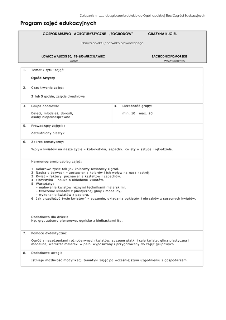 Za cznik nr ….. do zg oszenia obiektu do Ogólnopolskiej Sieci Zagród Edukacyjnych Program zaj edukacyjnych GOSPODARSTWO AGROTURYSTYCZNE „7OGRODÓW” GRA YNA KUGIEL Nazwa obiektu / nazwisko prowadz cego OWICZ WA ECKI 50, 78-650 MIROS AWIEC Adres 1. Temat / tytu zaj ZACHODNIOPOMORSKIE Województwo : Ogród Artysty 2. Czas trwania zaj : 3 lub 5 godzin, zaj cia dwudniowe 3. 4. Grupa docelowa: min. 10 Dzieci, m odzie , doro li, osoby niepe nosprawne 5. Liczebno grupy: max. 20 Prowadz cy zaj cia: Zatrudniony plastyk 6. Zakres tematyczny: Wp yw kwiatów na nasze ycie – kolorystyka, zapachy. Kwiaty w sztuce i r kodziele. Harmonogram/przebieg zaj : 1. 2. 3. 4. 5. Kolorowe ycie tak jak kolorowy Kwiatowy Ogród. Nauka o barwach – zestawienia kolorów i ich wp yw na nasz nastrój. Kwiat – faktury, poznawanie kszta tów i zapachów. Florystyka – nauka o uk adaniu kwiatów. Warsztaty: - malowanie kwiatów ró nymi technikami malarskimi, - tworzenie kwiatów z plastycznej gliny i modeliny, - wykonanie kwiatów z papieru. 6. Jak przed ycie kwiatów” – suszenie, uk adania bukietów i obrazków z suszonych kwiatów. Dodatkowo dla dzieci: Np. gry, zabawy plenerowe, ognisko z kie baskami itp. 7. Pomoce dydaktyczne: Ogród z nasadzeniami ró nobarwnych kwiatów, suszone p atki i ca e kwiaty, glina plastyczna i modelina, warsztat malarski w pe ni wyposa ony i przygotowany do zaj grupowych. 8. Dodatkowe uwagi: Istnieje mo liwo modyfikacji tematyki zaj po wcze niejszym uzgodnieniu z gospodarzem.