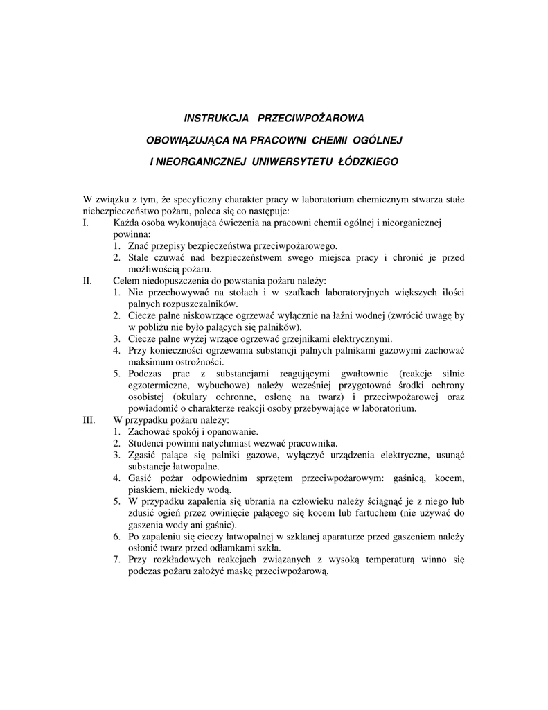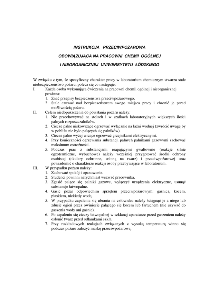INSTRUKCJA PRZECIWPOśAROWA OBOWIĄZUJĄCA NA PRACOWNI CHEMII OGÓLNEJ I NIEORGANICZNEJ UNIWERSYTETU ŁÓDZKIEGO W związku z tym, Ŝe specyficzny charakter pracy w laboratorium chemicznym stwarza stałe niebezpieczeństwo poŜaru, poleca się co następuje: I. KaŜda osoba wykonująca ćwiczenia na pracowni chemii ogólnej i nieorganicznej powinna: 1. Znać przepisy bezpieczeństwa przeciwpoŜarowego. 2. Stale czuwać nad bezpieczeństwem swego miejsca pracy i chronić je przed moŜliwością poŜaru. II. Celem niedopuszczenia do powstania poŜaru naleŜy: 1. Nie przechowywać na stołach i w szafkach laboratoryjnych większych ilości palnych rozpuszczalników. 2. Ciecze palne niskowrzące ogrzewać wyłącznie na łaźni wodnej (zwrócić uwagę by w pobliŜu nie było palących się palników). 3. Ciecze palne wyŜej wrzące ogrzewać grzejnikami elektrycznymi. 4. Przy konieczności ogrzewania substancji palnych palnikami gazowymi zachować maksimum ostroŜności. 5. Podczas prac z substancjami reagującymi gwałtownie (reakcje silnie egzotermiczne, wybuchowe) naleŜy wcześniej przygotować środki ochrony osobistej (okulary ochronne, osłonę na twarz) i przeciwpoŜarowej oraz powiadomić o charakterze reakcji osoby przebywające w laboratorium. III. W przypadku poŜaru naleŜy: 1. Zachować spokój i opanowanie. 2. Studenci powinni natychmiast wezwać pracownika. 3. Zgasić palące się palniki gazowe, wyłączyć urządzenia elektryczne, usunąć substancje łatwopalne. 4. Gasić poŜar odpowiednim sprzętem przeciwpoŜarowym: gaśnicą, kocem, piaskiem, niekiedy wodą. 5. W przypadku zapalenia się ubrania na człowieku naleŜy ściągnąć je z niego lub zdusić ogień przez owinięcie palącego się kocem lub fartuchem (nie uŜywać do gaszenia wody ani gaśnic). 6. Po zapaleniu się cieczy łatwopalnej w szklanej aparaturze przed gaszeniem naleŜy osłonić twarz przed odłamkami szkła. 7. Przy rozkładowych reakcjach związanych z wysoką temperaturą winno się podczas poŜaru załoŜyć maskę przeciwpoŜarową. PRZEPISY PORZĄDKOWE I BHP OBOWIĄZUJĄCE NA PRACOWNI CHEMII OGÓLNEJ I NIEORGANICZNEJ UNIWERSYTETU ŁÓDZKIEGO 1. Ćwiczenia rozpoczynają się i kończą zgodnie z podanym planem zajęć. Obecność w czasie ich trwania jest obowiązkowa. 2. W salach ćwiczeń mogą przebywać tylko osoby pracujące w danym terminie. Zabrania się wykonywania ćwiczeń poza okresem zajęć, w nieobecności pracownika. 3. W czasie zajęć naleŜy utrzymywać w salach porządek, zachować spokój i ciszę. 4. Zadania naleŜy wykonywać w miejscach wydzielonych na stałe, z wyjątkiem operacji wymagających pracy pod wyciągiem. 5. Dla umoŜliwienia utrzymania czystości kaŜdy winien posiadać w pracowni fartuch laboratoryjny, ścierkę i mydło. 6. Butelki i słoiki z odczynnikami chemicznymi naleŜy po uŜyciu odstawić na wyznaczone miejsce. Za porządek na sali odpowiadają dyŜurni. 7. Wszystkie czynności ze stęŜonymi kwasami czy zasadami oraz substancjami trującymi czy łatwopalnymi naleŜy bezwzględnie wykonywać pod wyciągiem. 8. Nie wolno próbować smaku Ŝadnych substancji chemicznych, nie wąchać odczynników bezpośrednio z butelki czy naczynia. Wącha się korek lub wachlującym ruchem ręki skierowuje się powietrze z parą badanej substancji w kierunku nosa. 9. Sączenie lub destylację pod próŜnią naleŜy wykonywać w naczyniu owiniętym ręcznikiem lub ścierką. 10. Nie wolno pipetować ustami Ŝrących cieczy lub lotnych związków organicznych. UŜywać do tego celu specjalnej nasadki zasysającej, nakładanej na górny koniec pipety. 11. Substancje Ŝrące wylewać do zlewu tylko w stanie rozcieńczonym puszczając przy tym silny strumień wody. Roztwory soli metali cięŜkich wlewamy do specjalnych pojemników. 12. Rozlane ciecze, rozsypane ciała stałe naleŜy natychmiast sprzątnąć. 13. Nie wolno wrzucać do zlewu ciał stałych (papierów, zapałek itp.), na które przeznaczono śmietniczki. W związku z tym sprzętu nie naleŜy myć piaskiem lub papierami, lecz środkami chemicznymi i szczotkami. 14. Miejsce pracy naleŜy przez cały czas utrzymywać w porządku i czystości. Zbędny sprzęt naleŜy umyć. Po skończeniu pracy, miejsce, na którym ją wykonano, naleŜy starannie sprzątnąć. 15. Sprzęt przechowywany w szafkach winien być zawsze czysty i ustawiony w takim porządku, aby wyjmowanie go nie sprawiało trudności. 16. Do lodówek i suszarek wolno wstawiać substancje tylko w naczyniach szklanych i porcelanowych. Wstawione naczynia nie mogą pozostawać w lodówce lub suszarce dłuŜej niŜ jeden dzień. 17. Na stołach laboratoryjnych nie wolno przechowywać Ŝadnych ksiąŜek, torebek i teczek. 18. W laboratorium nie wolno przechowywać odzieŜy, palić tytoniu i spoŜywać posiłków. UWAGA: nieprzestrzeganie ww. instrukcji moŜe spowodować ukaranie dyscyplinarne do usunięcia z pracowni włącznie.