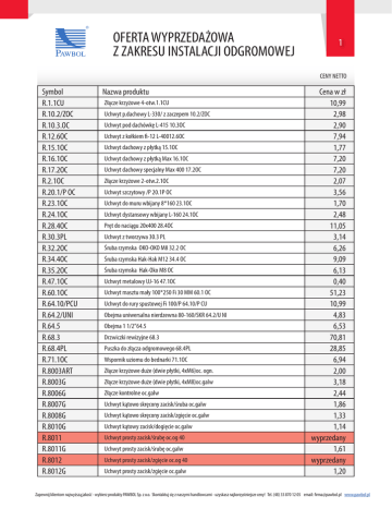 ® OFERTA WYPRZEDAŻOWA Z ZAKRESU INSTALACJI ODGROMOWEJ 1 CENY NETTO Symbol R.1.1CU R.10.2/ZOC R.10.3.OC R.12.6OC R.15.1OC R.16.1OC R.17.2OC R.2.1OC R.20.1/P OC R.23.1OC R.24.1OC R.28.4OC R.30.3PL R.32.2OC R.34.4OC R.35.2OC R.47.1OC R.60.1OC R.64.10/PCU R.64.2/UNI R.64.5 R.68.3 R.68.4PL R.71.1OC R.8003ART R.8003G R.8006G R.8007G R.8008G R.8010G R.8011 R.8011G R.8012 R.8012G Nazwa produktu Złącze krzyżowe 4-otw.1.1CU Uchwyt p.dachowy L-330/ z zaczepem 10.2/ZOC Uchwyt pod dachówkę L-415 10.3OC Uchwyt z kołkiem fi-12 L-40012.6OC Uchwyt dachowy z płytką 15.1OC Uchwyt dachowy z płytką Max 16.1OC Uchwyt dachowy specjalny Max 400 17.2OC Złącze krzyżowe 2-otw.2.1OC Uchwyt szczytowy /P 20.1P OC Uchwyt do muru wbijany 8*160 23.1OC Uchwyt dystansowy wbijany L-160 24.1OC Pręt do naciągu 20x400 28.4OC Uchwyt z tworzywa 30.3 PL Śruba rzymska OKO-OKO M8 32.2 OC Śruba rzymska Hak-Hak M12 34.4 OC Śruba rzymska Hak-Oko M8 OC Uchwyt metalowy UJ-16 47.1OC Uchwyt masztu mały 100*250 Fi 30 MM 60.1 OC Uchwyt do rury spustowej Fi 100/P 64.10/P CU Obejma uniwersalna nierdzewna 80-160/SKR 64.2/U NI Obejma 1 1/2”64.5 Drzwiczki rewizyjne 68.3 Puszka do złącza odgromowego 68.4PL Wspornik uziomu do bednarki 71.1OC Złącze krzyżowe duże (dwie płytki, 4xM6)oc. ogn. Złącze krzyżowe duże (dwie płytki, 4xM8)oc.galw Złącze kontrolne oc.galw Uchwyt kątowo skręcony zacisk/śruba oc.galw Uchwyt kątowo skręcony zacisk/zgięcie oc.galw Uchwyt kątowy zacisk/dogięcie oc.galw Uchwyt prosty zacisk/śrubę oc.og 40 Uchwyt prosty zacisk/śrubę oc.galw Uchwyt prosty zacisk/zgięcie oc.og 40 Uchwyt prosty zacisk/zgięcie oc.galw Cena w zł 10,99 2,98 2,90 7,94 1,77 7,20 7,20 2,07 3,56 1,70 2,48 11,05 3,14 6,26 9,09 6,13 0,40 51,23 10,99 4,83 6,53 70,81 28,85 6,94 2,00 3,18 2,44 1,86 1,33 1,14 wyprzedany 1,61 wyprzedany 1,20 Zapewnij klientom najwyższą jakość - wybierz produkty PAWBOL Sp. z o.o. Skontaktuj się z naszymi handlowcami - uzyskasz najkorzystniejsze ceny! Tel. (48) 33 870 12 05 email: [email protected] www.pawbol.pl 2 OFERTA WYPRZEDAŻOWA Z ZAKRESU INSTALACJI ODGROMOWEJ ® CENY NETTO R.8013 R.8013G R.8015 R.8015ART R.8015G R.8016G R.8017 R.8017G R.8018G R.8019G R.8020G R.8021G R.8022G R.8023G R.8024 R.8024G R.8025 R.8025G R.8026 R.8026G R.8027G R.8028 R.8028G R.8029G R.8030 R.8030G R.8037 R.8037G R.8038G R.8039 R.8039G R.8040G R.8045G R.8046G R.8047G Uchwyt gąsiorowy oc.og 15 Uchwyt gąsiorowy oc.galw Uchwyt na łączenie bednarki C-25 mm oc.og 50 Uchwyt na łączenie bednarki C-25 mm 4xM6 oc.og Uchwyt na łączenie bednarki C-25 mm oc.galw Uchwyt na łączenie bednarki C-30-35 mm oc.galw Uchwyt na łączenie bednarki C-40 mm oc.og 20 Uchwyt na łączenie bednarki C-40 mm oc.galw Uchwyt dachówkowy z/zg L=16 oc.galw Uchwyt dachówkowy z/zg L=28 oc.galw Uchwyt dachówkowy z/zg L=40 oc.galw Uchwyt dachówkowy skręcony z/zg L=16 oc.galw Uchwyt dachówkowy skręcony z/zg L=28 oc.galw Uchwyt dachówkowy skręcony z/zg L=40 oc.galw Uchwyt dachówkowy z/śr L=16 oc.og 10 Uchwyt dachówkowy z/śr L=16 oc.galw Uchwyt dachówkowy z/śr L=28 oc.og 10 Uchwyt dachówkowy z/śr L=28 oc.galw Uchwyt dachówkowy z/śr L=40 oc.og 10 Uchwyt dachówkowy z/śr L=40 oc.galw Uchwyt dacówkowy skręcony z/śr L=16 oc.galw Uchwyt dachówkowy skręcony z/ś L=28 oc.og 10 Uchwyt dachówkowy skręcony z/ś L=28 oc.galw Uchwyt dachówkowy skręcony z/śr L=40 oc.galw Uchwyt naciągowy M12 oc.og 20 Uchwyt naciągowy M12 oc.galw Uchwyt wbijany na drut z/ś fi 8, B=12, A=40oc.og50 Uchwyt wbijany na drut z/ś fi 8, B=12, A=40oc.galw Uchwyt wbijany na drut z/ś fi 8,B=160mm oc.galw Uchwyt wbijany na drut z/ś fi 8 ,B=210mm oc.og40 Uchwyt wbijany na drut z/ś fi 8 ,B=210mm oc.galw Uchwyt wbijany na drut z/ś fi 8,B=25, A=40 oc.galw Uchwyt z kołkiem rozporowym z/śr M12,L=16 oc.galw Uchwyt z kołkiem rozporowym z/śr M12,L=18 oc. galw Uchwyt z kołkiem rozporowym z/śrM12,L=21 oc.galw 2,83 2,41 2,19 1,00 1,54 2,29 wyprzedany 2,43 1,57 2,40 2,52 1,74 2,36 2,88 2,57 2,26 3,37 3,25 3,91 3,57 2,42 3,95 3,57 3,94 wyprzedany 4,31 wyprzedany 2,22 2,10 wyprzedany 3,07 3,63 3,29 3,02 3,38 Zapewnij klientom najwyższą jakość - wybierz produkty PAWBOL Sp. z o.o. Skontaktuj się z naszymi handlowcami - uzyskasz najkorzystniejsze ceny! Tel. (48) 33 870 12 05 email: [email protected] www.pawbol.pl ® OFERTA WYPRZEDAŻOWA Z ZAKRESU INSTALACJI ODGROMOWEJ 3 CENY NETTO R.8052ART R.8052G R.8061G R.8062 R.8062A R.8063 R.8063A R.8064G R.8065G R.8072 R.8072G R.8074 R.8074G R.8075G R.8076 R.8076G R.8077 R.8077G R.8078 R.8078G R.8081 R.8081G R.8082 R.8082G R.8083G R.8084G R.8085G R.8086G R.8087G R.8088 R.8088G R.8089G R.8090G R.8091 R.8093 Złącze krzyżowe małe (dwie płytki ) oc. ogn. Złącze krzyżowe małe (dwie płytki ) oc.galw Złącze kontrolne 4xM6 oc.galw Uchwyt na blachę kątowy skręcony B=130z/śr oc.og20 Uchwyt na blachę kątowy prosty B=130z/śr oc.og20 Uchwyt na blachę,kątowy,skręcony B=130 z/zg oc.og Uchwyt na blachę,kątowy,prosty B=130 z/zg oc.og2 Uchwyt na lepik B=12 z/zg oc.galw Uchwyt dachowy, szczytowy B=11cm, z/śr oc.galw Uchwyt na lepik B=7cm/wej.na drut 6 i 8 oc.og 25 Uchwyt na lepik B=7cm/wej. na drut 6 i 8 oc.galw Uchwyt gąsiorowy A=230mmz/zg oc.og 20 Uchwyt gąsiorowy A=230mmz/zg oc.galw Uchwyt gąsiorowy A=250mmz/zg oc.galw Uchwyt gąsiorowy A=210mm z/śr oc.og 20 Uchwyt gąsiorowy A=210mm z/śr oc.galw Uchwyt gąsiorowy A= 230 mm z/śr oc.og 20 Uchwyt gąsiorowy A= 230 mm z/śr oc.galw Uchwyt gąsiorowy A=250mmz/śr oc.og 20 Uchwyt gąsiorowy A=250mmz/śr oc.galw Uchwyt gąsiorowy ROBEN z/zg oc.og 30 Uchwyt gąsiorowy ROBEN z/zg oc.galw Uchwyt gąsiorowy ROBEN z/śr oc.og 30 Uchwyt gąsiorowy ROBEN z/śr oc.galw Uchwyt dachówkowy,regul 280/135mm oc.galw Uchwyt dachówkowy regulowany 420/135mm oc.galw Uchwyt dach,skręcony,regulowany A=28cm oc.galw Uchwyt dach,skręcony,regulowany A=42cm oc.galw Uchwyt dachówkowy,regulowany 280/135mm z/śr oc.galw Uchwyt dachówkowy regulowany 420/135mm z/ś