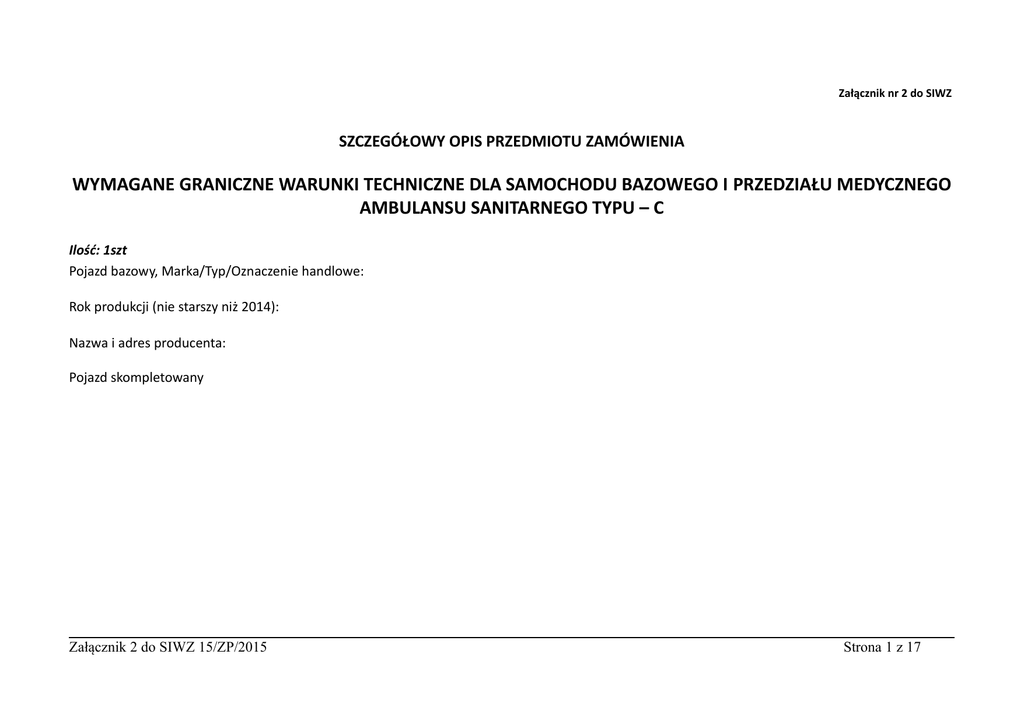 Załącznik nr 2 do SIWZ SZCZEGÓŁOWY OPIS PRZEDMIOTU ZAMÓWIENIA WYMAGANE GRANICZNE WARUNKI TECHNICZNE DLA SAMOCHODU BAZOWEGO I PRZEDZIAŁU MEDYCZNEGO AMBULANSU SANITARNEGO TYPU – C Ilość: 1szt Pojazd bazowy, Marka/Typ/Oznaczenie handlowe: Rok produkcji (nie starszy niż 2014): Nazwa i adres producenta: Pojazd skompletowany Załącznik 2 do SIWZ 15/ZP/2015 Strona 1 z 17 Lp . Wymagane warunki (parametry) dla samochodu bazowego, zabudowy medycznej i wyposażenia w sprzęt medyczny Warunek graniczny: wpisać spełnia / nie spełnia 1 2 3 Spełnienie warunków granicznych (opisuje Wykonawca) 4 NADWOZIE 1 Pojazd kompletny (bazowy) typu furgon, z nadwoziem samonośnym całkowicie stalowym zabezpieczonym antykorozyjnie - ocynkowane wszystkie drzwi, maska, błotniki, podłużnice i poprzecznice, z izolacją termiczną i akustyczną obejmującą ściany oraz sufit zapobiegająca skraplaniu się pary wodnej. 2 Ściany i sufit przedziału medycznego wyłożone łatwo zmywalnymi tłoczonymi profilami z tworzywa sztucznego w kolorze białym. Element nie wymagany - dodatkowo punktowany 3 DMC 3,88t 4 Częściowo przeszklony (wszystkie szyby termoizolacyjne) z możliwością ewakuacji pacjenta i personelu przez szybę drzwi tylnych. I bocznych. Szyba przednia z przyciemnianym pasem przy górnej krawędzi dopuszcza się, jako wyposażenie dodatkowe elektryczne ogrzewanie szyby przedniej). Półki nad przednią szybą. 5 Kabina kierowcy dwuosobowa zapewniająca miejsce pracy kierowcy zgodnie z PN EN 1789. Fotel kierowcy z pełną regulacją - regulacja wzdłużna, regulacja oparcia, regulacja wysokości. Dodatkowa lampka do czytania dla kierowcy i pasażera, wnęka nad przednią szybą przystosowana do montażu radioodtwarzacza lub radiotelefonu przewoźnego. Dodatkowa lampka do czytania montowana na słupku b w kabinie kierowcy. 6 W komorze silnika złącze rozruchowe (dodatkowy biegun dodatni), 7 Furgon - lakier w kolorze białym, 8 Nadwozie przystosowane do przewozu min. 4 osób w pozycji siedzącej oraz 1 osoba w pozycji leżącej na noszach. 9 Wysokość przedziału medycznego min.1,85 m Nie wymagany 10 Długość przedziału medycznego min.3,25m Załącznik 2 do SIWZ 15/ZP/2015 Strona 2 z 17 11 Szerokość przedziału medycznego min.1,75m 12 Drzwi tylne przeszklone otwierane na boki do kąta min.260 stopni, wyposażone w ograniczniki położenia drzwi, wys. min.1,75m, , 13 Drzwi boczne prawe przeszklone, przesuwane, z otwieraną szybą, z fabrycznym systemem elektrycznym wspomagającym zamykanie drzwi 14 Uchwyt sufitowy dla pasażera w kabinie kierowcy 15 Zewnętrzne okna przedziału medycznego pokryte w 2/3 wysokości folią półprzeźroczystą. 16 Częściowo przeszklona ścianka działowa oddzielająca kabinę kierowcy od przedziału medycznego wyposażona w drzwi przesuwne (nie dopuszcza się napędu elektrycznego otwierania i zamykania drzwi)o wysokości min. 1800 mm, umożliwiające poruszanie się pomiędzy pomieszczeniem medycznym a kabiną kierowcy na postoju. Konstrukcja i działanie drzwi – zgodnie z wymogami normy PN EN 1789. 17 Centralny zamek wszystkich drzwi (łącznie z drzwiami do zewnętrznego schowka) z alarmem obejmujący wszystkie drzwi pojazdu 18 Drzwi boczne lewe przesuwane do tyłu, bez szyby, z fabrycznym systemem elektrycznym wspomagającym zamykanie drzwi 19 Zewnętrzny schowek za lewymi drzwiami przesuwnymi zapewniający mocowania 2 szt. butli tlenowych 10 L z reduktorami, krzesełka kardiologicznego z systemem płozowym, noszy podbierakowych, deski ortopedycznej dla dorosłych, deski ortopedycznej dla dzieci, materaca próżniowego, kamizelki unieruchamiającej typu KED, min. 3 kasków ochronnych, torby opatrunkowej z dostępem również z przedziału medycznego, pojemnika reimplantacyjnego o pojemności min. 7l, pasów do desek, krzesełka i noszy oraz systemów unieruchamiających głowę, wyposażenia technicznego (np. łom, nożyce, toporek), klin blokowania koła 20 Zewnętrzny schowek techniczny wyposażony dodatkowo w wysuwaną szufladę o Załącznik 2 do SIWZ 15/ZP/2015 Nie Strona 3 z 17 pojemności min 40 l. (podać rozmiary długość, szerokość, wysokość, pojemność) szuflada umożliwiająca umieszczenie w niej lodówki o pojemności min. 7l, osobny schowek na pasy do desek, krzesełka i noszy. Oferowane rozwiązanie musi być stosowane seryjnie przez producenta i nie może być prototypem zaprojektowanym na potrzeby postępowania. Parametr nie wymagany, dodatkowo punktowany. W przypadku zaoferowania załączyć rysunek techniczny ze schematem schowka i zdjęcie schowka w wyprodukowanym ambulansie. wymagany 21 Poduszka powietrzna dla kierowcy i pasażera, poduszki boczne, kurtyny powietrzne 22 Stopień wejściowy tylny zintegrowany ze zderzakiem. 23 Stopień wejściowy boczny do przedziału ładunkowego wewnętrzny stały 24 Elektrycznie otwierane szyby boczne w kabinie kierowcy. 25 Światła boczne pozycyjne 26 Dzielone wsteczne lusterka zewnętrzne elektrycznie podgrzewane i regulowane, wbudowane światła kierunkowskazów 27 Pełnowymiarowe koło zapasowe zamontowane w koszu pod podwoziem 28 Zestaw narządzi z podnośnikiem, 29 Czujnik deszczu dostosowujący szybkość pracy wycieraczek przedniej szyby do intensywności opadów, czujnik zmierzchu automatycznie włączający światła mijania, 30 Układ wydechowy fabrycznie przedłużony do końca pojazdu przystosowany do pełnienia funkcji samochodu specjalnego sanitarnego 31 Przednie reflektory przeciwmgielne 32 Zbiornik paliwa o pojemności min. 75l. 33 Elektryczny interface do podłączenia urządzeń zewnętrznych (technologia CAN bus) Załącznik 2 do SIWZ 15/ZP/2015 Strona 4 z 17 34 Kabina kierowcy wyposażona w panel dotykowy typu „touch screen”, czytelny o przekątnej min. 7 cali sterujący następującymi funkcjami: Gwarancja na panel min 4 lata!!! Komunikacja pomiędzy panelami w kabinie kierowcy oraz przedziale medycznym a także pojazdem bazowym realizowana w sposób cyfrowy s