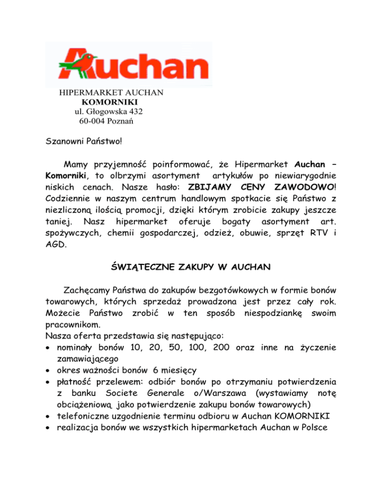 HIPERMARKET AUCHAN KOMORNIKI ul. Głogowska 432 60-004 Poznań Szanowni Państwo! Mamy przyjemność poinformować, że Hipermarket Auchan – Komorniki, to olbrzymi asortyment artykułów po niewiarygodnie niskich cenach. Nasze hasło: ZBIJAMY CENY ZAWODOWO! Codziennie w naszym centrum handlowym spotkacie się Państwo z niezliczoną ilością promocji, dzięki którym zrobicie zakupy jeszcze taniej. Nasz hipermarket oferuje bogaty asortyment art. spożywczych, chemii gospodarczej, odzież, obuwie, sprzęt RTV i AGD. ŚWIĄTECZNE ZAKUPY W AUCHAN Zachęcamy Państwa do zakupów bezgotówkowych w formie bonów towarowych, których sprzedaż prowadzona jest przez cały rok. Możecie Państwo zrobić w ten sposób niespodziankę swoim pracownikom. Nasza oferta przedstawia się następująco: nominały bonów 10, 20, 50, 100, 200 oraz inne na życzenie zamawiającego okres ważności bonów 6 miesięcy płatność przelewem: odbiór bonów po otrzymaniu potwierdzenia z banku Societe Generale o/Warszawa (wystawiamy notę obciążeniową jako potwierdzenie zakupu bonów towarowych) telefoniczne uzgodnienie terminu odbioru w Auchan KOMORNIKI realizacja bonów we wszystkich hipermarketach Auchan w Polsce Proponujemy Państwu korzystne warunki zakupu bonów towarowych w ramach negocjacji osobistych lub telefonicznych. Dodatkowo wzbogaciliśmy naszą ofertę „kartą SKARBONKĄ”, która pozwoli na uzyskanie dodatkowych korzyści podczas robienia zakupów. Na koncie Skarbonka można również gromadzić premię uzyskaną dzięki bonom towarowym Auchan. Zachęcamy Państwa do bezpośredniego kontaktu z nami. W każdej chwili czekamy na Państwa aby udzielić szczegółowych informacji na temat pełnej oferty, wyjaśnimy możliwości współpracy. Kontakt telefoniczny: Jolanta Kaźmierczak tel. 656-87-89 od godz. 08:00-15:00 Załączone zamówienie prosimy przesłać pod numer fax:0-61 656-86-57 adres e-mail:[email protected] Zapewniamy państwu miłą i fachową obsługę. Serdecznie Zapraszamy