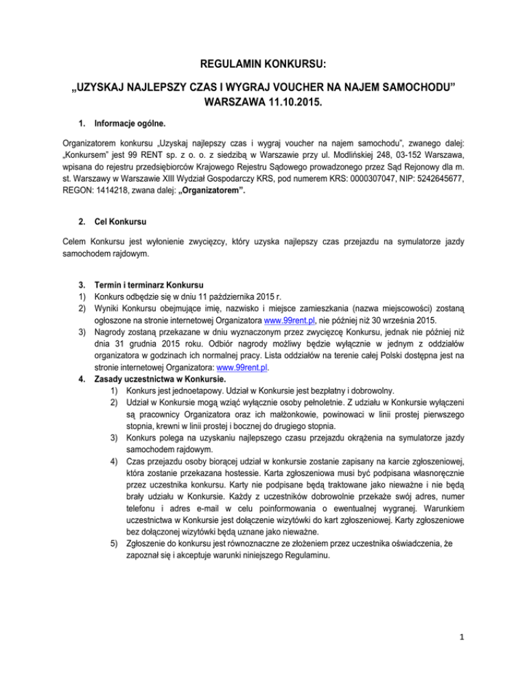 REGULAMIN KONKURSU: „UZYSKAJ NAJLEPSZY CZAS I WYGRAJ VOUCHER NA NAJEM SAMOCHODU” WARSZAWA 11.10.2015. 1. Informacje ogólne. Organizatorem konkursu „Uzyskaj najlepszy czas i wygraj voucher na najem samochodu”, zwanego dalej: „Konkursem” jest 99 RENT sp. z o. o. z siedzibą w Warszawie przy ul. Modlińskiej 248, 03-152 Warszawa, wpisana do rejestru przedsiębiorców Krajowego Rejestru Sądowego prowadzonego przez Sąd Rejonowy dla m. st. Warszawy w Warszawie XIII Wydział Gospodarczy KRS, pod numerem KRS: 0000307047, NIP: 5242645677, REGON: 1414218, zwana dalej: „Organizatorem”. 2. Cel Konkursu Celem Konkursu jest wyłonienie zwycięzcy, który uzyska najlepszy czas przejazdu na symulatorze jazdy samochodem rajdowym. 3. Termin i terminarz Konkursu 1) Konkurs odbędzie się w dniu 11 października 2015 r. 2) Wyniki Konkursu obejmujące imię, nazwisko i miejsce zamieszkania (nazwa miejscowości) zostaną ogłoszone na stronie internetowej Organizatora www.99rent.pl, nie później niż 30 września 2015. 3) Nagrody zostaną przekazane w dniu wyznaczonym przez zwycięzcę Konkursu, jednak nie później niż dnia 31 grudnia 2015 roku. Odbiór nagrody możliwy będzie wyłącznie w jednym z oddziałów organizatora w godzinach ich normalnej pracy. Lista oddziałów na terenie całej Polski dostępna jest na stronie internetowej Organizatora: www.99rent.pl. 4. Zasady uczestnictwa w Konkursie. 1) Konkurs jest jednoetapowy. Udział w Konkursie jest bezpłatny i dobrowolny. 2) Udział w Konkursie mogą wziąć wyłącznie osoby pełnoletnie. Z udziału w Konkursie wyłączeni są pracownicy Organizatora oraz ich małżonkowie, powinowaci w linii prostej pierwszego stopnia, krewni w linii prostej i bocznej do drugiego stopnia. 3) Konkurs polega na uzyskaniu najlepszego czasu przejazdu okrążenia na symulatorze jazdy samochodem rajdowym. 4) Czas przejazdu osoby biorącej udział w konkursie zostanie zapisany na karcie zgłoszeniowej, która zostanie przekazana hostessie. Karta zgłoszeniowa musi być podpisana własnoręcznie przez uczestnika konkursu. Karty nie podpisane będą traktowane jako nieważne i nie będą brały udziału w Konkursie. Każdy z uczestników dobrowolnie przekaże swój adres, numer telefonu i adres e-mail w celu poinformowania o ewentualnej wygranej. Warunkiem uczestnictwa w Konkursie jest dołączenie wizytówki do kart zgłoszeniowej. Karty zgłoszeniowe bez dołączonej wizytówki będą uznane jako nieważne. 5) Zgłoszenie do konkursu jest równoznaczne ze złożeniem przez uczestnika oświadczenia, że zapoznał się i akceptuje warunki niniejszego Regulaminu. 1 5. Zwycięzca Konkursu. 1) Zwycięzcą Konkursu jest uczestnik, który osiągnie najkrótszy czas przejazdu na symulatorze jazdy samochodem rajdowym. Premiowane nagrodami są również miejsca: 2 i 3. 2) Komisja konkursowa przyzna jedną nagrodę główną ufundowaną przez Organizatora oraz nagrodę za uzyskanie 2 i 3 czasu przejazdu. 3) Decyzje komisji konkursowej są ostateczne i nie przysługuje od nich odwołanie. 4) Zwycięzcy zostaną poinformowani o wygranej telefonicznie lub pocztą elektroniczną. Zwycięzca zostanie wyłoniony przez komisję konkursową do dnia 15 października 2015 roku. 6. Nagroda. 1) Nagrodą dla zwycięzcy konkursu będzie voucher na kwotę 779.82 zł na wynajem auta w segmencie E (Mercedes C200, BMW serii 3) oraz nagroda pieniężna w wysokości 86 zł. Uczestnik konkursu, który uzyska drugi najniższy czas przejazdu otrzyma voucher na kwotę 378 zł oraz nagrodę pieniężną w wysokości 38zł . Uczestnik konkursu, który uzyska trzeci czas przejazdu otrzyma voucher na kwotę 258 zł oraz nagrodę pieniężną w wysokości 26 zł. Wynajem może odbyć się wyłącznie w miastach, w których swoja siedzibę mają oddziały wypożyczalni aut 99rent. Spis wszystkich oddziałów, jak i specyfikacja aut dostępna jest na oficjalnej stronie internetowej wypożyczalni: www.99rent.pl. 2) Zwycięzcy Konkursu, poza uprawnieniem do uzyskania nagrody konkursowej, nie przysługują żadne inne roszczenia do Organizatora. 7. Postanowienia końcowe 1) Treść Regulaminu dostępna jest na stronie internetowej Organizatora www.99rent.pl oraz w jego siedzibie, pod adresem wskazanym w § 1. Organizator zastrzega sobie prawo zmiany Regulaminu, jeżeli nie wpłynie ona na pogorszenie warunków uczestnictwa w Konkursie, a także do przerwania Konkursu lub jego zakończenia bez dokonania wyboru zwycięzcy w każdym momencie bez podawania przyczyn. 2) Organizator jest uprawniony do zmiany postanowień niniejszego Regulaminu w przypadku zmiany przepisów prawnych lub innych istotnych zdarzeń mających wpływ na organizację Konkursu, w szczególności w każdym czasie może Konkurs przedłużyć, skrócić bądź przerwać. 3) Administratorem danych osobowych zgromadzonych w związku z Konkursem jest Organizator, który będzie miał prawo je powierzyć oraz udostępnić innym podmiotom, z którymi będzie współpracować przy realizacji Konkursu i przy podejmowanych akcjach reklamowych lub marketingowych w przyszłości. 4) Nagroda w konkursie stanowi przychód w rozumieniu przepisów ustawy z dnia 26 lipca 1991 r. o podatku dochodowym od osób fizycznych (Dz. U. z 2012 r., Nr 361, tj. ze zm.). Zgłoszenie się do Konkursu jest równoznaczne z akceptacją niniejszego Regulaminu. 5) Organizator nie ponosi odpowiedzialności za szkody (zarówno majątkowe jak i niemajątkowe) poniesione przez Uczestnika Konkursu bądź przez osoby trzecie, w związku z uczestnictwem w Konkursie. 6) Do spraw nieujętych w niniejszym regulaminie, stosuje się odpowiednio przepisy Kodeksu cywilnego oraz ustawy o prawie autorskim i prawach pokrewnych. 2