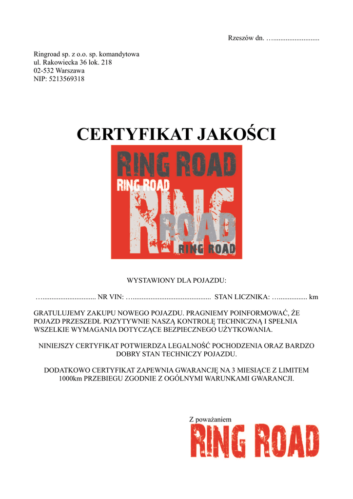 Rzeszów dn. ….......................... Ringroad sp. z o.o. sp. komandytowa ul. Rakowiecka 36 lok. 218 02-532 Warszawa NIP: 5213569318 CERTYFIKAT JAKOŚCI WYSTAWIONY DLA POJAZDU: ….............................. NR VIN: …............................................ STAN LICZNIKA: …................ km GRATULUJEMY ZAKUPU NOWEGO POJAZDU. PRAGNIEMY POINFORMOWAĆ, ŻE POJAZD PRZESZEDŁ POZYTYWNIE NASZĄ KONTROLĘ TECHNICZNĄ I SPEŁNIA WSZELKIE WYMAGANIA DOTYCZĄCE BEZPIECZNEGO UŻYTKOWANIA. NINIEJSZY CERTYFIKAT POTWIERDZA LEGALNOŚĆ POCHODZENIA ORAZ BARDZO DOBRY STAN TECHNICZY POJAZDU. DODATKOWO CERTYFIKAT ZAPEWNIA GWARANCJĘ NA 3 MIESIĄCE Z LIMITEM 1000km PRZEBIEGU ZGODNIE Z OGÓLNYMI WARUNKAMI GWARANCJI. Z poważaniem