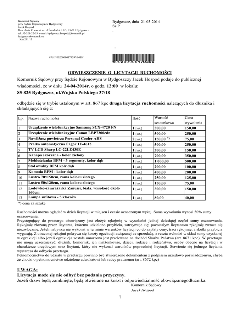 Komornik Sądowy przy Sądzie Rejonowym w Bydgoszczy Jacek Hospod Kancelaria Komornicza ul.Śniadeckich 9/3, 85-011 Bydgoszcz tel. 52-321-22-53 e-mail: [email protected] bydgoszczkomornik.eu Km 291/13 Bydgoszcz, dnia 21-03-2014 Sz P . #AH *0020000017939*/0419/ *0020000017939* OBWIESZCZENIE O LICYTACJI RUCHOMOŚCI Komornik Sądowy przy Sądzie Rejonowym w Bydgoszczy Jacek Hospod podaje do publicznej wiadomości, że w dniu 24-04-2014r. o godz. 12:00 w lokalu: 85-825 Bydgoszcz, ul.Wojska Polskiego 37/18 odbędzie się w trybie ustalonym w art. 867 kpc druga licytacja ruchomości należących do dłużnika i składających się z: 1 [szt.] 1 [szt.] 2 [szt.] 1 [szt.] 1 [szt.] 1 [szt.] 1 [szt.] 1 [szt.] 1 [szt.] 1 [szt.] 1 [szt.] 1 [szt.] Wartość szacunkowa 300,00 500,00 150,00 *) 500,00 300,00 700,00 1 000,00 200,00 400,00 250,00 150,00 300,00 Cena wywołania 150,00 250,00 75,00 250,00 150,00 350,00 500,00 100,00 200,00 125,00 75,00 150,00 1 [szt.] 80,00 40,00 Lp. Nazwa ruchomości Ilość 1 2 3 4 5 6 7 8 9 10 11 12 Urządzenie wielofunkcyjne Samsung SCX-4720 FN Urządzenie wielofunkcyjne Canon LBP7200cdn Nawilżacz powietrza Personal Cooler AH8 Pralka automatyczna Fagor 1F-4613 TV LCD Sharp LC-22LE430E Kanapa skórzana - kolor zielony Meblościanka BFM - 3 segmenty, kolor dąb Stół owalny BFM kolr dąb Komoda BFM - kolor dąb Lustro 70x150cm, rama koloru złotego Lustro 50x120cm, rama koloru złotego Lodówko-zamrażarka Zanussi, biała, wysokość około 160cm Lampa sufitowa - 5 kloszów 13 *) cena za sztukę Ruchomości można oglądać w dzień licytacji w miejscu i czasie oznaczonym wyżej. Suma wywołania wynosi 50% sumy oszacowania. Przystępujący do przetargu obowiązany jest złożyć rękojmię w wysokości jednej dziesiątej części sumy oszacowania. Rękojmię złożoną przez licytanta, któremu udzielono przybicia, zatrzymuje się; pozostałym licytantom rękojmię zwraca się niezwłocznie. Jeżeli nabywca nie wykonał w terminie warunków licytacji co do zapłaty ceny, traci rękojmię, a skutki przybicia wygasają. Z utraconej rękojmi pokrywa się koszty egzekucji związanej ze sprzedażą, a reszta wchodzi w skład sumy uzyskanej w egzekucji albo jeżeli egzekucja została umorzona jest przelewana na dochód Skarbu Państwa (art. 8671 kpc). W przetargu nie mogą uczestniczyć: dłużnik, komornik, ich małżonkowie, dzieci, rodzice i rodzeństwo, osoby obecne na licytacji w charakterze urzędowym oraz licytant, który nie wykonał warunków poprzedniej licytacji. Stawienie się jednego licytanta wystarcza do odbycia przetargu. Pełnomocnictwo do udziału w przetargu powinno być stwierdzone dokumentem z podpisem urzędowo poświadczonym, chyba że chodzi o pełnomocnictwo udzielone adwokatowi lub radcy prawnemu (art. 8672 kpc) UWAGA: Licytacja może się nie odbyć bez podania przyczyny. Jeżeli drzwi będą zamknięte, będą otwierane na koszt i odpowiedzialność obowiązanegodłużnika. Komornik Sądowy Jacek Hospod 1 Adresat oryginału: . Do wiadomości: 1. a/a 2