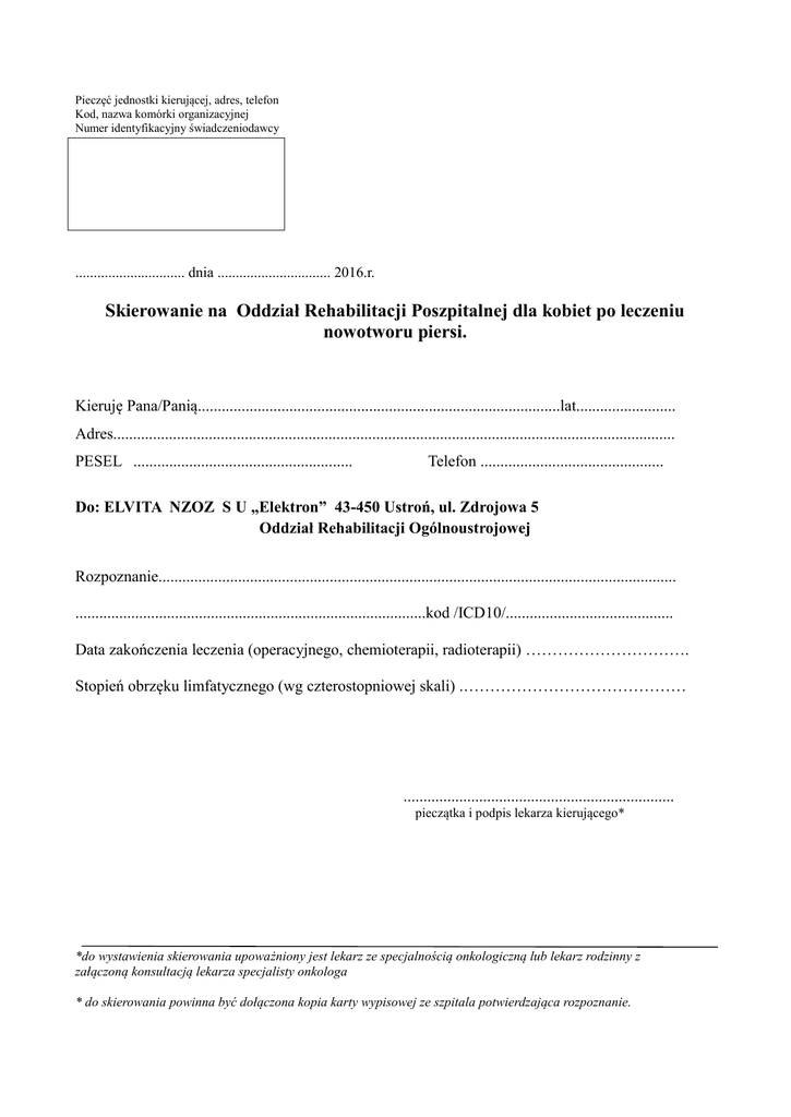 Pieczęć jednostki kierującej, adres, telefon Kod, nazwa komórki organizacyjnej Numer identyfikacyjny świadczeniodawcy .............................. dnia ............................... 2016.r. Skierowanie na Oddział Rehabilitacji Poszpitalnej dla kobiet po leczeniu nowotworu piersi. Kieruję Pana/Panią...........................................................................................lat......................... Adres............................................................................................................................................. PESEL ....................................................... Telefon .............................................. Do: ELVITA NZOZ S U „Elektron” 43-450 Ustroń, ul. Zdrojowa 5 Oddział Rehabilitacji Ogólnoustrojowej Rozpoznanie.................................................................................................................................. ........................................................................................kod /ICD10/.......................................... Data zakończenia leczenia (operacyjnego, chemioterapii, radioterapii) …………………………. Stopień obrzęku limfatycznego (wg czterostopniowej skali) .…………………………………… .................................................................... pieczątka i podpis lekarza kierującego* *do wystawienia skierowania upoważniony jest lekarz ze specjalnością onkologiczną lub lekarz rodzinny z załączoną konsultacją lekarza specjalisty onkologa * do skierowania powinna być dołączona kopia karty wypisowej ze szpitala potwierdzająca rozpoznanie.