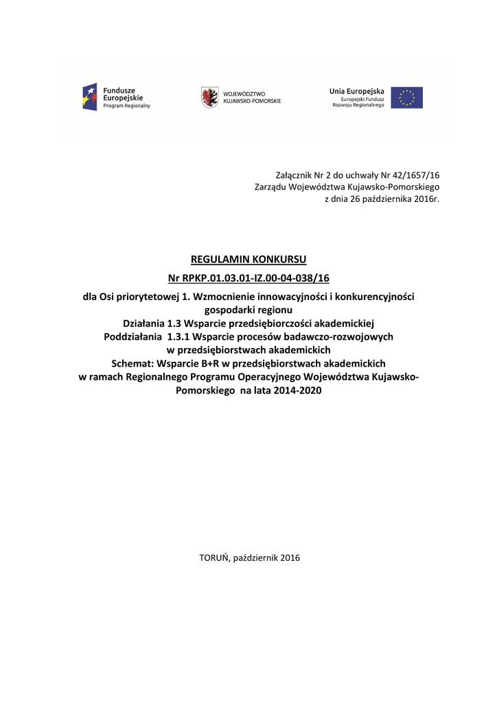 Załącznik Nr 2 do uchwały Nr 42/1657/16 Zarządu Województwa Kujawsko-Pomorskiego z dnia 26 października 2016r. REGULAMIN KONKURSU Nr RPKP.01.03.01-IZ.00-04-038/16 dla Osi priorytetowej 1. Wzmocnienie innowacyjności i konkurencyjności gospodarki regionu Działania 1.3 Wsparcie przedsiębiorczości akademickiej Poddziałania 1.3.1 Wsparcie procesów badawczo-rozwojowych w przedsiębiorstwach akademickich Schemat: Wsparcie B+R w przedsiębiorstwach akademickich w ramach Regionalnego Programu Operacyjnego Województwa KujawskoPomorskiego na lata 2014-2020 TORUŃ, październik 2016 Wykaz stosowanych skrótów EFRR Europejski Fundusz Rozwoju Regionalnego GWD Generator Wniosków o Dofinansowanie Instytucja Zarządzająca RPO/ IZ RPO Instytucja Zarządzająca Regionalnym Programem Operacyjnym Województwa Kujawsko-Pomorskiego na lata 2014-2020 IOK Instytucja Organizująca Konkurs KOP Komisja Oceny Projektów MIiR Minister Infrastruktury i Rozwoju (obecnie Minister Rozwoju) RPO WK-P 2014-2020 Regionalny Program Operacyjny Województwa KujawskoPomorskiego na lata 2014-2020 System oceny projektów System oceny projektów w ramach Regionalnego Programu Operacyjnego Województwa Kujawsko-Pomorskiego na lata 2014-2020 SzOOP Szczegółowy Opis Osi Priorytetowych Regionalnego Programu Operacyjnego Województwa Kujawsko-Pomorskiego na lata 2014-2020 Wniosek o dofinansowanie projektu Wniosek o dofinansowanie projektu z Europejskiego Funduszu Rozwoju Regionalnego w ramach Regionalnego Programu Operacyjnego Województwa Kujawsko-Pomorskiego na lata 2014-2020 Zarząd Województwa Zarząd Województwa Kujawsko-Pomorskiego 2 SPIS TREŚCI Rozdział 1. Czym jest Regulamin konkursu? .................................................................................... 4 Rozdział 2. Podstawa prawna, dokumenty programowe oraz kwalifikowalność wydatków w ramach projektu ............................................................................................................................... 4 Rozdział 3. Podstawowe informacje dotyczące konkursu ............................................................... 9 Podrozdział 3.1. Nazwa i adres instytucji organizującej konkurs ............................................. 9 Podrozdział 3.2. Przedmiot konkursu....................................................................................... 9 Podrozdział 3.3. Typy projektów .............................................................................................. 9 Podrozdział 3.4. Typ beneficjenta ............................................................................................ 9 Podrozdział 3.5. Kwota przeznaczona na dofinansowanie projektów w konkursie .............. 10 Podrozdział 3.6. Limity dotyczące wartości projektu oraz wysokości dofinansowania ......... 10 Podrozdział 3.7 Forma konkursu ............................................................................................ 11 Podrozdział 3.8. Planowany termin rozstrzygnięcia konkursu .............................................. 11 Podrozdział 3.9. Wskaźniki produktu i rezultatu.................................................................... 11 Podrozdział 3.10. Anulowanie konkursu ................................................................................ 13 Rozdział 4. Termin, miejsce i forma składania wniosków o dofinansowanie projektu. ................ 14 Rozdział 5. Kryteria wyboru projektów wraz z podaniem ich znaczenia ....................................... 17 Podrozdział 5.1. Odniesienie wnioskodawcy do wybranych kryteriów wyboru projektów .. 17 Podrozdział 5.2. Wyjaśnienie dotyczące wybranych kryteriów wyboru projektów .............. 17 Rozdział 6. Etapy weryfikacji i wybór projektów do dofinansowania ............................................ 17 Podrozdział 6.1. Badanie wymogów formalnych ................................................................... 18 Podrozdział 6.2. Etap oceny formalno-merytorycznej ........................................................... 19 Podrozdział 6.3. Rozstrzygnięcie konkursu ............................................................................ 21 Podrozdział 6.4. Lista rezerwowa ........................................................................................... 22 Rozdział 7. Środki odwoławcze przysługujące wnioskodawcy....................................................... 23 Rozdział 8. Umowa o dofinansowanie projektu ............................................................................ 25 Rozdział 9. Forma i sposób udzielania wnioskodawcy wyjaśnień w kwestiach dotyczących konkursu ......................................................................................................................................... 25 Rozdział 10. Załączniki do Regulaminu konkursu ........................................................................... 26 3 Rozdział 1. Czym jest Regulamin konkursu? Regulamin konkursu określa zakres konkursu, zasady jego organizacji, warunki uczestnictwa, kryteria i sposób wyboru projektów, a także pozostałe informacje niezbędne podczas przygotowywania dokumentacji projektowej. W sprawach nieuregulowanych w niniejszym Regulaminie1 zastosowanie mają odpowiednie zasady wynikające z RPO WK-P 2014-2020, SzOOP, Systemu oceny projektów (dostępnych na stronie internetowej www.rpo.kujawsko-pomorskie.pl w zakładce: „zapoznaj się z prawem i dokumentami” oraz pod ogłoszeniem o konkursie), a także z odpowiednich przepisów prawa unijnego i krajowego. Rozdział 2. Podstawa prawna, dokumenty programowe oraz kwalifikowalność wydatków w ramach projektu 1. Podstawa prawna, w szczególności: 1) Rozporządzenie Parlamentu Europejskiego i Rady (UE) nr 1303/2013 z dnia 17 grudnia 2013 r. ustanawiające wspólne przepisy dotyczące Europejskiego Funduszu Rozwoju Regionalnego, Europejskiego Funduszu Społecznego, Funduszu Spójności, Europejskiego Funduszu Rolnego