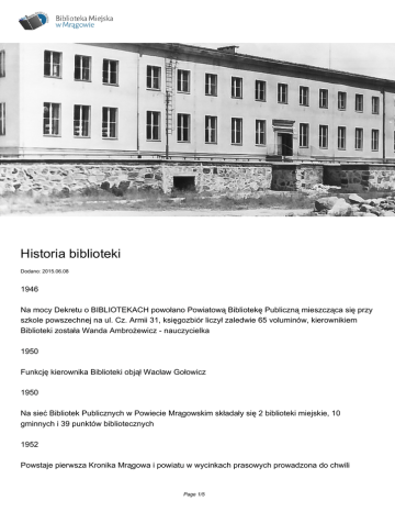 Historia biblioteki Dodano: 2015.06.08 1946 Na mocy Dekretu o BIBLIOTEKACH powołano Powiatową Bibliotekę Publiczną mieszcząca się przy szkole powszechnej na ul. Cz. Armii 31, księgozbiór liczył zaledwie 65 voluminów, kierownikiem Biblioteki została Wanda Ambrożewicz - nauczycielka 1950 Funkcję kierownika Biblioteki objął Wacław Gołowicz 1950 Na sieć Bibliotek Publicznych w Powiecie Mrągowskim składały się 2 biblioteki miejskie, 10 gminnych i 39 punktów bibliotecznych 1952 Powstaje pierwsza Kronika Mrągowa i powiatu w wycinkach prasowych prowadzona do chwili Page 1/5 obecnej 1955 Połączenie bibliotek, Powiatowej i Miejskiej w jedną placówkę zwaną Powiatowa i Miejska Biblioteka Publiczna, przeniesienie do budynku przy ul. Roosevelta 17 1963 PiMBP przeniesiono do pomieszczeń w nowo wybudowanym Powiatowym Domu Kultury, w którym jest do chwili obecnej 1973 Powstaje pierwsza filia miejska Nr 1 na oś. Parkowym 1975 Powrót do nazwy Miejska Biblioteka Publiczna w wyniku podziału administracyjnego kraju. Do nowo utworzonego woj. suwalskiego odeszła Miejsko-Gminna Biblioteka w Mikołajkach z filiami 1981 Ppowstała praca magisterska "Działalność regionalna Biblioteki Publicznej w Mrągowie, w latach 1950-1979 r." /aut. Elżbieta Dołgosz/ 1983 Rozpoczyna działalność Filia Nr 2 Publiczno-Szpitalna 1983 Powstała praca magisterska: "Działalność bibliotekarska Wacława Gołowicza" /aut. Jolanta Duszak/ 1984 Uroczyste nadanie Bibliotece imienia Wacława Gołowicza długoletniego dyrektora, bibliotekarza 1987 Page 2/5 Powstał Punkt Książki Mówionej na bazie kaset z WBP w Olsztynie 1990 W wyniku ustawy o samorządach filie wiejskie przeszły na utrzymanie gminy 1992 Miejska Biblioteka Publiczna przestała pełnić funkcję biblioteki rejonowej 1994 Powstaje Filia Nr 3 na ul. Księżycowej 1996 50-lecie istnienia MBP 1998 Biblioteka zostaje połączona z domem kultury 1998 Likwidacja Filii Nr 3 2000 Likwidacja Filii Nr 1 na oś. Parkowym 2001 Rozpoczęto proces komputeryzacji zbiorów program SOWA 2002 Udostępniono czytelnikom komputery z dostępem do Internetu 2002 Informacja o zbiorach Biblioteki w Internecie Page 3/5 2002 Likwidacja Filii Nr 2 Publiczno-Szpitalnej 2004 Powstała praca magisterska: "Działalność Miejskiej Biblioteki Publicznej w latach 1946-2000" /aut. Daniel Cierpiał/ 2005 Uruchomienie strony www 2006 60.lecie MBP 2006 Kompleksowa zmiana wystroju wnętrza Oddziału dla Dzieci 2007 Kompleksowa zmiana wystroju wnętrza Czytelni dla Dorosłych 2008 Kompleksowa zmiana wystroju wnętrza Wypożyczalni dla Dorosłych 2008 Wydanie Almanachu Poezji Mrągowskiej "Tutaj się ze sobą mijamy" 2009 Udostępnienie katalogu on-line 2010 Komputeryzacja obsługi czytelników i wypożyczeń Page 4/5 2012 Przystąpienie do ogólnopolskiego portalu e-usług "w.bibliotece.pl" 2013 -2015 Dotacja 680 tyś. na modernizację biblioteki w ramach "Programu Wieloletniego Kultura+ Priorytet Biblioteka+ Infrastruktura bibliotek" 2016 70.lecie Powierzenie zadań w zakresie prowadzenia powiatowej biblioteki publicznej /od 1 paźdździernika/ Dotacja 22 780 tyś. z programu "Kraszewski. Komputery dla bibliotek 2016" Oprac. Barbara SZYMAŃSKA Źródło: Page 5/5