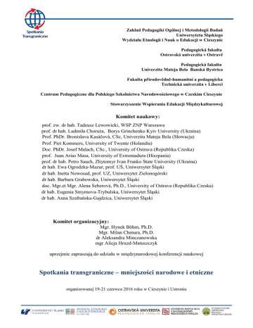 Zakład Pedagogiki Ogólnej i Metodologii Badań Uniwersytetu Śląskiego Wydziału Etnologii i Nauk o Edukacji w Cieszynie Pedagogická fakulta Ostravská univerzita v Ostravě Pedagogická fakulta Univerzita Mateja Bela Banská Bystrica Fakulta přírodovědně-humanitní a pedagogicka Technická univerzita v Liberci Centrum Pedagogiczne dla Polskiego Szkolnictwa Narodowościowego w Czeskim Cieszynie Stowarzyszenie Wspierania Edukacji Międzykulturowej Komitet naukowy: prof. zw. dr hab. Tadeusz Lewowicki, WSP ZNP Warszawa prof. dr hab. Ludmiła Choruża, Borys Grinchenko Kyiv University (Ukraina) Prof. PhDr. Bronislava Kasáčová, CSc, Univerzita Mateja Bela (Słowacja) Prof. Piet Kommers, University of Twente (Holandia) Doc. PhDr. Josef Malach, CSc., University of Ostrava (Republika Czeska) prof. Juan Arias Masa, University of Extremadura (Hiszpania) prof. dr hab. Petro Sauch, Zhytomyr Ivan Franko State University (Ukraina) dr hab. Ewa Ogrodzka-Mazur, prof. UŚ, Uniwersytet Śląski dr hab. Inetta Nowosad, prof. UZ, Uniwersytet Zielonogórski dr hab. Barbara Grabowska, Uniwersytet Śląski doc. Mgr.et Mgr. Alena Seberová, Ph.D., University of Ostrava (Republika Czeska) dr hab. Eugenia Smyrnova-Trybulska, Uniwersytet Śląski dr hab. Anna Szafrańska-Gajdzica, Uniwersytet Śląski Komitet organizacyjny: Mgr. Hynek Böhm, Ph.D. Mgr. Milan Chmura, Ph.D. dr Aleksandra Minczanowska mgr Alicja Hruzd-Matuszczyk uprzejmie zapraszają do udziału w międzynarodowej konferencji naukowej Spotkania transgraniczne – mniejszości narodowe i etniczne organizowanej 19-21 czerwca 2016 roku w Cieszynie i Ustroniu Mamy przyjemność zaprosić na pierwszą sesję naukową inicjującą cykl: Spotkania transgraniczne organizowaną przez cieszyński ośrodek akademicki wraz z partnerami z zagranicy. Głównym obszarem dyskusji uczynimy zagadnienia dotyczące mniejszości narodowych i etnicznych zarówno w kontekście rozważań teoretycznych, jak i problemów i rozwiązań praktycznych. Proponujemy kilka obszarów tematycznych, kluczowych dla aktualnej problematyki dotyczącej podejmowanych zagadnień: teoretyczne i metodologiczne konteksty funkcjonowania mniejszości narodowych i etnicznych – np. tożsamość, asymilacja, emancypacja jako kategorie kluczowe w ostatnich dekadach, rozwiązania praktyczne – propozycje, modele, działania i ich efekty, polityka /i politycy wobec problematyki mniejszości, szkoła w środowiskach zróżnicowanym kulturowo – wokół zagadnień specyfiki pracy nauczyciela, funkcjonowania uczniów i rodziców, kultura mniejszości narodowych i etnicznych. Mamy nadzieję, że proponowana tematyka, forma spotkania oraz krajobraz i urok Ziemi Cieszyńskiej zachęcą do wzięcia udziału w spotkaniu naukowym. Wprowadzenie Niemal truizmem staje się aktualnie stwierdzenie, że współczesna cywilizacja nie sprzyja kontaktom społecznym. Tempo życia, sposób odbierania i przekazywania informacji – wszystko to przyczynia się do rozluźnienia więzi – zarówno na poziomie rodziny, jak i społeczności lokalnych, czy szerzej całych społeczeństw. Jednocześnie powoływane są specjalne programy (takie jak np. Erasmus) umożliwiające kontakt z inną kulturą, które stają się przyczynkiem do poznania Innego, ale również oswojenia nowej przestrzeni. Programy, których celem jest inicjowanie spotkań. Podstawowym warunkiem spotkania jest zatrzymanie, które umożliwia kontakt z drugim człowiekiem lub dziełem. Ważne jest miejsce owego zatrzymania, przestrzeń spotkania, która nie jest jednak tylko miejscem interakcji, ale również jest elementarnym składnikiem tożsamości. Ziemia cieszyńska jest miejscem, w którym przekraczanie granic jest elementem wielowiekowej tradycji. Transgraniczność spotkania w Cieszynie ma bez wątpienia charakter interdyscyplinarny. Granica państwa, stykanie się kultur, narodów, wyznań czy religii to zagadnienia, które rozpatrywane teoretycznie w innych miejscach tu mają swój wymiar praktyczny, wpisany w codzienność trwania kolejnych pokoleń mieszkańców Śląska cieszyńskiego. Mamy nadzieję, że idea zaproponowanego przez nas spotkania naukowego spotka się z Państwa przychylnością. Zgodnie z tradycją istniejącą w naszym Zespole, chcemy zaprosić Państwa do aktywnego udziału nie tylko w części naukowej, ale również do bliższego poznania uroków cieszyńskiej ziemi, spotkania z jej kulturą i tradycją. Łączymy wyrazy szacunku i zapraszamy do uczestnictwa Komitet Naukowy i Organizacyjny Konferencji dr hab. Ewa Ogrodzka-Mazur prof. UŚ dr hab. Anna Szafrańska-Gajdzica Mgr. Hynek Böhm, Ph.D. Mgr. Milan Chmura, Ph.D. dr Aleksandra Minczanowska mgr Alicja Hruzd-Matuszczyk