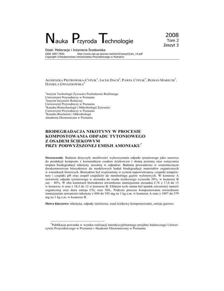 N auka P rzyroda T echnologie 2008 Tom 2 Zeszyt 3 Dział: Melioracje i InŜynieria Środowiska ISSN 1897-7820 http://www.npt.up-poznan.net/tom2/zeszyt3/art_14.pdf Copyright ©Wydawnictwo Uniwersytetu Przyrodniczego w Poznaniu AGNIESZKA PIOTROWSKA-CYPLIK1, JACEK DACH2, PAWEŁ CYPLIK3, ROMAN MARECIK3, DANIELA GWIAZDOWSKA4 1 Instytut Technologii śywności Pochodzenia Roślinnego Uniwersytet Przyrodniczy w Poznaniu 2 Instytut InŜynierii Rolniczej Uniwersytet Przyrodniczy w Poznaniu 3 Katedra Biotechnologii i Mikrobiologii śywności Uniwersytet Przyrodniczy w Poznaniu 4 Katedra Biochemii i Mikrobiologii Akademia Ekonomiczna w Poznaniu BIODEGRADACJA NIKOTYNY W PROCESIE KOMPOSTOWANIA ODPADU TYTONIOWEGO Z OSADEM ŚCIEKOWYM PRZY PODWYśSZONEJ EMISJI AMONIAKU* Streszczenie. Badania dotyczyły moŜliwości wykorzystania odpadu tytoniowego jako surowca do produkcji kompostu z komunalnym osadem ściekowym i słomą pszenną oraz oznaczania stopnia biodegradacji nikotyny zawartej w odpadzie. Badania prowadzono w izotermicznym dwukomorowym bioreaktorze do modelowych badań biodegradacji materiałów organicznych w warunkach tlenowych. Bioreaktor był wyposaŜony w system napowietrzania, czujniki temperatury i czujniki pH oraz zespół czujników do monitoringu gazów wylotowych. W komorze A zawartość odpadu tytoniowego w stosunku do osadu ściekowego wynosiła 20%, w komorze B zaś – 40%. W obu komorach bioreaktora stwierdzono zmniejszenie stosunku C:N z 17,6 do 13 w komorze A oraz z 18,3 do 12 w komorze B. Efektem tych zmian był spadek zawartości materii organicznej oraz duŜa emisja CO2 oraz NH3. Podczas procesu kompostowania stwierdzono zmniejszenie zawartości nikotyny z 884 do 195 mg na 1 kg s.m. w komorze A oraz z 1897 do 379 mg na 1 kg s.m. w komorze B. Słowa kluczowe: nikotyna, odpady tytoniowe, osad ściekowy kompostowanie, emisje gazowe * Publikacja powstała w wyniku realizacji interdyscyplinarnego projektu badawczego Uniwersytetu Przyrodniczego w Poznaniu i Akademii Ekonomicznej w Poznaniu. 2 Piotrowska-Cyplik A., Dach J., Cyplik P., Marecik R., Gwiazdowska D., 2008. Biodegradacja nikotyny w procesie kompostowania odpadu tytoniowego z osadem ściekowym przy podwyŜszonej emisji amoniaku. Nauka Przyr. Technol. 2, 3, #14. Wstęp Przyrodnicze wykorzystanie odpadów organicznych, w pełni uzasadnione ekonomicznie, niesie za sobą wiele pozytywnych zmian w środowisku. Do obiegu biologicznego zostają włączone olbrzymie zasoby substancji organicznych i składników mineralnych, które w warunkach deponowania stanowią powaŜne zagroŜenie dla środowiska (JĘDRCZAK 2007). Do grupy odpadów przemysłowych pochodzenia organicznego naleŜą odpady tytoniowe, które powstają w róŜnych procesach cyklu produkcyjnego tytoniu i papierosów. Charakteryzują się one duŜą przydatnością do uŜytkowania przyrodniczego i mogą być zagospodarowywane w róŜny sposób (BRISKI i IN. 2003, MEHER i IN. 1995). Najtańszym sposobem zagospodarowania pyłu tytoniowego jest stosowanie go bezpośrednio w nawoŜeniu, jednak sposób ten nie jest wskazany ze względów technicznych (pylenie podczas transportu, podatność na erozję wietrzną, trudności z dokładnym wysiewem i wymieszaniem z glebą). Pył tytoniowy, jak kaŜdy pył organiczny, jest równieŜ niebezpieczny dla zdrowia ludzi. Wdychanie go moŜe prowadzić do powstawania chorób alergicznych i schorzeń immunotoksycznych. Z tych powodów pył ten sprasowuje się w brykiety. Ich zagospodarowanie jest powaŜnym problemem dla środowiska. Celem pracy było określenie moŜliwości wykorzystania odpadów tytoniowych jako surowca do kompostowania oraz określenie ich wpływu na emisje gazowe i zmiany składników nawozowych w gotowym kompoście, jak równieŜ określenie stopnia biodegradacji zawartej w odpadach nikotyny. Materiały i metody Do badań wykorzystano wcześniej namoczone w wodzie zbrykietowane odpady tytoniowe, odwodniony osad ściekowy z komunalnej oczyszczalni ścieków oraz słomę pszenną. Kompostowanie prowadzono w izolowanym termicznie dwukomorowym bioreaktorze (objętość kaŜdej z komór 125 dm3) przez 21 dni (rys. 1). Bioreaktor był wyposaŜony w czujnik temperatury oraz system do monitoringu gazów wylotowych. W doświadczeniu stosowano napowietrzanie 2 dm3/ha. Kompostowanie w bioreaktorze prowadzono w dwóch wariantach doświadczeń w przeliczeniu na świeŜą masę materiałów: 1) komora A: brykiet tytoniowy 6 kg, osad czynny 30 kg, słoma pszenna 2,5 kg, 2) komora B: brykiet tytoniowy 12 kg, osad czynny 30 kg, słoma pszenna 3 kg. Po procesie kompostowania w bioreaktorze kompost dojrzewał 70 dni w klimatyzowanym pomieszczeniu o temperaturze 30°C. 3 Piotrowska-Cyplik A., Dach J., Cyplik P., Marecik R., Gwiazdowska D., 2008. Biodegradacja nikotyny w procesie kompostowania odpadu tytoniowego z osadem ściekowym przy podwyŜszonej emisji amoniaku. Nauka Przyr. Technol. 2, 3, #14. Rys. 1. Schemat bioreaktora do kompostowania w skali laboratoryjnej: 1 – dopływ powietrza, 2 – kompostowana biomasa, 3 – ujście gazów wylotowych, 4 – zespół czujników gazowych (NH3, O2/CO2), 5 – zbiornik na odcieki, 6 – czujniki (temperatury, pH), 7 – rejestrator sygnałów pomiarowych (DACH i IN. 2003) Fig. 1. Schematic diagram of the laboratory composting bioreactor: 1 – inlet air, 2 – composting biomass, 3 – air outlet, 4 – gas meters (NH3, O2/CO2), 5 – drained liquids container, 6 – sensors set (temperature, pH), 7 – channel recorder (DACH et AL. 2003) Metody analityczne Oznaczanie wilgotności wykonano metodą suszarkową, poddając materiał suszeniu dwustopniowemu w 60°C i w 105°C do uzyskania stałej masy. Oznaczanie zawartości materii organicznej polegało na wagowym określeniu straty przy praŜeniu próby w temperaturze 500°C. Oznaczanie zawartości węgla organicznego wykonano metodą miareczkową z dwuchromianem potasu (POŁEĆ 1999). Azot ogólny oznaczano metodą Kjeldahla (Kjeltec Syst