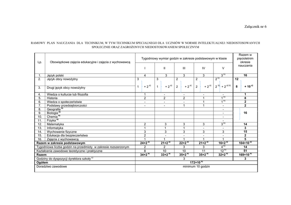 Załącznik nr 6 RAMOWY PLAN NAUCZANIA DLA TECHNIKUM, W TYM TECHNIKUM SPECJALNEGO DLA UCZNIÓW W NORMIE INTELEKTUALNEJ: NIEDOSTOSOWANYCH SPOŁECZNIE ORAZ ZAGROŻONYCH NIEDOSTOSOWANIEM SPOŁECZNYM Lp. Tygodniowy wymiar godzin w zakresie podstawowym w klasie Obowiązkowe zajęcia edukacyjne i zajęcia z wychowawcą I 1. 2. Język polski Język obcy nowożytny 3 3. Drugi język obcy nowożytny 1 4. Wiedza o kulturze lub filozofia 5. Historia 6. Wiedza o społeczeństwie 7. Podstawy przedsiębiorczości d) Geografia 8. d) Biologia 9. d) Chemia 10. d) Fizyka 11. 12. Matematyka 13. Informatyka 14. Wychowanie fizyczne 15. Edukacja dla bezpieczeństwa 16. Zajęcia z wychowawcą Razem w zakresie podstawowym Tygodniowa liczba godzin na przedmioty w zakresie rozszerzonym Kształcenie zawodowe teoretyczne i praktyczne Razem c) Godziny do dyspozycji dyrektora szkoły Ogółem Doradztwo zawodowe II 4 3 3 +2 a) 1 2 - 2 1 3 2 1 a) 24+2 2 8 a) 34+2 1 III IV 3 3 2 +2 a) 2 - 3 1 3 1 a) 21+2 2 10 a) 33+2 2 V 3 2 +2 2 1 3 1 3 1 a) 22+2 3 10 a) 35+2 3 a) 2 +2 a) 1 1 1 3 3 1 a) 21+2 3 11 a) 35+2 a) 172+10 minimum 10 godzin 2 b) 2 b) Razem w pięcioletnim okresie nauczania b) 16 12 +2 a) b) b) 1 b) 1 b) 3 3 1 a) 16+2 b) 4 b) 12 a) 32+2 8 + 10 a) 1 8 2 2 16 14 3 15 2 5 a) 104+10 14 51 a) 169+10 3 a) dodatkowe godziny na nauczanie tego języka obcego nowożytnego, który jest drugim językiem nauczania w szkołach lub oddziałach dwujęzycznych; w przypadku kończenia kształcenia zawodowego teoretycznego i kształcenia zawodowego praktycznego do końca lutego ostatniego roku nauki, dyrektor technikum ustala tygodniowy wymiar obowiązkowych zajęć edukacyjnych z zachowaniem wymiaru godzin określonego na realizację obowiązkowych zajęć edukacyjnych. b) godziny do dyspozycji dyrektora mogą być przeznaczone na realizację zajęć związanych z kształtowaniem kompetencji zawodowych; c) dyrektor szkoły ustala klasy, w których realizowany będzie przedmiot, z zachowaniem tygodniowego wymiaru godzin określonego dla poszczególnych klas, przy czym przedmiot realizowany jest w wymiarze 4 godzin w pięcioletnim okresie nauczania; d) 1. Wymiar godzin zajęć rewalidacyjnych dla uczniów niepełnosprawnych wynosi: a) w oddziale specjalnym – minimum 8 godzin tygodniowo na oddział, b) w oddziale ogólnodostępnym lub integracyjnym – minimum po 2 godziny tygodniowo na ucznia. 2. Wymiar godzin przeznaczonych na realizację zajęć religii lub etyki, zajęć wychowania do życia w rodzinie, zajęć języka mniejszości narodowej, etnicznej lub języka regionalnego i naukę własnej historii i kultury oraz zajęć sportowych w oddziałach i szkołach sportowych oraz szkołach mistrzostwa sportowego określają przepisy, o których mowa w art. 18 ust. 5 oraz art. 109 ust. 2 ustawy prawo oświatowe. 3. Na przedmioty w zakresie rozszerzonym (dodatkowo, poza wymiarem godzin określonym dla przedmiotów w zakresie podstawowym) należy przeznaczyć na : a) język polski, historię muzyki, historię sztuki, język łaciński i kulturę antyczną oraz filozofię – po 8 godzin tygodniowo, b) język obcy nowożytny, historię, wiedzę o społeczeństwie, geografię, biologię, chemię, fizykę, matematykę oraz informatykę – po 6 godzin tygodniowo, w pięcioletnim okresie nauczania. 4. Dyrektor technikum, po zasięgnięciu opinii rady technikum, a jeżeli rada technikum nie została powołana – po zasięgnięciu opinii rady pedagogicznej, rady rodziców i samorządu uczniowskiego, uwzględniając zawód, w którym kształci technikum, zainteresowania uczniów oraz możliwości organizacyjne, kadrowe i finansowe technikum, ustala przedmioty realizowane w zakresie rozszerzonym, spośród których uczeń wybiera 2 przedmioty. 5. Przedmioty w zakresie rozszerzonym, z wyjątkiem przedmiotów wymienionych w pkt 6, są realizowane w klasach I-IV. 6. Realizacja przedmiotów: historia muzyki, historia sztuki, język łaciński i kultura antyczna oraz filozofia może rozpocząć się w klasie I, II lub III. 7. Uczniowie oddziału (grupy oddziałowej, międzyoddziałowej lub międzyszkolnej), w którym tygodniowy wymiar godzin obowiązkowych zajęć edukacyjnych realizowanych w zakresie rozszerzonym jest niższy od 14, mogą wystąpić z wnioskiem do dyrektora technikum o: a) zwiększenie liczby godzin przeznaczonych na przedmioty realizowane w zakresie rozszerzonym, albo b) realizowanie przedmiotów uzupełniających, dla których nie została ustalona podstawa programowa, lecz program nauczania tych przedmiotów został włączony do szkolnego zestawu programów nauczania. Tygodniowy wymiar godzin w pięcioletnim okresie nauczania dla dodatkowego przedmiotu uzupełniającego wynosi co najmniej 2 godziny tygodniowo w pięcioletnim okresie nauczania. Realizowane dodatkowo przez uczniów przedmioty uzupełniające ustala dyrektor technikum po zasięgnięciu opinii rady pedagogicznej. 8. Praktyki zawodowe są realizowane w wymiarze określonym w podstawie programowej kształcenia w zawodach, w klasie ustalonej przez dyrektora technikum. Dyrektor technikum może rozłożyć w czasie przebieg praktyk zawodowych.