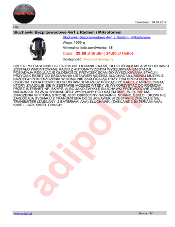 Utworzono : 04.03.2017 Rtv Słuchawki Bezprzewodowe 4w1 z Radiem i Mikrofonem Słuchawki Bezprzewodowe 4w1 z Radiem i Mikrofonem Waga: 1000 g Minimalna ilość zamówienia: 15 Cena : 29,89 zł Brutto ( 24,50 zł Netto) Dostępność: Produkt dostępny ad ip ol .p l SUPER PORTASOUND Hi-Fi S-XBS NIE OGRANICZAJ SIĘ DŁUGOŚCIĄ KABLA W SŁUCHAWKI ZOSTAŁO WMONTOWANE RADIO Z AUTOMATYCZNYM WYSZUKIWANIEM STACJI. POSIADAJĄ REGULACJĘ GŁOŚNOŚCI, PRZYCISK SCAN DO WYSZUKIWANIA STACJI I PRZYCISK RESET DO KASOWANIA USTAWIEŃ MOŻESZ SŁUCHAĆ ULUBIONEJ MUZYKI Z KAŻDEGO POMIESZCZENIA W DOMU NIE ZAKŁÓCAJĄC PRZY TYM SPOKOJU INNYM OSOBOM. DODATKOWO DO SŁUCHAWEK MOŻESZ PODŁĄCZYĆ KABEL Z MIKROFONEM, KTÓRY ZNAJDUJE SIĘ W ZESTAWIE MOŻESZ WTEDY JE WYKORZYSTAĆ DO ROZMÓW PRZEZ INTERNET NP. SKYPE, ALBO JAKO ZWYKŁE SŁUCHAWKI PRZEWODOWE ZASIĘG NADAJNIKA TO 25 m. SYGNAŁ JEST WYSYŁANY POD KĄTEM 360°, WIĘC NIE MA ZNACZENIA W KTÓRĄ STRONĘ JEST OBRÓCONY NADAJNIK. ŚCIANY, SZKŁO I DRZWI NIE ZAKŁÓCAJĄ SYGNAŁU Z TRANSMITERA DO SŁUCHAWEK W ZESTAWIE ZNAJDUJE SIĘ: TRANSMITER (ZASILANY 2 BATERIAMI AAA) SŁUCHAWKI (ZASILANE 2 BATERIAMI AAA) KABEL JACK KABEL CHINCH www.adipol.pl Powered by TCPDF (www.tcpdf.org) Strona : 1/1