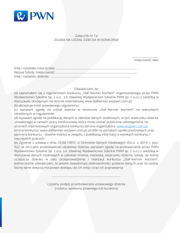 Załącznik nr 1a ZGODA NA UDZIAŁ DZIECKA W KONKURSIE _____________________ miejscowość, data Imię i nazwisko nauczyciela: ………………………………………………………………………………………… Nazwa Szkoły, miejscowość: ………………………………………………………………………………………… Imię i nazwisko dziecka: ………………………………………………………………………………………… Oświadczam, że: (a) zapoznałem się z regulaminem konkursu „DaF-Kenner kochen!” organizowanego przez PWN Wydawnictwo Szkolne Sp. z o.o. s.k. (dawniej Wydawnictwo Szkolne PWN sp. z o.o.) z siedzibą w Warszawie, dostępnym na stronie internetowej www.dafkenner.wszpwn.com.pl; (b) akceptuje treść powołanego regulaminu; (c) wyrażam zgodę na udział dziecka w konkursie „DaF-Kenner kochen!” na warunkach określonych w regulaminie; (d) wyrażam zgodę na publikację danych w zakresie danych osobowych, w tym wizerunku dziecka utrwalonego w ramach pracy konkursowej, która może zostać publicznie udostępniona na stronach internetowych organizatora konkursu (strona organizatora: www.wszpwn.com.pl, strona konkursu: www.dafkenner.wszpwn.com.pl, profile na portalach społecznościowych oraz partnera konkursu - Goethe Institut w związku z publikacją informacji o wynikach konkursu i zwycięskich pracach. (e) Zgodnie z ustawą z dnia 29.08.1997r. o Ochronie Danych Osobowych (Dz.U. z 2016 r. poz. 922 ze zm.) jako przedstawiciel ustawowy dziecka, wyrażam zgodę na przetwarzanie przez PWN Wydawnictwo Szkolne Sp. z o.o. s.k. (dawniej Wydawnictwo Szkolne PWN sp. z o.o.) z siedzibą w Warszawie danych osobowych w zakresie imienia, nazwiska, wizerunku dziecka, szkoły, do której uczęszcza dziecko w celu przeprowadzenia i realizacji konkursu „DaF-Kenner kochen!”. Jednocześnie oświadczam, że jestem świadoma/y dobrowolności podania danych oraz że osoba, której dane dotyczą ma prawo dostępu do ich treści oraz ich poprawiania …………………………………………………………………………… czytelny podpis przedstawiciela ustawowego dziecka (rodzica, opiekuna prawnego lub kuratora) (f) wyrażam zgodę na publikację danych w zakresie danych osobowych, w tym wizerunku dziecka utrwalonego w ramach innych materiałów, niż praca konkursowa, w szczególności w postaci zdjęć i filmów, powstających w trakcie realizacji konkursu oraz przeprowadzenia ceremonii wręczenia nagród, które mogą zostać publicznie udostępnione na stronach internetowych organizatora konkursu (strona organizatora: www.wszpwn.com.pl, strona konkursu: www.dafkenner.wszpwn.com.pl, profile na portalach społecznościowych) oraz partnera konkursu - Goethe Institut w związku z publikacją informacji o wynikach konkursu i zwycięskich pracach. …………………………………………………………………………… czytelny podpis przedstawiciela ustawowego dziecka (rodzica, opiekuna prawnego lub kuratora) (g) wyrażam zgodę na publikację danych osobowych, w tym wizerunku dziecka utrwalonego w ramach pracy konkursowej jak również w ramach innych materiałów w postaci zdjęć i filmów, które mogą powstać z związku z realizacją konkursu oraz przeprowadzeniem ceremonii wręczenia nagród, w związku z udostępnieniem pracy konkursowej lub takich materiałów w celach promocyjnych w prezentacjach i na stronach internetowych organizatora konkursu (strona organizatora www.wszpwn.com.pl, strona konkursu www.dafkenner.wszpwn.com.pl, profile na portalach społecznościowych) oraz partnera konkursu - Goethe Institut na platformie edukacyjnej Akademia PWN, w publikacjach PWN Wydawnictwo Szkolne oraz w newsletterach organizatora. …………………………………………………………………………… czytelny podpis przedstawiciela ustawowego dziecka (rodzica, opiekuna prawnego lub kuratora)