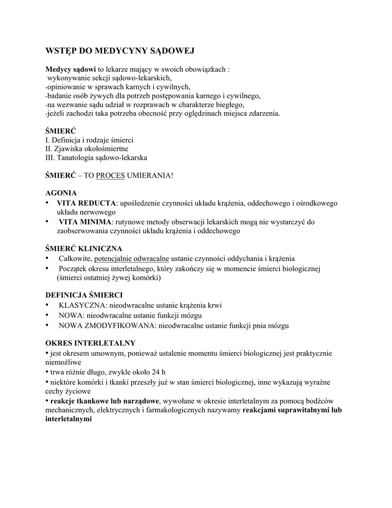 WSTĘP DO MEDYCYNY SĄDOWEJ Medycy sądowi to lekarze mający w swoich obowiązkach : wykonywanie sekcji sądowo-lekarskich, -opiniowanie w sprawach karnych i cywilnych, -badanie osób żywych dla potrzeb postępowania karnego i cywilnego, -na wezwanie sądu udział w rozprawach w charakterze biegłego, -jeżeli zachodzi taka potrzeba obecność przy oględzinach miejsca zdarzenia. ŚMIERĆ I. Definicja i rodzaje śmierci II. Zjawiska okołośmiertne III. Tanatologia sądowo-lekarska ŚMIERĆ – TO PROCES UMIERANIA! AGONIA • VITA REDUCTA: upośledzenie czynności układu krążenia, oddechowego i ośrodkowego układu nerwowego • VITA MINIMA: rutynowe metody obserwacji lekarskich mogą nie wystarczyć do zaobserwowania czynności układu krążenia i oddechowego ŚMIERĆ KLINICZNA • Całkowite, potencjalnie odwracalne ustanie czynności oddychania i krążenia • Początek okresu interletalnego, który zakończy się w momencie śmierci biologicznej (śmierci ostatniej żywej komórki) DEFINICJA ŚMIERCI • KLASYCZNA: nieodwracalne ustanie krążenia krwi • NOWA: nieodwracalne ustanie funkcji mózgu • NOWA ZMODYFIKOWANA: nieodwracalne ustanie funkcji pnia mózgu OKRES INTERLETALNY • jest okresem umownym, ponieważ ustalenie momentu śmierci biologicznej jest praktycznie niemożliwe • trwa różnie długo, zwykle około 24 h • niektóre komórki i tkanki przeszły już w stan śmierci biologicznej, inne wykazują wyraźne cechy życiowe • reakcje tkankowe lub narządowe, wywołane w okresie interletalnym za pomocą bodźców mechanicznych, elektrycznych i farmakologicznych nazywamy reakcjami suprawitalnymi lub interletalnymi RODZAJE ŚMIERCI 1. ŚMIERĆ NATURALNA (jest następstwem fizjologicznego starzenia się ustroju, bądź następstwem zmian chorobowych). • Powolna (śmierć z przyczyn chorobowych następuje w toku dłużej trwającej choroby i jest poprzedzona wyraźną agonią, np. choroba nowotworowa) • Nagła (śmierć człowieka pozornie zdrowego występuje nagle i jest zaskoczeniem dla jego otoczenia ) 2. ŚMIERĆ GWAŁTOWNA Jest ona następstwem szkodliwego działania urazu w szerokim tego słowa znaczeniu – nie tylko mechanicznego (wypadek komunikacyjny, postrzał, rana kłuta), ale także termicznego, jak również działania toksycznych substancji chemicznych lub energii elektrycznej. • Powolna • Nagła ZNAMIONA ŚMIERCI 1. Wczesne - całkowicie wykształcają się w ciągu 12 godzin po zgonie. • plamy opadowe • stężenie pośmiertne • oziębienie pośmiertne • bladość pośmiertna • wysychanie pośmiertne Plamy opadowe i stężenie pośmiertne to tzw. pewne cechy śmierci. PLAMY OPADOWE • Plamy opadowe powstają w momencie gdy ustaje krążenie, a krew pod wpływem siły grawitacji przemieszcza się do naczyń żylnych włosowatych w najniżej położonych częściach ciała • Pierwsze plamy (kark i małżowiny uszne) po około 30 min. • po około 2-4 godzinach plamy są w pełni wykształcone, ale bledną pod wpływem ucisku i są przemieszczalne • po około 10-12 godzinach plamy opadowe utrwalone • gdy ciśnienie w drobnych naczyniach w których gromadzi się krew jest stosunkowo wysokie lub też te naczynia są niepełnowartościowe może dojść do ich pęknięcia i wynaczynienia się krwi – w obrębie plam opadowych powstają wtedy drobne wybroczynki krwawe Różnicowanie: Plama opadowa czy podbiegnięcie krwawe? STĘŻENIE POŚMIERTNE • W pierwszym momencie – zwiotczenie mięśni!!! (człowiek niepodparty upada, narzędzie typu broń czy nóż wypada z ręki) • Następnie skrócenie i zesztywnienie mięśni (ATP i inne jak Ach, glikogen, kwas mlekowy) Brak ATP prowadzi do powstania aktomiozyny • • • • 30-60’ – mięsień sercowy, przepona, mięśniówka przewodu pokarmowego 1-3 h – mięśnie mimiczne, drobne mięśnie palców rąk i stóp 6-12 h – pozostałe mięśnie 48-72 h – ustępowanie stężenia (procesy gnilne rozkładają białkowe połączenie aktynamiozyna) OZIĘBIENIE POŚMIERTNE • Stopniowe obniżanie temperatury zwłok (temp. mierzona w odbytnicy spada w pierwszych godzinach o około 1 stopień C / h) • Szybkość ochładzania ciała może się zmieniać zależnie od: temperatury otoczenia, wilgotności środowiska, grubości tkanki tłuszczowej, ubrania itp. • Wyjątkowo temperatura tuż po śmierci może wzrosnąć np. gdy śmierć poprzedza choroba przebiegająca z wysoką gorączką, drgawkami itp. BLADOŚĆ POŚMIERTNA • Występuje w skutek zatrzymania krążenia i opadania krwi do najniżej położonych części ciała, pozostałe okolice wyraźnie odcinają się od plam opadowych (szarawy odcień, woskowy, trupia bladość) • W zatruciu tlenkiem węgla skóra cielisto-kremowa WYSYCHANIE POŚMIERTNE • Najszybciej wysycha rogówka, która przy niezamkniętych powiekach mętnieje już po 2-4 godzinach • Wysychanie czerwieni wargowej, worka mosznowego, warg sromowych • Miejsca w których doszło do otarcia naskórka lub jego maceracji szybciej i wyraźniej wysychają, sprawiając że nawet drobne urazy stają się wyraźnie widoczne, np. ślady po defibrylacji elektrycznej serca, bruzda wisielcza. ZNAMIONA ŚMIERCI 2. Późne Zmiany o charakterze rozkładowym • Autoliza • Gnicie Zmiany o charakterze utrwalającym (przeobrażenia zwłok) • Strupieszenie (mumifikacja) • Przeobrażenie tłuszczowo-woskowe • Przemiana torfowa AUTOLIZA • proces rozpadu komórek i narządów wewnętrznych spowodowany przez enzymy wewnątrzkomórkowe • najszybciej autolizie ulegają komórki mózgu • zmiany autolityczne szczególnie wyraźnie manifestują się w narządach bogatych w enzymy trzustka, żołądek, jelita • najpóźniej zachodzi: serce, macica, gruczoł krokowy, tarczyca, węzły chłonne, ścięgna, chrząstki, kości (elementy łącznotkankowe) GNICIE • procesy spowodowane działalnością bakterii gnilnych (saprofity przewodu pokarmowego) • rozp
