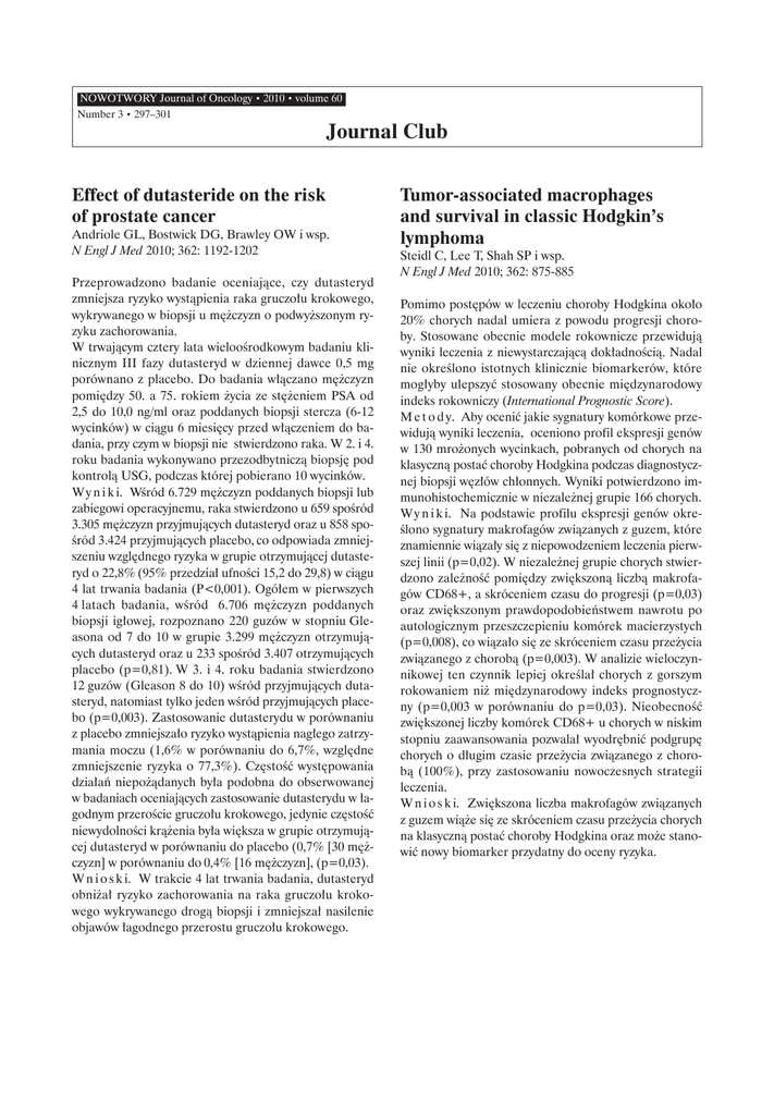 NOWOTWORY Journal of Oncology • 2010 • volume 60 Number 3 • 297–301 Journal Club Effect of dutasteride on the risk of prostate cancer Andriole GL, Bostwick DG, Brawley OW i wsp. N Engl J Med 2010; 362: 1192-1202 Przeprowadzono badanie oceniające, czy dutasteryd zmniejsza ryzyko wystąpienia raka gruczołu krokowego, wykrywanego w biopsji u mężczyzn o podwyższonym ryzyku zachorowania. W trwającym cztery lata wieloośrodkowym badaniu klinicznym III fazy dutasteryd w dziennej dawce 0,5 mg porównano z placebo. Do badania włączano mężczyzn pomiędzy 50. a 75. rokiem życia ze stężeniem PSA od 2,5 do 10,0 ng/ml oraz poddanych biopsji stercza (6-12 wycinków) w ciągu 6 miesięcy przed włączeniem do badania, przy czym w biopsji nie stwierdzono raka. W 2. i 4. roku badania wykonywano przezodbytniczą biopsję pod kontrolą USG, podczas której pobierano 10 wycinków. W y n i k i. Wśród 6.729 mężczyzn poddanych biopsji lub zabiegowi operacyjnemu, raka stwierdzono u 659 spośród 3.305 mężczyzn przyjmujących dutasteryd oraz u 858 spośród 3.424 przyjmujących placebo, co odpowiada zmniejszeniu względnego ryzyka w grupie otrzymującej dutasteryd o 22,8% (95% przedział ufności 15,2 do 29,8) w ciągu 4 lat trwania badania (P<0,001). Ogółem w pierwszych 4 latach badania, wśród 6.706 mężczyzn poddanych biopsji igłowej, rozpoznano 220 guzów w stopniu Gleasona od 7 do 10 w grupie 3.299 mężczyzn otrzymujących dutasteryd oraz u 233 spośród 3.407 otrzymujących placebo (p=0,81). W 3. i 4. roku badania stwierdzono 12 guzów (Gleason 8 do 10) wśród przyjmujących dutasteryd, natomiast tylko jeden wśród przyjmujących placebo (p=0,003). Zastosowanie dutasterydu w porównaniu z placebo zmniejszało ryzyko wystąpienia nagłego zatrzymania moczu (1,6% w porównaniu do 6,7%, względne zmniejszenie ryzyka o 77,3%). Częstość występowania działań niepożądanych była podobna do obserwowanej w badaniach oceniających zastosowanie dutasterydu w łagodnym przeroście gruczołu krokowego, jedynie częstość niewydolności krążenia była większa w grupie otrzymującej dutasteryd w porównaniu do placebo (0,7% [30 mężczyzn] w porównaniu do 0,4% [16 mężczyzn], (p=0,03). W n i o s k i. W trakcie 4 lat trwania badania, dutasteryd obniżał ryzyko zachorowania na raka gruczołu krokowego wykrywanego drogą biopsji i zmniejszał nasilenie objawów łagodnego przerostu gruczołu krokowego. Tumor-associated macrophages and survival in classic Hodgkin’s lymphoma Steidl C, Lee T, Shah SP i wsp. N Engl J Med 2010; 362: 875-885 Pomimo postępów w leczeniu choroby Hodgkina około 20% chorych nadal umiera z powodu progresji choroby. Stosowane obecnie modele rokownicze przewidują wyniki leczenia z niewystarczającą dokładnością. Nadal nie określono istotnych klinicznie biomarkerów, które mogłyby ulepszyć stosowany obecnie międzynarodowy indeks rokowniczy (International Prognostic Score). M e t o d y. Aby ocenić jakie sygnatury komórkowe przewidują wyniki leczenia, oceniono profil ekspresji genów w 130 mrożonych wycinkach, pobranych od chorych na klasyczną postać choroby Hodgkina podczas diagnostycznej biopsji węzłów chłonnych. Wyniki potwierdzono immunohistochemicznie w niezależnej grupie 166 chorych. W y n i k i. Na podstawie profilu ekspresji genów określono sygnatury makrofagów związanych z guzem, które znamiennie wiązały się z niepowodzeniem leczenia pierwszej linii (p=0,02). W niezależnej grupie chorych stwierdzono zależność pomiędzy zwiększoną liczbą makrofagów CD68+, a skróceniem czasu do progresji (p=0,03) oraz zwiększonym prawdopodobieństwem nawrotu po autologicznym przeszczepieniu komórek macierzystych (p=0,008), co wiązało się ze skróceniem czasu przeżycia związanego z chorobą (p=0,003). W analizie wieloczynnikowej ten czynnik lepiej określał chorych z gorszym rokowaniem niż międzynarodowy indeks prognostyczny (p=0,003 w porównaniu do p=0,03). Nieobecność zwiększonej liczby komórek CD68+ u chorych w niskim stopniu zaawansowania pozwalał wyodrębnić podgrupę chorych o długim czasie przeżycia związanego z chorobą (100%), przy zastosowaniu nowoczesnych strategii leczenia. W n i o s k i. Zwiększona liczba makrofagów związanych z guzem wiąże się ze skróceniem czasu przeżycia chorych na klasyczną postać choroby Hodgkina oraz może stanowić nowy biomarker przydatny do oceny ryzyka. 298 Cisplatin plus gemcitabine versus gemcitabine for biliary tract cancer Valle J, Wasan H, Palmer DH i wsp. N Engl J Med 2010; 362: 1273-1281 Dotychczas nie ustalono optymalnego schematu chemioterapii dla chorych na miejscowo zaawansowanego i rozsianego raka dróg żółciowych. W randomizowanym badaniu klinicznym II fazy z udziałem 86 chorych porównano zastosowanie cisplatyny z gemcytabiną z leczeniem wyłącznie gemcytabiną. Po zaobserwowaniu wydłużenia czasu do progresji rozpoczęto badanie III fazy. M e t o d y. 410 chorych na miejscowo zaawansowanego lub rozsianego raka dróg żółciowych, raka pęcherzyka żółciowego lub brodawki Vatera przydzielono losowo do leczenia cisplatyną (25 mg/m2) w skojarzeniu z gemcytabiną (1000 mg/m2 w 1. i 8. dniu cyklu, 8 cykli podawanych co 21 dni) lub do monoterapii gemcytabiną (1000 mg/m2 w 1., 8. i 15. dniu cyklu, 6 cykli podawanych co 28 dni) do 24 tygodni. Pierwotnym wskaźnikiem oceny był całkowity czas przeżycia. W y n i k i. Po medianie czasu obserwacji wynoszącej 8,2 miesięcy i wystąpieniu 327 zgonów mediana całkowitego czasu przeżycia wyniosła 11,7 miesięcy w grupie 204 chorych leczonych cisplatyną w skojarzeniu z gemcytabiną i 8,1 miesięcy w grupie 206 chorych leczonych wyłącznie gemcytabiną (współczynnik ryzyka 0,64; 95% przedział ufności od 0,52 do 0,80; p<0,001). Mediana czasu do progresji wyniosła 8,0 miesięcy w grupie otrzymującej cisplatynę z gemcytabiną i 5,0 miesięcy w grupie leczonej wyłącznie gemcytabiną (p<0