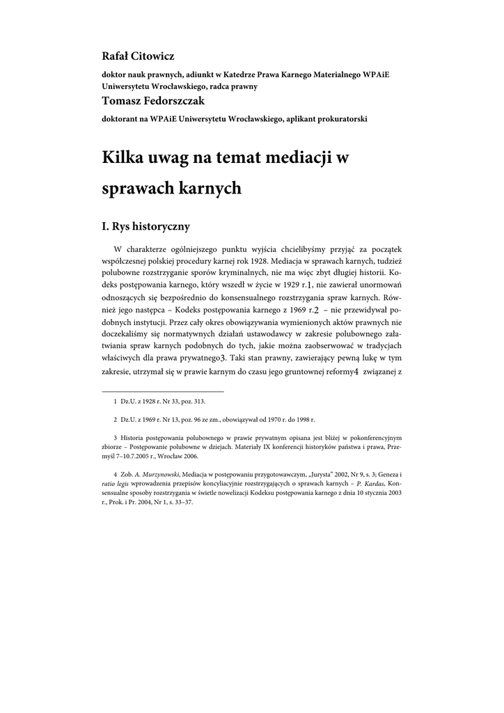 Rafał Citowicz doktor nauk prawnych, adiunkt w Katedrze Prawa Karnego Materialnego WPAiE Uniwersytetu Wrocławskiego, radca prawny Tomasz Fedorszczak doktorant na WPAiE Uniwersytetu Wrocławskiego, aplikant prokuratorski Kilka uwag na temat mediacji w sprawach karnych I. Rys historyczny W charakterze ogólniejszego punktu wyjścia chcielibyśmy przyjąć za początek współczesnej polskiej procedury karnej rok 1928. Mediacja w sprawach karnych, tudzież polubowne rozstrzyganie sporów kryminalnych, nie ma więc zbyt długiej historii. Kodeks postępowania karnego, który wszedł w życie w 1929 r.1, nie zawierał unormowań odnoszących się bezpośrednio do konsensualnego rozstrzygania spraw karnych. Również jego następca – Kodeks postępowania karnego z 1969 r.2 – nie przewidywał podobnych instytucji. Przez cały okres obowiązywania wymienionych aktów prawnych nie doczekaliśmy się normatywnych działań ustawodawcy w zakresie polubownego załatwiania spraw karnych podobnych do tych, jakie można zaobserwować w tradycjach właściwych dla prawa prywatnego3. Taki stan prawny, zawierający pewną lukę w tym zakresie, utrzymał się w prawie karnym do czasu jego gruntownej reformy4 związanej z 1 Dz.U. z 1928 r. Nr 33, poz. 313. 2 Dz.U. z 1969 r. Nr 13, poz. 96 ze zm., obowiązywał od 1970 r. do 1998 r. 3 Historia postępowania polubownego w prawie prywatnym opisana jest bliżej w pokonferencyjnym zbiorze – Postępowanie polubowne w dziejach. Materiały IX konferencji historyków państwa i prawa, Przemyśl 7–10.7.2005 r., Wrocław 2006. 4 Zob. A. Murzynowski, Mediacja w postępowaniu przygotowawczym, „Jurysta” 2002, Nr 9, s. 3; Geneza i ratio legis wprowadzenia przepisów koncyliacyjnie rozstrzygających o sprawach karnych – P. Kardas, Konsensualne sposoby rozstrzygania w świetle nowelizacji Kodeksu postępowania karnego z dnia 10 stycznia 2003 r., Prok. i Pr. 2004, Nr 1, s. 33–37. transformacją ustrojową państwa po 1989 r., czego wyraz stanowiły również zmiany w prawie. Kodyfikacja karna z 1997 r., a wśród niej nowy Kodeks postępowania karnego5, wprowadziła instytucję mediacji mającą zastosowanie bezpośrednio do spraw karnych. Rozwiązanie takie przyjęto pod wpływem wzorców zaczerpniętych ze Stanów Zjednoczonych oraz krajów Europy Zachodniej – głównie Wielkiej Brytanii – gdzie mediacja jako sprawiedliwość zadośćuczynieniowa funkcjonuje już od wielu lat6. Mediacja wywodzi się z idei określanej w doktrynie prawa mianem restorative justice, czyli sprawiedliwość naprawcza7. Jej istota sprowadza się do uznania czynu zabronionego, a w konsekwencji przestępstwa, za przejaw konfliktu między ofiarą a sprawcą, utrzymywanie tego konfliktu prowadzi do naruszenia dóbr i praw ofiary. Jedyną w takim przypadku reakcją na owo naruszenie praw wydaje się być rozwiązanie sporu uwzględniające dobro obu stron. Idea sprawiedliwości naprawczej znajduje swoje odzwierciedlenie w dokumentach międzynarodowych eksponujących konieczność skuteczniejszej ochrony praw osób pokrzywdzonych przestępstwami. Wśród nich szczególną rolę odgrywa Decyzja Ramowa Rady Unii Europejskiej z 15.3.2001 r., dotycząca pozycji ofiar w postępowaniu karnym, oraz liczne rekomendacje Rady Europy, w szczególności: Nr R (85) 11 w sprawie pozycji ofiary w prawie karnym materialnym i procesowym, Nr R (87) 21 w sprawie pomocy dla ofiar przestępstw i zapobiegania wiktymizacji oraz Nr R (99) 19 w sprawie mediacji8. II. Cele i korzyści wynikające z przeprowadzania mediacji w 5 Ustawa z 6.6.1997 r. – Kodeks postępowania karnego, obowiązuje od 1.9.1998 r., Dz.U. z 2007 r. Nr 89, poz. 555 ze zm. 6 Zob. E. Gmurzyńska, Mediacja w Stanach Zjednoczonych. Rola prawników [w:] Alternatywne sposoby rozwiązywania sporów, Warszawa 2003, s. 44 i n. W USA istnieje bardzo negocjacyjne podejście do rozwiązywania konfliktów, podobnie rzecz się ma w Wielkiej Brytanii, gdzie mediacja rozwija się najszybciej. Jest tam wiele przykładów sądowych modeli mediacji. Jednym z nich jest sąd w Exeter, w którym to do mediacji kieruje się 65% spraw, z których około 3/4 kończy się ugodą zawartą przed mediatorem. Alternatywne rozstrzyganie sporów sprawdza się nie tylko w systemach prawnych common law. Wprowadzenie mediacji w innych krajach europejskich spowodowało dość duży sukces w pozasądowym rozstrzyganiu konfliktów, w tym konfliktów karnych. W sądzie w Getyndze (Niemcy) do mediacji kieruje się około 65% spraw. Ugodą przed mediatorem kończy się aż 85%. Zob. M. Bobrowicz, Fakty i mity o mediacji, R. Pr. 2006, Nr 1, s. 85. 7 W tym miejscu chcielibyśmy odesłać czytelników do wielce interesującej monografii W. Zalewskiego, Sprawiedliwość naprawcza. Początek ewolucji polskiego prawa karnego?, Gdańsk 2006, s. 357. 8 N. Christie, Granice cierpienia, Wiedza Powszechna, Warszawa 1991, s. 115–119; A. Sitarska, Pomoc w rodzinie a mediacja, Prok. i Pr. 2006, Nr 1, s. 57. Wymienione akty prawne były ważnym powodem wdrażania mediacji do polskiego systemu prawnego, wynikającym ze zobowiązań zaciągniętych w sferze międzynarodowej. Zob. też Z. Gostyński (red.), Kodeks postępowania karnego. Komentarz, Warszawa 2003, s. 351. sprawach karnych Polska z tych samych powodów co inne państwa stara się odnaleźć odmienny od tradycyjnego sposób reakcji na przestępstwo. Wzrost znaczenia instytucji pojednania i ugody jako efektu mediacji spowodowany jest przede wszystkim względami pragmatycznymi. Chodzi tu o dążenie do tego, by decyzje organów procesowych uwzględniały w większym stopniu wolę zainteresowanych stron co do sposobu rozpoznania sporu, a nie tylko wyrażały władczy akt woli organów wymiaru sprawiedliwości9. Wprowadzenie norm mediacyjnych do rodzimego ustawodawstwa penalnego obrazuje, jak zmienia się punkt ciężkości podmiotowej w szeroko rozumianym prawie karnym. Odchodzić zaczęto od założeń właściwych dla szkoł
