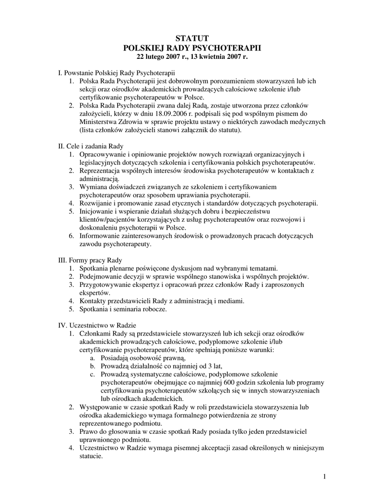 STATUT POLSKIEJ RADY PSYCHOTERAPII 22 lutego 2007 r., 13 kwietnia 2007 r. I. Powstanie Polskiej Rady Psychoterapii 1. Polska Rada Psychoterapii jest dobrowolnym porozumieniem stowarzyszeń lub ich sekcji oraz ośrodków akademickich prowadzących całościowe szkolenie i/lub certyfikowanie psychoterapeutów w Polsce. 2. Polska Rada Psychoterapii zwana dalej Radą, zostaje utworzona przez członków założycieli, którzy w dniu 18.09.2006 r. podpisali się pod wspólnym pismem do Ministerstwa Zdrowia w sprawie projektu ustawy o niektórych zawodach medycznych (lista członków założycieli stanowi załącznik do statutu). II. Cele i zadania Rady 1. Opracowywanie i opiniowanie projektów nowych rozwiązań organizacyjnych i legislacyjnych dotyczących szkolenia i certyfikowania polskich psychoterapeutów. 2. Reprezentacja wspólnych interesów środowiska psychoterapeutów w kontaktach z administracją. 3. Wymiana doświadczeń związanych ze szkoleniem i certyfikowaniem psychoterapeutów oraz sposobem uprawiania psychoterapii. 4. Rozwijanie i promowanie zasad etycznych i standardów dotyczących psychoterapii. 5. Inicjowanie i wspieranie działań służących dobru i bezpieczeństwu klientów/pacjentów korzystających z usług psychoterapeutów oraz rozwojowi i doskonaleniu psychoterapii w Polsce. 6. Informowanie zainteresowanych środowisk o prowadzonych pracach dotyczących zawodu psychoterapeuty. III. Formy pracy Rady 1. Spotkania plenarne poświęcone dyskusjom nad wybranymi tematami. 2. Podejmowanie decyzji w sprawie wspólnego stanowiska i wspólnych projektów. 3. Przygotowywanie ekspertyz i opracowań przez członków Rady i zaproszonych ekspertów. 4. Kontakty przedstawicieli Rady z administracją i mediami. 5. Spotkania i seminaria robocze. IV. Uczestnictwo w Radzie 1. Członkami Rady są przedstawiciele stowarzyszeń lub ich sekcji oraz ośrodków akademickich prowadzących całościowe, podyplomowe szkolenie i/lub certyfikowanie psychoterapeutów, które spełniają poniższe warunki: a. Posiadają osobowość prawną, b. Prowadzą działalność co najmniej od 3 lat, c. Prowadzą systematyczne całościowe, podyplomowe szkolenie psychoterapeutów obejmujące co najmniej 600 godzin szkolenia lub programy certyfikowania psychoterapeutów szkolących się w innych stowarzyszeniach lub ośrodkach akademickich. 2. Występowanie w czasie spotkań Rady w roli przedstawiciela stowarzyszenia lub ośrodka akademickiego wymaga formalnego potwierdzenia ze strony reprezentowanego podmiotu. 3. Prawo do głosowania w czasie spotkań Rady posiada tylko jeden przedstawiciel uprawnionego podmiotu. 4. Uczestnictwo w Radzie wymaga pisemnej akceptacji zasad określonych w niniejszym statucie. 1 5. W przypadku poważnego naruszenia zasad określonych w niniejszym statucie istnieje możliwość podjęcia przez Radę decyzji o wykluczeniu z prac Rady – decyzja taka musi być jednomyślna. 6. Decyzje o przyjmowaniu nowych członków Rady podejmowane są w formie głosowania, w obecności co najmniej 2/3 członków Rady. 7. W spotkaniach Rady mogą uczestniczyć goście zapraszani przez Przewodniczącego lub Sekretarza Rady. V. Zasady organizacyjne 1. Przy ustalaniu wspólnego stanowiska Rada poszukuje konsensusu i akceptacji ustaleń przez wszystkie uprawnione osoby uczestniczące w spotkaniu. 2. W sprawach, w których wypracowanie wspólnego stanowiska dotyczy priorytetów lub zobowiązań podjętych przez Radę, w których nie udaje się osiągnąć konsensusu, stanowisko Rady zostaje wypracowane poprzez głosowanie. 3. Występowanie w imieniu Rady wymaga uzgodnienia stanowiska w trakcie spotkań plenarnych lub uzgodnionych w formie uzgodnień korespondencyjnych przeprowadzonych przez Sekretarza Rady. 4. Posiedzenia Rady i głosowania prowadzi Przewodniczący, wybierany na okres 12 miesięcy. 5. Program posiedzeń Rady opracowuje Sekretarz Rady, wybierany na okres 12 miesięcy. 6. Spotkania plenarne Rady są protokołowane przez Sekretarza lub inną wybraną osobę. 7. W połowie kadencji Przewodniczącego wybierany jest Przewodniczący elekt na następną kadencję. 8. Przewodniczący, Przewodniczący elekt i Sekretarz tworzą Prezydium Rady, które spełnia jedynie funkcje usługowe wobec bieżących prac Rady. 9. Członkowie Prezydium Rady nie posiadają kompetencji władczych, z wyjątkiem tych, które zostaną im przyznane dla celów realizacji określonych zadań powierzanych przez Radę poprzez konsensus lub głosowanie. 10. Osobami uprawnionymi do reprezentowania stanowiska Rady w kontaktach zewnętrznych są członkowie Prezydium Rady. 11. Rada może powoływać zespoły do spraw szczegółowych. VI. Zmiany statutu 1. Rada może zmienić zapisy niniejszego statutu w trakcie plenarnego zebrania, poprzez głosowanie w obecności co najmniej 2/3 członków Rady. 2. Decyzje w sprawie zmiany statutu wymagają poparcia 2/3 głosów osób uprawnionych uczestniczących w zebraniu. ZAŁĄCZNIK Lista członków założycieli Polskiej Rady Psychoterapii, którzy w dniu 18.09.2006 r. podpisali się pod wspólnym pismem do Ministerstwa Zdrowia w sprawie projektu ustawy o niektórych zawodach medycznych: 1. Instytut Analizy Grupowej „Rasztów” – Jerzy Pawlik 2. Instytut Integralnej Terapii Gestalt – Bożena Boruta-Gojny 3. Instytut Terapii Gestalt - Ewa Canert-Łąka 4. Instytut Psychologii Zdrowia Polskiego Towarzystwa Psychologicznego – Jerzy Mellibruda 2 5. Koło Warszawskie Szkoły Europejskiej Psychoanalizy – Agnieszka Kurek 6. Polska Federacja Psychoterapii – Maria Wilamowska 7. Polski Instytut NLP – Benedykt Peczko 8. Polskie Towarzystwo Psychoanalityczne – Wojciech Hańbowski 9. Polskie Towarzystwo Psychologii Zorientowanej na Proces – Michał Duda 10. Polskie Stowarzyszenie Psychoterapeutów i Trenerów Psychologii Procesu – Joanna Dulińska 11. Polskie Towarzystwo Psychoterapii Gestalt – Renata Procak 12. Polskie Towarzystwo Psychoterapii Krótkoterminowej – Mil