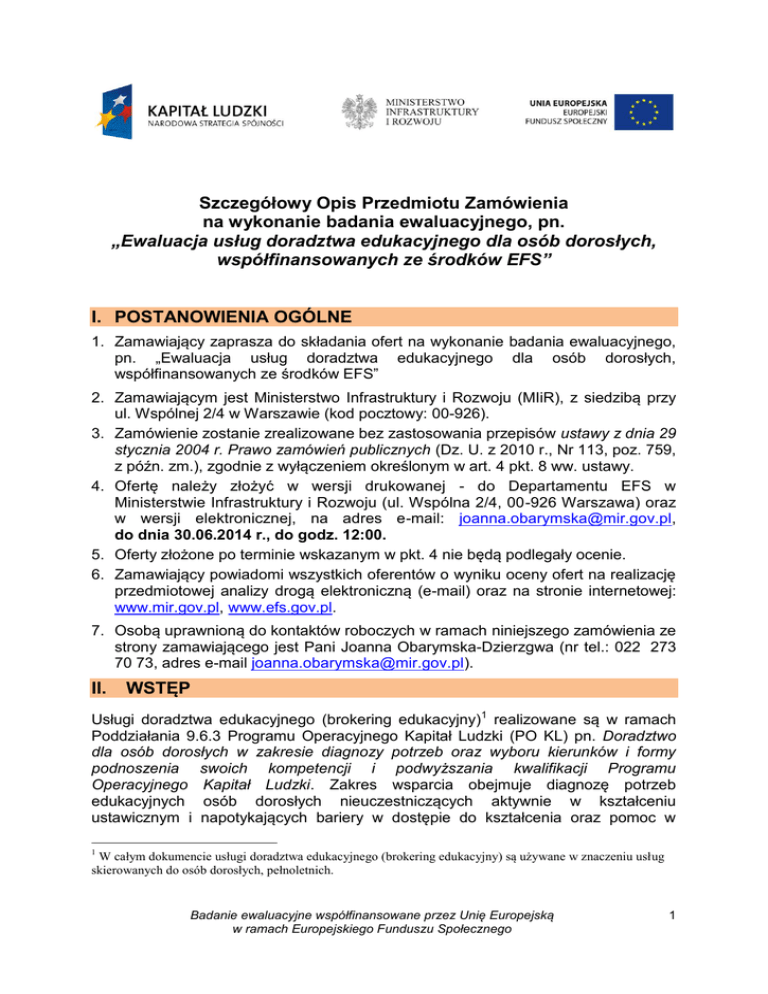 Szczegółowy Opis Przedmiotu Zamówienia na wykonanie badania ewaluacyjnego, pn. „Ewaluacja usług doradztwa edukacyjnego dla osób dorosłych, współfinansowanych ze środków EFS” I. POSTANOWIENIA OGÓLNE 1. Zamawiający zaprasza do składania ofert na wykonanie badania ewaluacyjnego, pn. „Ewaluacja usług doradztwa edukacyjnego dla osób dorosłych, współfinansowanych ze środków EFS” 2. Zamawiającym jest Ministerstwo Infrastruktury i Rozwoju (MIiR), z siedzibą przy ul. Wspólnej 2/4 w Warszawie (kod pocztowy: 00-926). 3. Zamówienie zostanie zrealizowane bez zastosowania przepisów ustawy z dnia 29 stycznia 2004 r. Prawo zamówień publicznych (Dz. U. z 2010 r., Nr 113, poz. 759, z późn. zm.), zgodnie z wyłączeniem określonym w art. 4 pkt. 8 ww. ustawy. 4. Ofertę należy złożyć w wersji drukowanej - do Departamentu EFS w Ministerstwie Infrastruktury i Rozwoju (ul. Wspólna 2/4, 00-926 Warszawa) oraz w wersji elektronicznej, na adres e-mail: [email protected], do dnia 30.06.2014 r., do godz. 12:00. 5. Oferty złożone po terminie wskazanym w pkt. 4 nie będą podlegały ocenie. 6. Zamawiający powiadomi wszystkich oferentów o wyniku oceny ofert na realizację przedmiotowej analizy drogą elektroniczną (e-mail) oraz na stronie internetowej: www.mir.gov.pl, www.efs.gov.pl. 7. Osobą uprawnioną do kontaktów roboczych w ramach niniejszego zamówienia ze strony zamawiającego jest Pani Joanna Obarymska-Dzierzgwa (nr tel.: 022 273 70 73, adres e-mail [email protected]). II. WSTĘP Usługi doradztwa edukacyjnego (brokering edukacyjny)1 realizowane są w ramach Poddziałania 9.6.3 Programu Operacyjnego Kapitał Ludzki (PO KL) pn. Doradztwo dla osób dorosłych w zakresie diagnozy potrzeb oraz wyboru kierunków i formy podnoszenia swoich kompetencji i podwyższania kwalifikacji Programu Operacyjnego Kapitał Ludzki. Zakres wsparcia obejmuje diagnozę potrzeb edukacyjnych osób dorosłych nieuczestniczących aktywnie w kształceniu ustawicznym i napotykających bariery w dostępie do kształcenia oraz pomoc w 1 W całym dokumencie usługi doradztwa edukacyjnego (brokering edukacyjny) są używane w znaczeniu usług skierowanych do osób dorosłych, pełnoletnich. Badanie ewaluacyjne współfinansowane przez Unię Europejską w ramach Europejskiego Funduszu Społecznego 1 wyborze odpowiedniej oferty kształcenia. Celem realizacji usług doradztwa edukacyjnego jest poprawa dostępu osób dorosłych, do usług edukacji formalnej i pozaformalnej, poprzez stymulowanie popytu oraz promocję kształcenia ustawicznego jako ścieżki rozwoju osobistego i zawodowego; usprawnienie komunikacji pomiędzy dostarczycielami usług edukacyjnych a ich potencjalnymi użytkownikami; prowadzenie diagnozy potrzeb i oczekiwań osób dorosłych (w szczególności z grup napotykających bariery w dostępie do kształcenia) w kontekście istniejących możliwości na rynku edukacyjnym oraz dostarczenie informacji i doradztwa w zakresie wyboru odpowiedniej ścieżki kształcenia. Powyższe elementy stanowią zakres wsparcia realizowanego w PO KL w formie pilotażu, którego celem jest weryfikacja zasadności i możliwości wdrożenia tego typu wsparcia na większą skalę w okresie programowania polityki spójności na lata 20142020. III. KONTEKST REALIZACJI BADANIA Wsparcie w postaci doradztwa edukacyjnego wprowadzone zostało pilotażowo i jedynie w ograniczonym zakresie - poprzez realizację projektów przez konkretne instytucje w 32 powiatach. W skali kraju realizacja powinna obejmować po dwa powiaty na terenie każdego województwa. Do pilotażu wybrano takie powiaty, w których występuje zróżnicowane nasilenie zmiennych (wskaźników społeczno – gospodarczych), które mogą mieć wpływ na rozwój zasobów ludzkich w ujęciu lokalnym. Matryca prezentująca różne zależności i wartości wskaźników społeczno – gospodarczych stanowi załącznik nr 1 do Zasad pilotażowego uruchomienia i realizacji usług doradczych w zakresie kształcenia formalnego i pozaformalnego osób dorosłych w ramach Poddziałania 9.6.3 PO KL (2012, MRR). Zakres podmiotowy badania: Beneficjentami projektów, mających na celu pilotażowe wdrożenie koncepcji doradztwa edukacyjnego mogą być wszystkie podmioty, z wyłączeniem osób fizycznych (nie dotyczy osób prowadzących działalność gospodarczą lub oświatową na podstawie przepisów odrębnych). W celu zapewnienia reprezentatywności podmiotów świadczących usługi doradztwa z różnych współistniejących systemów (rynku pracy, oświaty, organizacji pozarządowych, a także firm komercyjnych) w ramach kryteriów strategicznych obowiązujących dla konkursów ogłaszanych w Poddziałaniu 9.6.3 wskazane zostały preferowane w danym województwie kategorie beneficjentów, zgodne z kategoriami określonymi dla konkretnych powiatów w załączniku nr 1 do Zasad pilotażowego uruchomienia i realizacji usług doradczych w zakresie kształcenia formalnego i pozaformalnego osób dorosłych w ramach Poddziałania 9.6.3 PO KL (2012, MRR). Zgodnie z zapisem Szczegółowego Opisu Priorytetów PO KL wsparciem w ramach Poddziałania 9.6.3 muszą zostać objęte osoby dorosłe w wieku 18-64 lat - bez względu na ich status na rynku pracy (osoby bezrobotne, nieaktywne zawodowo, pracujące, uczące się itp.). Do wsparcia kwalifikują się również osoby w wieku powyżej 64 roku życia, o ile osoby te zadeklarują gotowość i zamiar podjęcia zatrudnienia po zakończeniu udziału w projekcie. Z uwagi na pilotażowy charakter ww. działań na poziomie dokumentów programowych PO KL nie wprowadzono dodatkowych ograniczeń dotyczących struktury grupy docelowej. W Zasadach Badanie ewaluacyjne współfinansowane przez Unię Europejską w ramach Europejskiego Funduszu Społecznego 2 pilotażowego uruchomienia i realizacji usług doradczych w zakresie kształcenia formalnego i pozaformalnego osób dorosłych w ramach Poddziałania 9.6.3 PO KL wskazane zosta