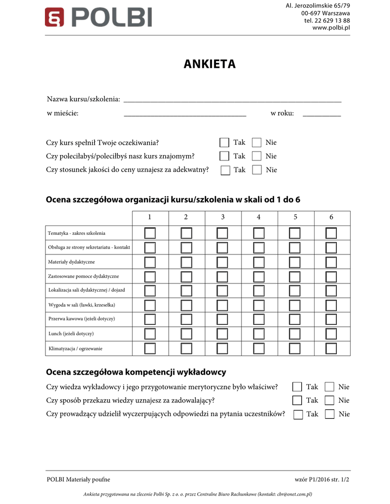 Al. Jerozolimskie 65/79 00-697 Warszawa tel. 22 629 13 88 www.polbi.pl ANKIETA Nazwa kursu/szkolenia: _________________________________________________________ w mieście: ________________________________ w roku: Czy kurs spełnił Twoje oczekiwania? Tak Nie Czy poleciłabyś/poleciłbyś nasz kurs znajomym? Tak Nie Czy stosunek jakości do ceny uznajesz za adekwatny? Tak Nie __________ Ocena szczegółowa organizacji kursu/szkolenia w skali od 1 do 6 1 2 3 4 5 6 Tematyka - zakres szkolenia Obsługa ze strony sekretariatu - kontakt Materiały dydaktyczne Zastosowane pomoce dydaktyczne Lokalizacja sali dydaktycznej / dojazd Wygoda w sali (ławki, krzesełka) Przerwa kawowa (jeżeli dotyczy) Lunch (jeżeli dotyczy) Klimatyzacja / ogrzewanie Ocena szczegółowa kompetencji wykładowcy Czy wiedza wykładowcy i jego przygotowanie merytoryczne było właściwe? Tak Nie Czy sposób przekazu wiedzy uznajesz za zadowalający? Tak Nie Czy prowadzący udzielił wyczerpujących odpowiedzi na pytania uczestników? Tak Nie POLBI Materiały poufne wzór P1/2016 str. 1/2 Ankieta przygotowana na zlecenie Polbi Sp. z o. o. przez Centralne Biuro Rachunkowe (kontakt: [email protected]) W jaki sposób dowiedziałeś się o naszym kursie/szkoleniu (skąd)? Internet? Wiadomość e-mail? Polecenie osoby znajomej? Co Ci się najbardziej podobało? Co Ci się najbardziej nie podobało? Wyczyść pola Dziękujemy za poświęcony czas :) Formularz można wysłać mailem na adres: [email protected] lub wydrukowaną ankietę przesłać na nr faksu: 22 699 59 15 POLBI Materiały poufne wzór P1/2016 str. 2/2 Ankieta przygotowana na zlecenie Polbi Sp. z o. o. przez Centralne Biuro Rachunkowe (kontakt: [email protected])