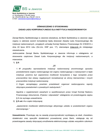 Bank Spółdzielczy w Jaworze ul. Wrocławska 2, 59-400 Jawor tel. (76) 870-28-34 fax. (76) 871-18-12 e-mail : [email protected] OŚWIADCZENIE O STOSOWANIU ZASAD ŁADU KORPORACYJNEGO DLA INSTYTUCJI NADZOROWANYCH Zarząd Banku Spółdzielczego w Jaworze oświadcza, że Bank Spółdzielczy w Jaworze i jego organy w zakresie swoich kompetencji będą stosować Zasady Ładu Korporacyjnego dla instytucji nadzorowanych, przyjętych uchwałą Komisji Nadzoru Finansowego Nr 218/2014 z dnia 22 lipca 2014 roku (Dz.Urz. KNF poz. 17), stanowiące Załącznik do niniejszego oświadczenia. Jednocześnie Zarząd Banku Spółdzielczego w Jaworze informuje o odstąpieniu od stosowania częściowo Zasad Ładu Korporacyjnego dla instytucji nadzorowanych, a mianowicie: 1) § 6: „§6. 1. W przypadku wprowadzenia instytucji nadzorowanej anonimowego sposobu powiadamiania organu nadzorującego lub organu nadzorującego o nadużyciach w tejże instytucji, powinna być zapewniona możliwość korzystania z tego narzędzia przez pracowników bez obawy negatywnych konsekwencji ze strony kierownictwa i innych pracowników instytucji nadzorowanej. 2. Organ zarządzający powinien przedstawić organowi nadzorującemu raporty dotyczące powiadomień o poważnych nadużyciach.” Zgodnie z wyjaśnieniami zawartymi w opublikowanym przez Urząd Komisji Nadzoru Finansowego dokumencie „Pytania i odpowiedzi” odstąpienie od przestrzegania zapisu § 6 nie wymaga uzasadnienia. 2) § 8 ust. 4 w części dotyczącej: „zapewnienie możliwości elektronicznego aktywnego udziału w posiedzeniach organu stanowiącego.” Uzasadnienie: Powołując się na zasadę proporcjonalności wynikającą ze skali, charakteru działalności oraz specyfiki działalności prowadzonej przez Bank, odstępuje się od przestrzegania zasady dotyczącej umożliwienia elektronicznego udziału wszystkim członkom Bank Spółdzielczy w Jaworze, ul. Wrocławska 2, 59-400 Jawor, KRS 0000111618, NIP 6950002761 w posiedzeniach organu stanowiącego. W ocenie Banku spełnienie powyższej zasady nie znajduje zastosowania przy uwzględnieniu specyfiki działalności banku spółdzielczego, którego większość właścicieli stanowią mieszkańcy lokalnego środowiska. Ponadto zgodnie ze Statutem Banku zawiadomienia członków o czasie, miejscu i porządku obrad Zebrania Przedstawicieli wysyłane są za zwrotnym potwierdzeniem odbioru lub listem poleconym, co najmniej 14 dni przed terminem obrad. Tak uregulowany sposób informowania członków Banku gwarantuje możliwość ich osobistego uczestnictwa w Zebraniu Przedstawicieli. Bank nie jest przygotowany pod względem technicznym i organizacyjnym do wykonywania tej zasady. Dodatkowo jej wprowadzenie wiąże się ze znacznymi kosztami, które w ocenie Banku są nieuzasadnione. Powyższe uzasadnia rezygnację z organizacji posiedzeń organu stanowiącego poprzez zdalny, elektroniczny udział członków. Ponadto w Banku Spółdzielczym w Jaworze nie mają zastosowania Zasady Ładu Korporacyjnego dla instytucji nadzorowanych, zawarte w § 11, § 22 ust. 1 i 2 oraz ust. 4 - 6 w części dotyczącej komitetu audytu, § 53, § 54, § 55, § 56, § 57, gdyż nie dotyczą Banku. Jawor, dnia 31 grudnia 2014 r. Zarząd Banku Spółdzielczego w Jaworze