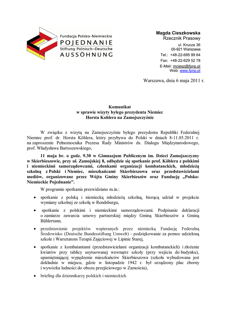 Magda Cieszkowska Rzecznik Prasowy ul. Krucza 36 00-921 Warszawa Tel.: +48-22-695 99 64 Fax: +48-22-629 52 78 E-Mail: [email protected] Web: www.fpnp.pl Warszawa, dnia 6 maja 2011 r. Komunikat w sprawie wizyty byłego prezydenta Niemiec Horsta Kohlera na Zamojszczyźnie W związku z wizytą na Zamojszczyźnie byłego prezydenta Republiki Federalnej Niemiec prof. dr. Horsta Köhlera, który przybywa do Polski w dniach 8-11.05.2011 r. na zaproszenie Pełnomocnika Prezesa Rady Ministrów ds. Dialogu Międzynarodowego, prof. Władysława Bartoszewskiego, 11 maja br. o godz. 9.30 w Gimnazjum Publicznym im. Dzieci Zamojszczyzny w Skierbieszowie, przy ul. Zamojskiej 8, odbędzie się spotkanie prof. Köhlera z polskimi i niemieckimi samorządowcami, członkami organizacji kombatanckich, młodzieżą szkolną z Polski i Niemiec, mieszkańcami Skierbieszowa oraz przedstawicielami mediów, organizowane przez Wójta Gminy Skierbieszów oraz Fundację „PolskoNiemieckie Pojednanie”. W programie spotkania przewidziano m.in.: spotkanie z polską i niemiecką młodzieżą szkolną, biorącą udział w projekcie wymiany szkolnej ze szkołą w Rendsburgu, spotkanie z polskimi i niemieckimi samorządowcami. Podpisanie deklaracji o zamiarze zawarcia umowy partnerskiej między Gminą Skierbieszów a Gminą Bühlertann, przedstawienie projektów wspieranych przez niemiecką Fundację Federalną Środowisko (Deutsche Bundesstiftung Umwelt) - podziękowanie za pomoc udzieloną szkole i Warsztatom Terapii Zajęciowej w Lipinie Starej, spotkanie z kombatantami (przedstawicielami organizacji kombatanckich) i złożenie kwiatów przy tablicy usytuowanej wewnątrz szkoły (przy wejściu do budynku), upamiętniającej wypędzenie mieszkańców Skierbieszowa (szkoła wybudowana jest dokładnie w miejscu, gdzie w listopadzie 1942 r. był urządzony plac zborny i wywózka ludności do obozu przejściowego w Zamościu), briefing dla dziennikarzy polskich i niemieckich.