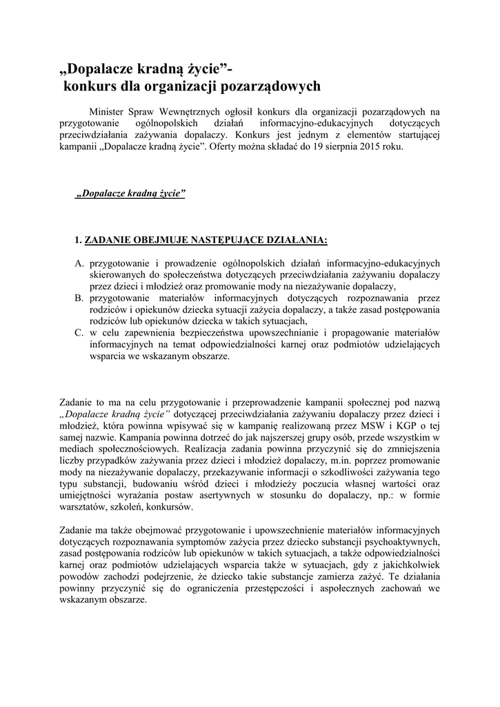„Dopalacze kradną życie”konkurs dla organizacji pozarządowych Minister Spraw Wewnętrznych ogłosił konkurs dla organizacji pozarządowych na przygotowanie ogólnopolskich działań informacyjno-edukacyjnych dotyczących przeciwdziałania zażywania dopalaczy. Konkurs jest jednym z elementów startującej kampanii „Dopalacze kradną życie”. Oferty można składać do 19 sierpnia 2015 roku. „Dopalacze kradną życie” 1. ZADANIE OBEJMUJE NASTĘPUJĄCE DZIAŁANIA: A. przygotowanie i prowadzenie ogólnopolskich działań informacyjno-edukacyjnych skierowanych do społeczeństwa dotyczących przeciwdziałania zażywaniu dopalaczy przez dzieci i młodzież oraz promowanie mody na niezażywanie dopalaczy, B. przygotowanie materiałów informacyjnych dotyczących rozpoznawania przez rodziców i opiekunów dziecka sytuacji zażycia dopalaczy, a także zasad postępowania rodziców lub opiekunów dziecka w takich sytuacjach, C. w celu zapewnienia bezpieczeństwa upowszechnianie i propagowanie materiałów informacyjnych na temat odpowiedzialności karnej oraz podmiotów udzielających wsparcia we wskazanym obszarze. Zadanie to ma na celu przygotowanie i przeprowadzenie kampanii społecznej pod nazwą „Dopalacze kradną życie” dotyczącej przeciwdziałania zażywaniu dopalaczy przez dzieci i młodzież, która powinna wpisywać się w kampanię realizowaną przez MSW i KGP o tej samej nazwie. Kampania powinna dotrzeć do jak najszerszej grupy osób, przede wszystkim w mediach społecznościowych. Realizacja zadania powinna przyczynić się do zmniejszenia liczby przypadków zażywania przez dzieci i młodzież dopalaczy, m.in. poprzez promowanie mody na niezażywanie dopalaczy, przekazywanie informacji o szkodliwości zażywania tego typu substancji, budowaniu wśród dzieci i młodzieży poczucia własnej wartości oraz umiejętności wyrażania postaw asertywnych w stosunku do dopalaczy, np.: w formie warsztatów, szkoleń, konkursów. Zadanie ma także obejmować przygotowanie i upowszechnienie materiałów informacyjnych dotyczących rozpoznawania symptomów zażycia przez dziecko substancji psychoaktywnych, zasad postępowania rodziców lub opiekunów w takich sytuacjach, a także odpowiedzialności karnej oraz podmiotów udzielających wsparcia także w sytuacjach, gdy z jakichkolwiek powodów zachodzi podejrzenie, że dziecko takie substancje zamierza zażyć. Te działania powinny przyczynić się do ograniczenia przestępczości i aspołecznych zachowań we wskazanym obszarze. 2. WYSOKOŚĆ ŚRODKÓW PUBLICZNYCH NA REALIZACJĘ ZADANIA Minister Spraw Wewnętrznych na realizację ww. zadania planuje przekazać środki w wysokości 100.000 zł (słownie: sto tysięcy zł). 3. UPRAWNIONE PODMIOTY O przyznanie dotacji mogą się ubiegać organizacje pozarządowe w rozumieniu art. 3 ust. 2 oraz podmioty wymienione w art. 3 ust. 3 ustawy o działalności pożytku publicznego i o wolontariacie, prowadzące działalność pożytku publicznego w zakresie porządku i bezpieczeństwa publicznego oraz przeciwdziałania patologiom społecznym, posiadające doświadczenie dające gwarancję pomyślnej realizacji zadania publicznego. 4. TERMIN I WARUNKI REALIZACJI ZADANIA Przedmiotowe zadanie ma zostać zrealizowane w terminie do dnia 31 grudnia 2015 roku od dnia podpisania umowy z podmiotem, który wygra otwarty konkurs ofert. Decyzja Ministra Spraw Wewnętrznych w sprawie wyboru ofert stanowić będzie podstawę do zawarcia pisemnej umowy ze zleceniobiorcą (oferentem). Ramowy wzór umowy określa rozporządzenie Ministra Pracy i Polityki Społecznej z dnia 15 grudnia 2010 r. w sprawie wzoru oferty i ramowego wzoru umowy dotyczących realizacji zadania publicznego oraz wzoru sprawozdania z wykonania tego zadania (Dz. U. z 2011 r. Nr 6 poz. 25). 5. TERMIN I MIEJSCE SKŁADANIA OFERT Oferty należy składać do dnia 19 sierpnia 2015 r.: korespondencyjnie na adres: Departament Porządku Publicznego, Ministerstwo Spraw Wewnętrznych, ul. S. Batorego 5, 02-591 Warszawa, z dopiskiem „Dopalacze kradną życie”, bezpośrednio, w Biurze Podawczym w budynku Ministerstwa Spraw Wewnętrznych, przy ul. Rakowieckiej 2, w godzinach 8.15 – 16.00. 6. WYMOGI FORMALNE Warunkiem przystąpienia do konkursu jest złożenie, w terminie do dnia 19 sierpnia 2015 r. oferty zgodnej ze wzorem określonym w rozporządzeniu Ministra Pracy i Polityki Społecznej z dnia 15 grudnia 2010 r. w sprawie wzoru oferty i ramowego wzoru umowy dotyczących realizacji zadania publicznego oraz wzoru sprawozdania z wykonania tego zadania. Do oferty należy dołączyć aktualny statut organizacji lub stowarzyszenia, aktualny wyciąg z Krajowego Rejestru Sądowego, NIP, REGON i numer rachunku bankowego. Rozpatrywane będą jedynie oferty złożone przez Oferenta, który łącznie spełnia następujące warunki: o jest organizacją pozarządową lub podmiotem wymienionym w art. 3 ust. 3 ustawy o działalności pożytku publicznego i o wolontariacie, prowadzącą działalność pożytku publicznego w zakresie porządku i bezpieczeństwa publicznego oraz przeciwdziałania patologiom społecznym, posiadającą doświadczenie dające gwarancję pomyślnej realizacji zadania publicznego; o zatrudnia odpowiednio wyszkoloną i wykwalifikowaną kadrę, zdolną do realizacji zadania w części merytorycznej (wskazując rodzaj kosztów jako czynność pracowników należy wskazać dane osoby, która będzie ją realizowała); o koszty związane z obsługą administracyjno-finansową nie mogą stanowić więcej niż 15% całkowitych kosztów zadania; o zatrudnia etatowego koordynatora projektu, który zagwarantuje rzetelną obsługę administracyjną oraz koordynatora finansowego; o jest wiarygodny pod względem finansowym; o przedłoży kompletną ofertę w terminie wskazanym w ogłoszeniu. 7. KRYTERIA OCENY ZGŁOSZONYCH OFERT Oferta powinna zawierać: dane realizatora zadania, szczegółowy zakres rzeczowy zadania publicznego propon