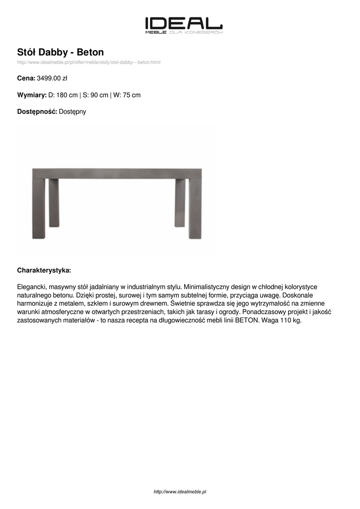 Stół Dabby - Beton http://www.idealmeble.pl/pl/offer/meble/stoly/stol-dabby---beton.html/ Cena: 3499.00 zł Wymiary: D: 180 cm | S: 90 cm | W: 75 cm Dostępność: Dostępny Charakterystyka: Elegancki, masywny stół jadalniany w industrialnym stylu. Minimalistyczny design w chłodnej kolorystyce naturalnego betonu. Dzięki prostej, surowej i tym samym subtelnej formie, przyciąga uwagę. Doskonale harmonizuje z metalem, szkłem i surowym drewnem. Świetnie sprawdza się jego wytrzymałość na zmienne warunki atmosferyczne w otwartych przestrzeniach, takich jak tarasy i ogrody. Ponadczasowy projekt i jakość zastosowanych materiałów - to nasza recepta na długowieczność mebli linii BETON. Waga 110 kg. http://www.idealmeble.pl http://www.idealmeble.pl Zdjęcia produktu: http://www.idealmeble.pl Powered by TCPDF (www.tcpdf.org)