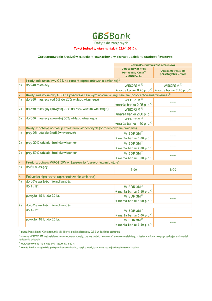Tekst jednolity stan na dzień 02.01.2013r. Oprocentowanie kredytów na cele mieszkaniowe w złotych udzielane osobom fizycznym Nominalna roczna stopa procentowa Oprocentowanie dla Oprocentowanie dla 1) Posiadaczy Konta pozostałych klientów w GBS Banku 1. 1) Kredyt mieszkaniowy GBS na remont (oprocentowanie zmienne)3) do 240 miesiecy 2. 1) Kredyt mieszkaniowy GBS na pozostałe cele wymienione w Regulaminie (oprocentowanie zmienne)3) do 360 miesięcy (od 0% do 20% wkładu własnego) WIBOR3M 2) ----+marża banku 2,25 p. p.4) do 360 miesięcy (powyżej 20% do 50% wkładu własnego) WIBOR3M 2) ----+marża banku 2,00 p. p.4) do 360 miesięcy (powyżej 50% wkładu własnego) WIBOR3M 2) ----+marża banku 1,80 p. p.4) Kredyt z dotacją na zakup kolektorów słonecznych (oprocentowanie zmienne) przy 0% udziale środków własnych WIBOR 3M 2) ----+ marża banku 5,00 p.p.4) przy 20% udziale środków własnych WIBOR 3M 2) ----+ marża banku 4,00 p.p.4) przy 50% udziale środków własnych WIBOR 3M 2) ----+ marża banku 3,00 p.p.4) Kredyt z dotacją WFOŚiGW w Szczecinie (oprocentowanie stałe) do 60 miesięcy 8,00 8,00 2) 3) 3. 1) 2) 3) 4. 1) 5. 1) 2) WIBOR3M 2) WIBOR3M 2) .4) +marża banku 6,75 p. p +marża banku 7,75 p. p.4) Pożyczka hipoteczna (oprocentowanie zmienne) do 50% wartości nieruchomości do 15 lat WIBOR 3M 2) + marża banku 5,50 p.p.4) ----- powyżej 15 lat do 20 lat WIBOR 3M 2) + marża banku 6,00 p.p.4) ----- do 15 lat WIBOR 3M 2) + marża banku 6,00 p.p.4) ----- powyżej 15 lat do 20 lat WIBOR 3M 2) + marża banku 6,50 p.p.4) ----- do 60% wartości nieruchomości 1 - przez Posiadacza Konta rozumie się klienta posiadającego w GBS w Barlinku rachunek 2 - stawka WIBOR 3M jest ustalana jako średnia arytmetyczna wszystkich kwotowań za okres ostatniego miesiąca w kwartale poprzedzającym kwartał naliczania odsetek 3 - oprocentowanie nie może być niższe niż 3,80% 4 - marża banku uwzględnia pokrycie kosztów banku, ryzyko kredytowe oraz rodzaj zabezpieczenia kredytu