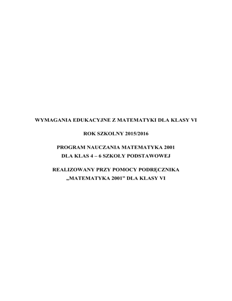 WYMAGANIA EDUKACYJNE Z MATEMATYKI DLA KLASY VI ROK SZKOLNY 2015/2016 PROGRAM NAUCZANIA MATEMATYKA 2001 DLA KLAS 4 – 6 SZKOŁY PODSTAWOWEJ REALIZOWANY PRZY POMOCY PODRĘCZNIKA „MATEMATYKA 2001” DLA KLASY VI I. Ułamki zwykłe i ułamki dziesiętne Ocena Wymagania Uczeń: Rozróżnia liczby pierwsze i liczby złożone. Zna niektóre cechy podzielności liczb (np. przez 2, 5, 10) i potrafi stosować je w praktyce. Rozkłada małe liczby na czynniki pierwsze (do 100). Skraca i rozszerza ułamki dziesiętne. Skraca i rozszerza ułamki zwykłe przez małe liczby (do 5). Porównuje ułamki zwykłe o jednakowych licznikach lub jednakowych Dopuszczający mianownikach. Sprowadza do wspólnego mianownika ułamki o małych mianownikach (do 5). Dodaje i odejmuje ułamki dziesiętne. Dodaje i odejmuje ułamki zwykłe o małych mianownikach (do 5). Mnoży i dzieli ułamki właściwe i niewłaściwe. Mnoży i dzieli ułamki dziesiętne przez 10, 100, 1000... Mnoży i dzieli ułamki dziesiętne przy użyciu kalkulatora. Zamienia ułamki dziesiętne na zwykłe. Uczeń: j. w. Zna cechy podzielności liczb przez 3, 4, 9, 25, 100 i potrafi stosować je w praktyce. Rozkłada liczby na czynniki pierwsze Skraca i rozszerza ułamki zwykłe. Sprowadza ułamki do wspólnego mianownika. Dostateczny Porównuje ułamki zwykłe o różnych licznikach i mianownikach. Dodaje i odejmuje ułamki zwykłe. Mnoży i dzieli liczby mieszane. Mnoży ułamki dziesiętne. Dzieli ułamki dziesiętne przez liczby naturalne. Oblicza wartość wyrażeń arytmetycznych, w których występują dwa działania na ułamkach. Uczeń: j. w. Rozwiązuje różne zadania, stosując poznane cechy podzielności (np. uzupełnia w liczbie brakujące cyfry, podając wszystkie rozwiązania). Rozwiązuje zadania tekstowe na porównywanie różnicowe. Rozwiązuje zadania tekstowe na porównywanie ilorazowe. Oblicza ułamek danej liczby. Dobry Dzieli ułamki dziesiętne. Zamienia ułamki zwykłe na dziesiętne skończone. Porównuje ułamki zwykłe z dziesiętnymi. Zaokrągla przybliżenia dziesiętne do ustalonego rzędu z nadmiarem i niedomiarem. Oblicza wartość wyrażeń arytmetycznych, w których występują trzy działania na ułamkach. Uczeń: Bardzo dobry j. w. Potrafi sam formułować niektóre cechy podzielności (np. przez 6, 15 itp.). Oblicza liczbę według danego jej ułamka. Oblicza, jakim ułamkiem jednej liczby jest druga liczba. Rozwiązuje kilkudziałaniowe zadania z treścią z zastosowaniem działań na ułamkach. Oblicza wartość wyrażeń arytmetycznych, w których występują więcej niż trzy działania na ułamkach. II. Liczby wymierne. Ocena Wymagania Uczeń: Wyraża temperaturę, dług, depresję za pomocą liczb ujemnych. Zna położenie liczb ujemnych na osi liczbowej. Zaznacza liczby ujemne na osi liczbowej. Dopuszczający Posługuje się pojęciami: liczby przeciwne. Potrafi porównać liczbę dodatnią z liczbą ujemną i liczbę ujemną z zerem. Dodaje i odejmuje liczby całkowite o różnych i jednakowych znakach. Mnoży i dzieli liczby całkowite o różnych i jednakowych znakach. Uczeń: j. w. Potrafi porównać liczby ujemne. Dodaje i odejmuje liczby wymierne o różnych i jednakowych znakach. Mnoży i dzieli liczby wymierne o różnych i jednakowych znakach. Dostateczny Zna kolejność wykonywania działań. Oblicza wartość liczbową wyrażeń arytmetycznych, w których występują dwa działania. Rozwiązuje proste zadania tekstowe prowadzące do obliczeń na liczbach całkowitych. Uczeń: j. w. Potrafi uporządkować malejąco lub rosnąco liczby wymierne. Wyróżnia podzbiory zbioru liczb wymiernych Dobry Oblicza wartość liczbową wyrażeń arytmetycznych, w których występują trzy działania. Oblicza niewiadomą liczbę w działaniu. Rozwiązuje zadania tekstowe prowadzące do obliczeń na liczbach całkowitych. Uczeń: j. w. Zna definicję liczby wymiernej. Oblicza wartość liczbową wyrażeń arytmetycznych, w których występują Bardzo dobry co najmniej trzy działania. Oblicza niewiadomą liczbę w równaniu, w którym występują dwa lub trzy działania. Rozwiązuje zadania z treścią. Rozwiązuje proste równania na liczbach całkowitych. III. Podstawowe konstrukcje geometryczne. Ocena Wymagania Uczeń: Formułuje dane twierdzenia w postaci zdań warunkowych. Porównuje długości odcinków za pomocą cyrkla. Dopuszczający Kreśli odcinek przystający do danego odcinka. Dzieli odcinek na połowy. Zna sumę miar kątów wewnętrznych trójkąta. Dzieli kąt na połowy. Uczeń: j. w. Kreśli odcinek równy sumie i różnicy dwóch odcinków. Zna pojęcie symetralnej odcinka. Konstruuje symetralną odcinka. Dostateczny Kreśli kąt przystający do danego kąta. Kreśli kąt równy sumie i różnicy dwóch kątów. Zna sumę miar kątów wewnętrznych czworokąta. Zna pojęcie dwusiecznej kąta. Konstruuje dwusieczną kąta. Uczeń: j. w. Konstruuje prostą prostopadłą do danej prostej, przechodzącą przez dany punkt. Kreśli odcinek otrzymany w wyniku dodawania i odejmowania kilku odcinków (także wielokrotności). Podaje opis wykonanej konstrukcji. Zna własności symetralnej odcinka. Dobry Kreśli kąt otrzymany w wyniku dodawania i odejmowania kilku kątów (także wielokrotności). Oblicza sumę miar kątów wewnętrznych w dowolnym wielokącie. Rozwiązuje zadania o kątach wielokąta. Zna własności dwusiecznej kąta. Konstruuje kąty o miarach: 90˚, 60˚, 45˚, 30˚, 120˚. Konstruuje prostą równoległą do danej prostej, przechodzącą przez dany punkt. Uczeń: j. w. Uzasadnia poprawność konstrukcji. Bardzo dobry Podaje wszystkie rozwiązania. Konstruuje kąty o miarach: 135˚, 105˚, 195˚ itp. Konstruuje wielokąty, spełniające podane warunki. IV. Równania i nierówności, wyrażenia algebraiczne. Ocena Dopuszczający Wymagania Uczeń: Zapisuje i odczytuje proste wyrażenia algebraiczne (jedno działanie). Dostateczny Dobry Przedstawia treść zadań w postaci prosty