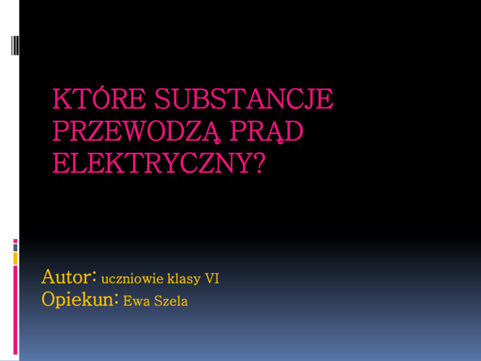 KTÓRE SUBSTANCJE PRZEWODZĄ PRĄD ELEKTRYCZNY? Autor: uczniowie klasy VI Opiekun: Ewa Szela Potrzebne materiały: bateria, żarówka, przewody elektryczne, folia aluminiowa, zapałka, szklana płytka, plastikowa zakrętka od napoju, kawałek papieru, moneta 5-złotowa. Przebieg doświadczenia: dotknij przewodami dwóch punktów kolejnych przedmiotów: folii aluminiowej, zapałki, szklanej płytki, plastikowej zakrętki od napoju, kawałka papieru, monety 5-złotowej. Obserwacje: zaobserwuj, w których przypadkach żarówka świeciła, a w których nie. Obserwacje i wnioski Żarówka nie świeci się. Papier, drewno, szkło i plastik nie przewodzą prądu elektrycznego. Substancje, które nie przewodzą prądu, nazywamy izolatorami. Obserwacje i wnioski Żarówka świeci. Folia aluminiowa i moneta przewodzą prąd elektryczny. Substancje, przez które swobodnie przepływają elektrony, to przewodniki elektryczne.