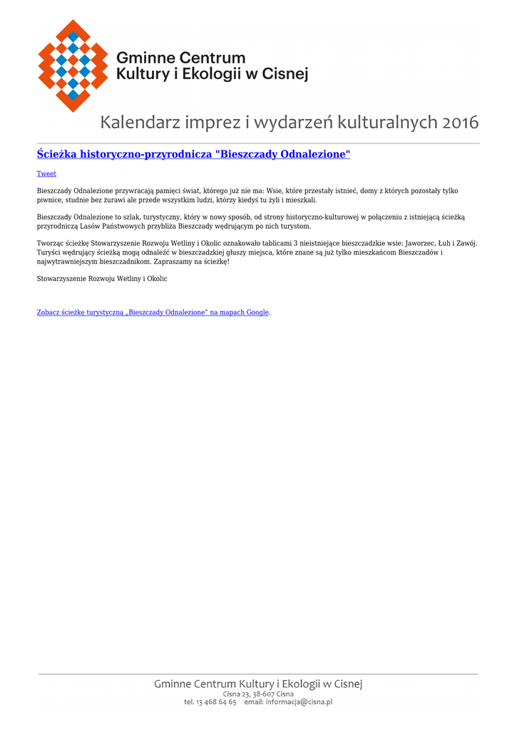 Ścieżka historyczno-przyrodnicza "Bieszczady Odnalezione" Tweet Bieszczady Odnalezione przywracają pamięci świat, którego już nie ma: Wsie, które przestały istnieć, domy z których pozostały tylko piwnice, studnie bez żurawi ale przede wszystkim ludzi, którzy kiedyś tu żyli i mieszkali. Bieszczady Odnalezione to szlak, turystyczny, który w nowy sposób, od strony historyczno-kulturowej w połączeniu z istniejącą ścieżką przyrodniczą Lasów Państwowych przybliża Bieszczady wędrującym po nich turystom. Tworząc ścieżkę Stowarzyszenie Rozwoju Wetliny i Okolic oznakowało tablicami 3 nieistniejące bieszczadzkie wsie: Jaworzec, Łuh i Zawój. Turyści wędrujący ścieżką mogą odnaleźć w bieszczadzkiej głuszy miejsca, które znane są już tylko mieszkańcom Bieszczadów i najwytrawniejszym bieszczadnikom. Zapraszamy na ścieżkę! Stowarzyszenie Rozwoju Wetliny i Okolic Zobacz ścieżkę turystyczną „Bieszczady Odnalezione” na mapach Google.
