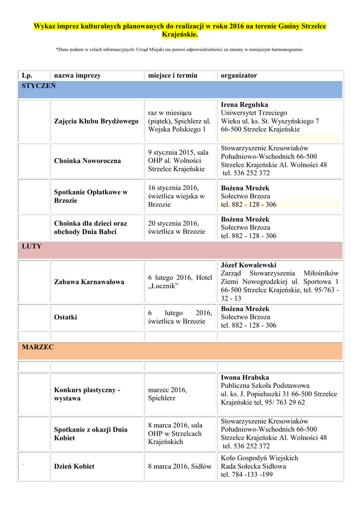 Wykaz imprez kulturalnych planowanych do realizacji w roku 2016