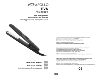 EVA PRE-30-BOR Hair straightener Prostownica do włosów Инструкция по обслуживанию This product meets all the requirements and provisions of the applicable European Union directives. Declaration of Conformity (DoC) is available on the www.apollo.eu Detailed warranty information can be found in the warranty card. The information contained in this document is subject to change without notice. Apollo Electronics reserves the right to calculation mistakes and printing errors. Copyright © Apollo Electronics. All rights reserved. Any reproduction, reprint, adaptation or translation without permission is prohibited Niniejszy produkt spełnia wszystkie wymogi i przepisy obowiązujących dyrektyw Unii Europejskiej. Deklaracja zgodności (DoC) jest dostępna na stronie www.apollo.eu Szczegółowe informacje gwarancyjne znajdują się w karcie gwarancyjnej. Informacje znajdujące się w tym dokumencie mogą ulec zmianie bez powiadomienia. Apollo Electronics zastrzega sobie prawo do pomyłek i błędów w druku. Copyright © Apollo Electronics. Wszystkie prawa zastrzeżone. Jakakolwiek reprodukcja, przedruk, adaptacja lub tłumaczenie bez uprzedniego zezwolenia jest zabronione Instruction Manual 3 Instrukcja obsługi 7 Инструкция обслуживания 13 Данный продукт соответствует всем требования и положениям директив Европейского союза. С Декларацией соответствия (DoC) можно ознакомится по адресу www.apollo.eu Подробную информацию о гарантии можно найти в гарантийном талоне. Информация, содержащаяся в данном документе, может быть изменена без предварительного уведомления. Apollo Electronics оставляет за собой право на опечатки и ошибки в текстах. Авторское право © Apollo Electronics. Все права защищены. Любое копирование, перепечатка, адаптация или перевод без предварительного разрешения запрещено. 2 ENG ENG TABLE OF CONTENTS GENERAL SAFETY INSTRUCTIONS GENERAL SAFETY INSTRUCTIONS .............................................................................................4 EVA HAIR STRAIGHTENER DESIGN DESCRIPTION ...................................................................5 SPECIFICATIONS ..........................................................................................................................5 INTRODUCTORY REMARKS .........................................................................................................5 USE OF ARIANNNA HAIR STRAIGHTENER..................................................................................6 CLEANING AND MAINTENANCE ...................................................................................................6 • • • • • • • • • • • • • • • THANK YOU! • Thank you for purchasing Apollo product. We hope that the quality and functionality of the appliance will meet your expectations. In order to provide answers to any questions which might arise when using the appliance we ask you to read the below User’s Manual. Instruction manual is an integral part of the hair straightener Eva. Carefully read and follow the below manual before use. Get acquaintance with the technical data, available in the chapter Technical Data or on the control panel, prior to connect the appliance to the source of electrical power. Connect the appliance in accordance with that requirements. The appliance should be disconnected from the source of electrical power when not in use and before exchange of accessories or cleaning the appliance. Always unplug the appliance when not in use or for the purpose of accessory change or cleaning. Always unplug the appliance by pulling the plug and not the power cord. Never leave home / room while the appliance is in use, to avoid the risk of fire. After use, please do not wind up the supply cord around the housing of dryer as this could damage the connecting cable insulation. Exercise particular caution when children are around. Make sure that the place where the appliance is kept is appropriately secured from access of unauthorized persons. Be sure, that the appliance place is properly protected from undesirable people access. Never leave the powered appliance unattended due to the risk of fire. Before use check if the appliance is not damaged. Particular attention must be paid to the power cord. Should any component, including the power cord, be damaged the appliance must not be used. Do not expose the appliance to direct sunlight, hot surfaces, moisture, sharp edges etc. Never attempt any repairs of the appliance as the improper re-assembly may lead to injuries or even death. Any repairs must be performed by a Central Service (more information see the Warranty Card). NEVER USE the appliance in a manner inconsistent with the intended use and this Manual. The appliance is intended for indoor use only. NEVER immerse the appliance in water or any other solution. In order to clean the appliance follow the guidelines given in the Cleaning section. The appliance is designed only for a home use. Never submerge the appliance in the water or any other liquid. The appliance should be cleaned in accordance with the chapter - cleaning. This appliance can be use by children over 8 years of age and persons with reduced physical, sensory or mental capabilities, or lack of experience and knowledge, if operation is performed supervised in accordance with the instruction for use of equipment and understand the risk. Cleaning appliance should not be performed by children should be supervised to ensure that they do not play with the appliance. The 