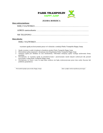 PARK TRAMPOLIN HAPPY JUMP ZGODA RODZICA Dane rodzica/opiekuna: IMIĘ I NAZWISKO:............................................................................................................................ ADRES zamieszkania: ........................................................................................................................ NR TELEFONU:.................................................................................................................................... Dane dziecka: IMIĘ i NAZWISKO:....................................................................................................................... wyrażam zgodę na korzystanie przez w/w dziecko z atrakcji Parku Trampolin Happy Jump. 1. 2. 3. 4. 5. Zgodę wyrażam w pełni świadomy/a charakteru atrakcji Parku Trampolin Happy Jump. Potwierdzam pełną znajomość i akceptację treści Regulaminu Parku Trampolin Happy Jump. Niniejsza zgoda jest składana na czas nieokreślony. Odwołanie niniejszej zgody wymaga zachowania formy pisemnej. Oświadczam, że wyrażam zgodę na przechowywanie i przetwarzanie moich danych osobowych dla potrzeb korzystania z usług Parku Trampolin Happy Jump. Oświadczam, że wiem o tym, że moje dane osobowe nie będą wykorzystywane przez inne osoby fizyczne lub podmioty gospodarcze. ..................................... Potwierdził (podpis pracownika Happy Jump) ................................... (data i podpis rodzica/opiekuna prawnego)